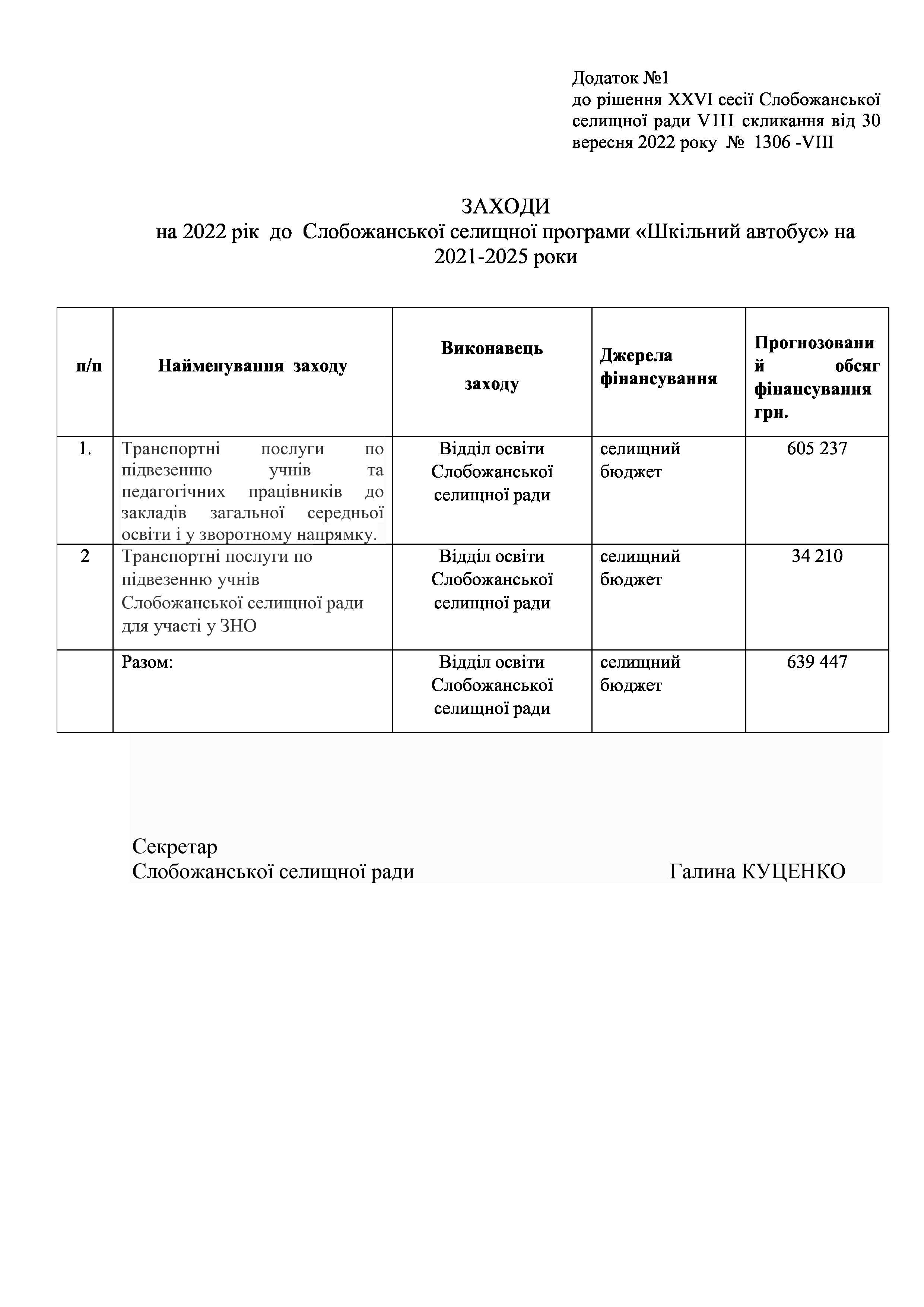 Рішення сесії №1306-VIII Про внесення змін до Заходів на 2022 рік до Слобожанської селищної програми «Шкільний автобус» на 2021-2025 роки.