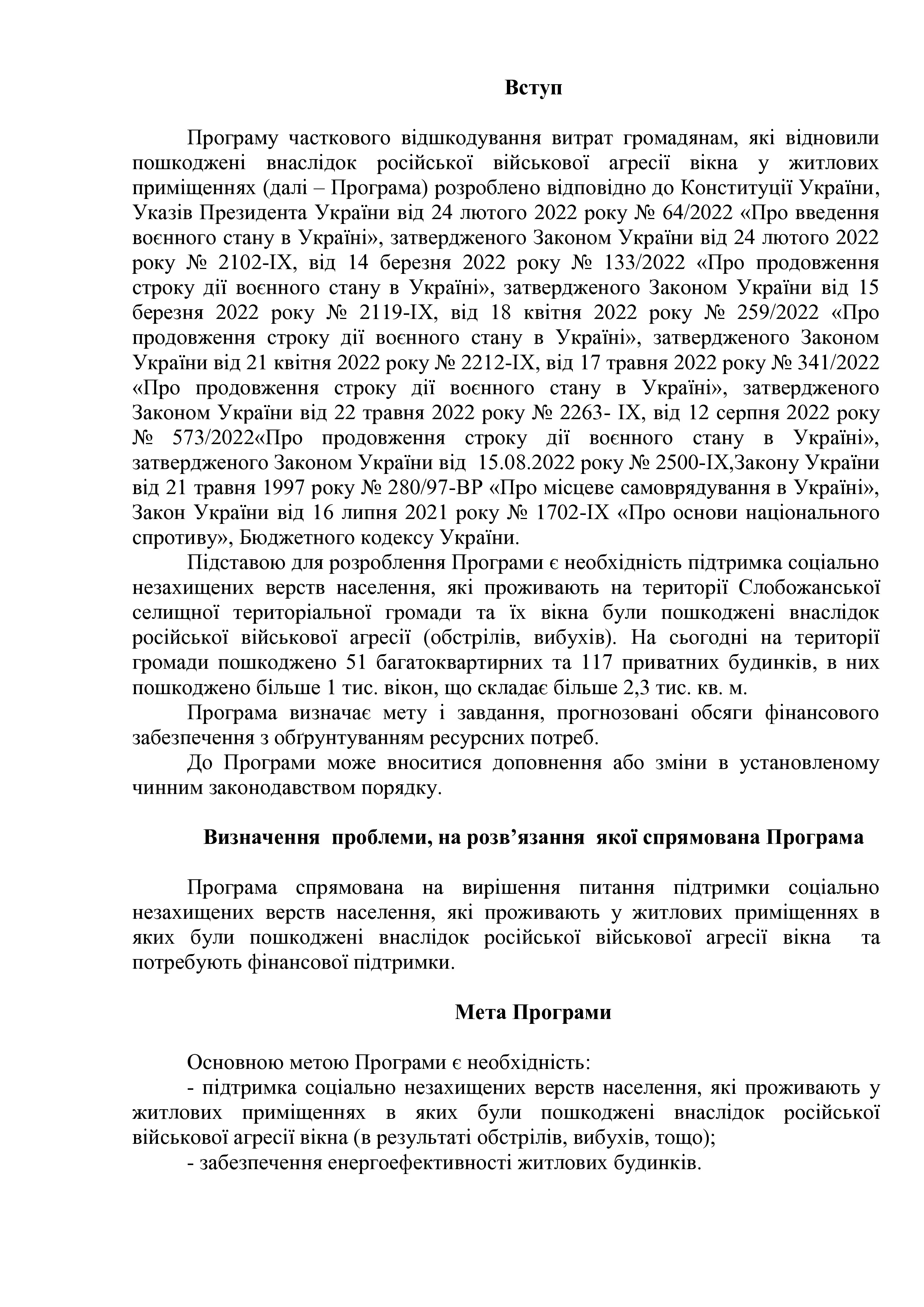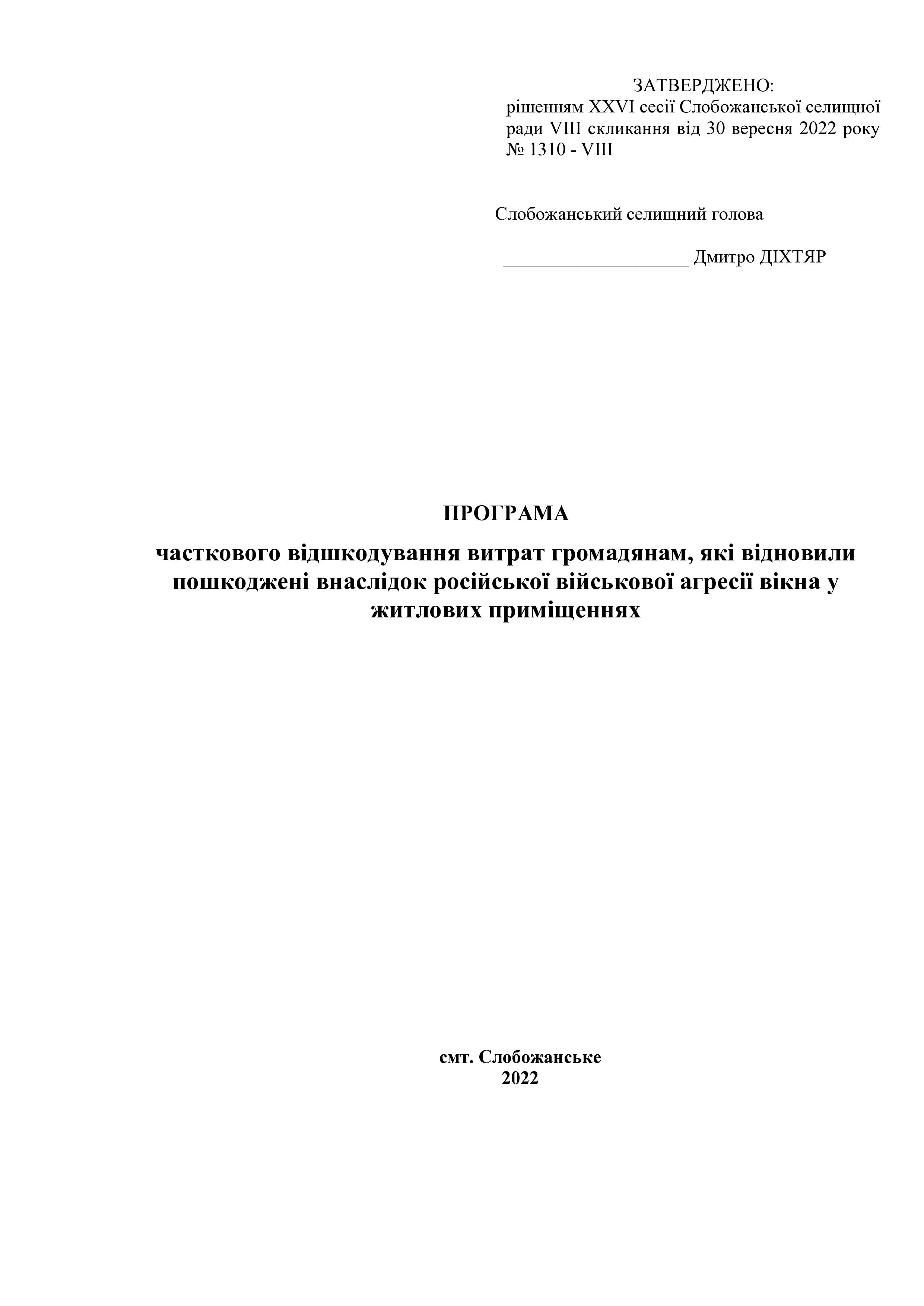 Рішення сесії №1310-VIII Про затвердження Програми часткового відшкодування витрат громадянам, які відновили пошкоджені внаслідок російської військової агресії вікна у житлових приміщеннях.