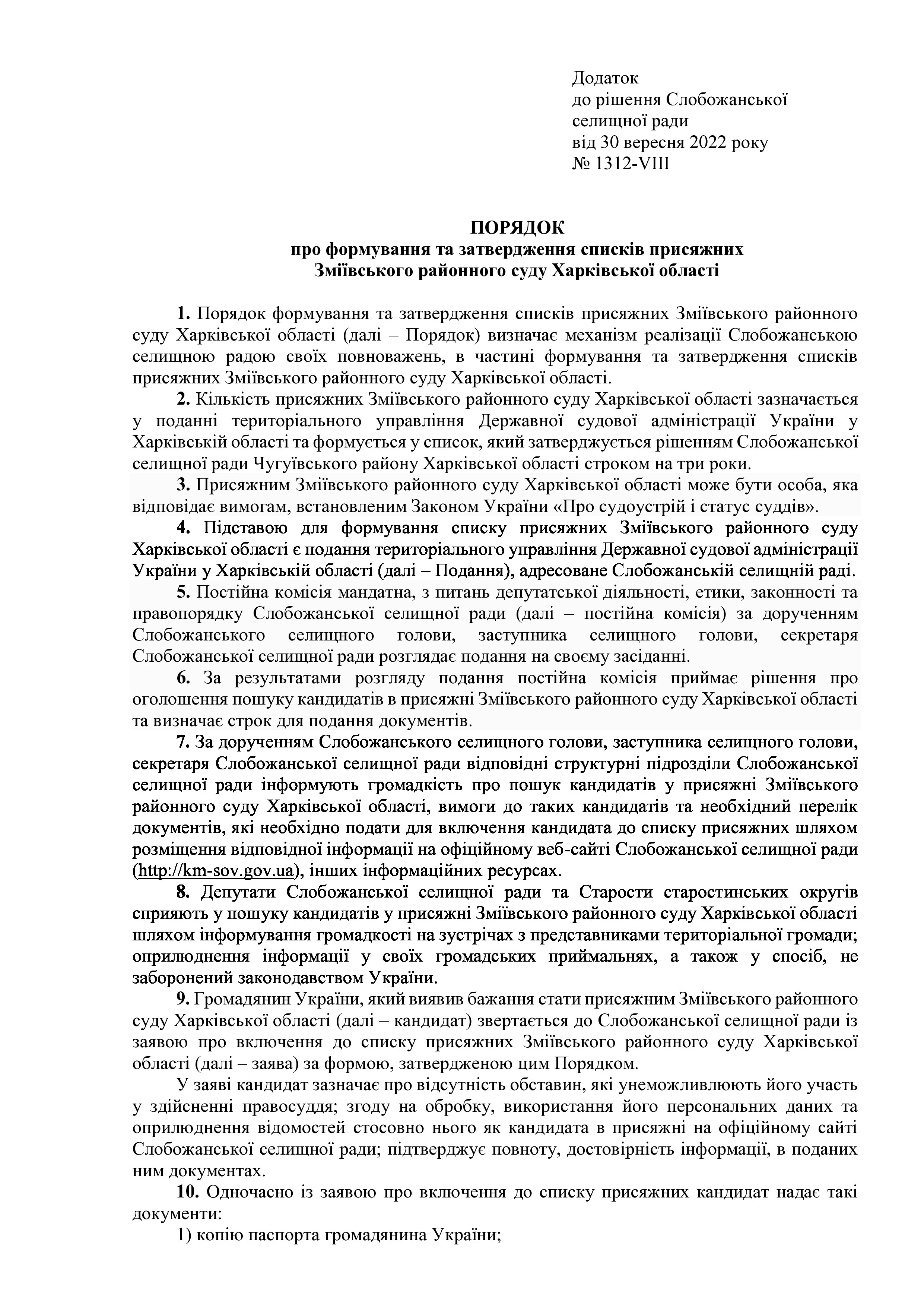 Рішення сесії №1312-VIII Про затвердження Порядку формування та затвердження списків присяжних Зміївського районного суду Харківської області.
