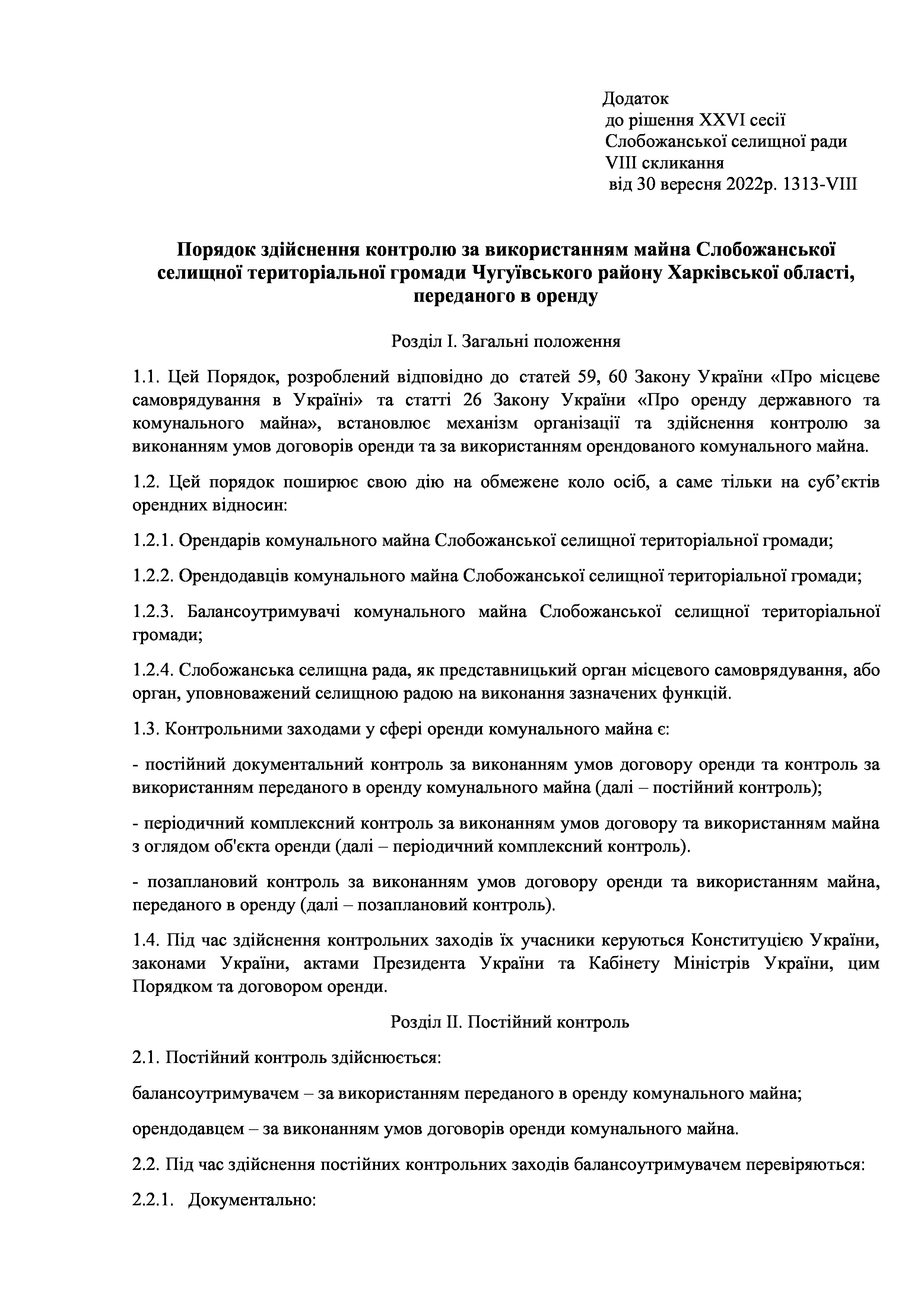 Рішення сесії №1313-VIII Про затвердження Порядку здійснення контролю за використанням майна, Слобожанської селищної територіальної громади Чугуївського району Харківської області, переданого в оренду.