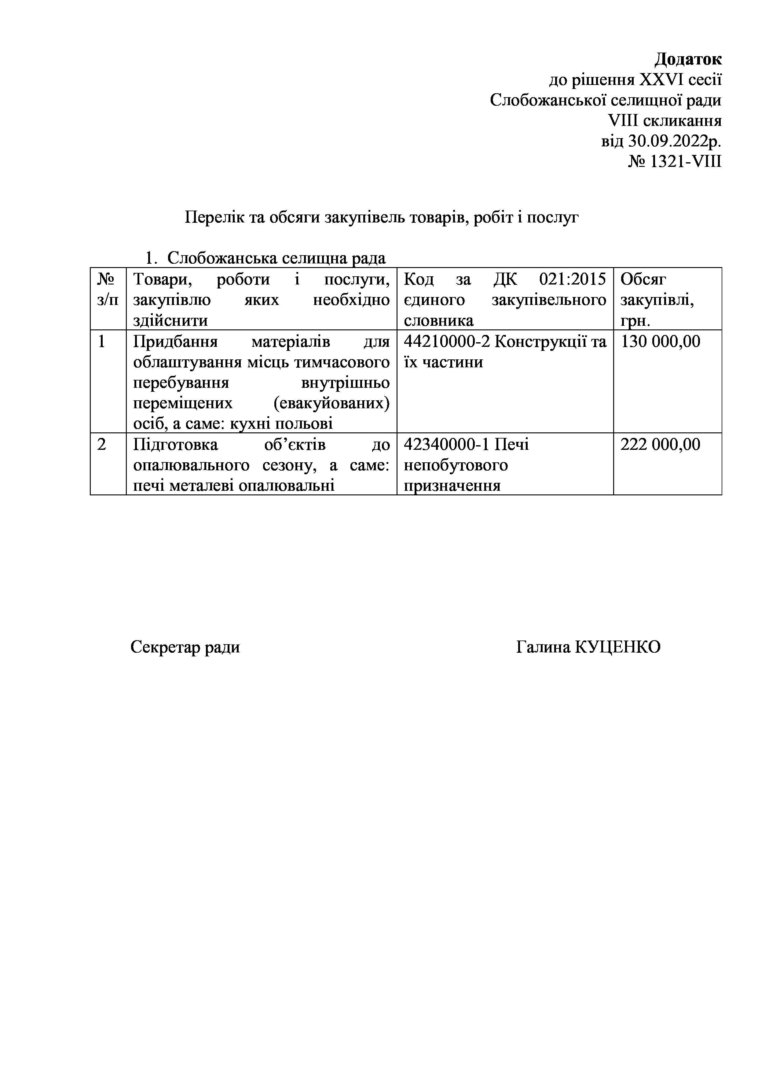 Рішення сесії №1321-VIII Про визначення переліку та обсягів закупівель товарів, робіт і послуг, що необхідно здійснити для забезпечення потреб.