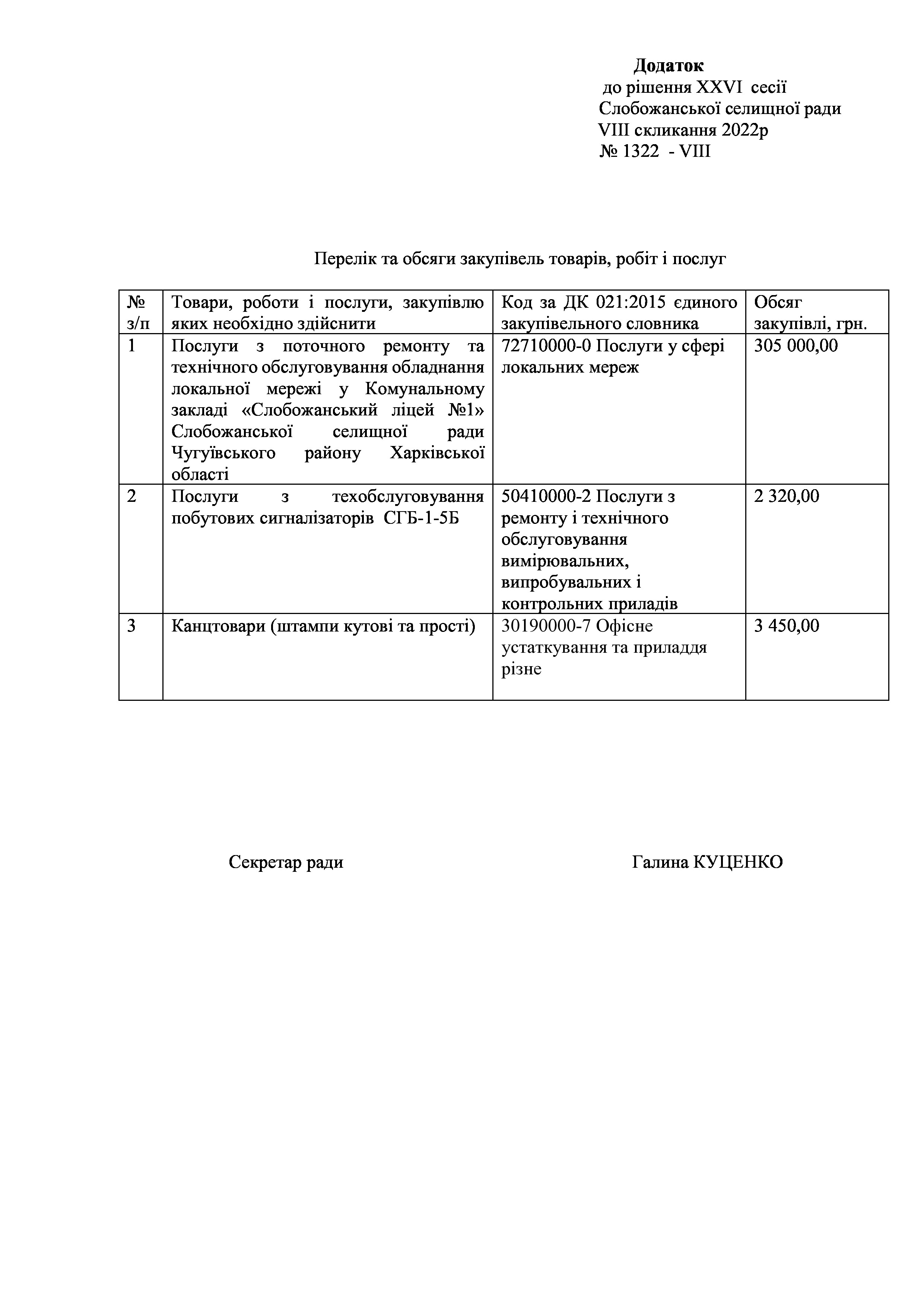 Рішення сесії №1322-VIII Про визначення переліку та обсягів закупівель товарів, робіт і послуг, що необхідно здійснити для забезпечення потреб відділу освіти Слобожанської селищної ради.