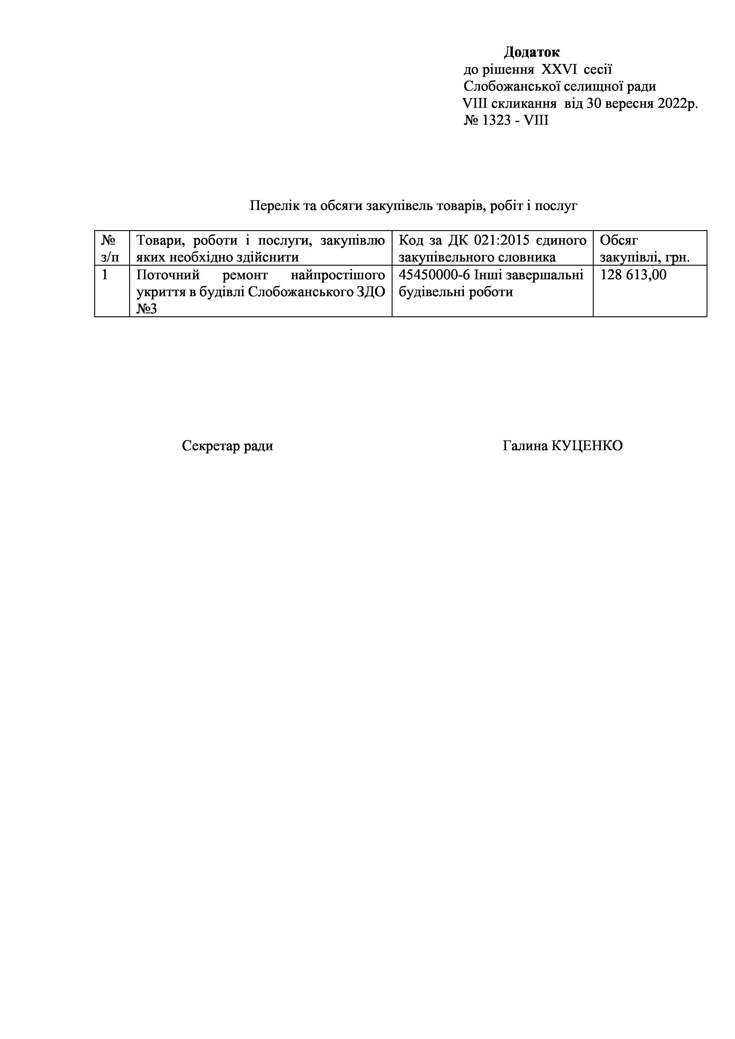 Рішення сесії №1323-VIII Про визначення переліку та обсягів закупівель товарів, робіт і послуг, що необхідно здійснити для забезпечення потреб Слобожанського комунального закладу дошкільної освіти (ясла садок) №3.