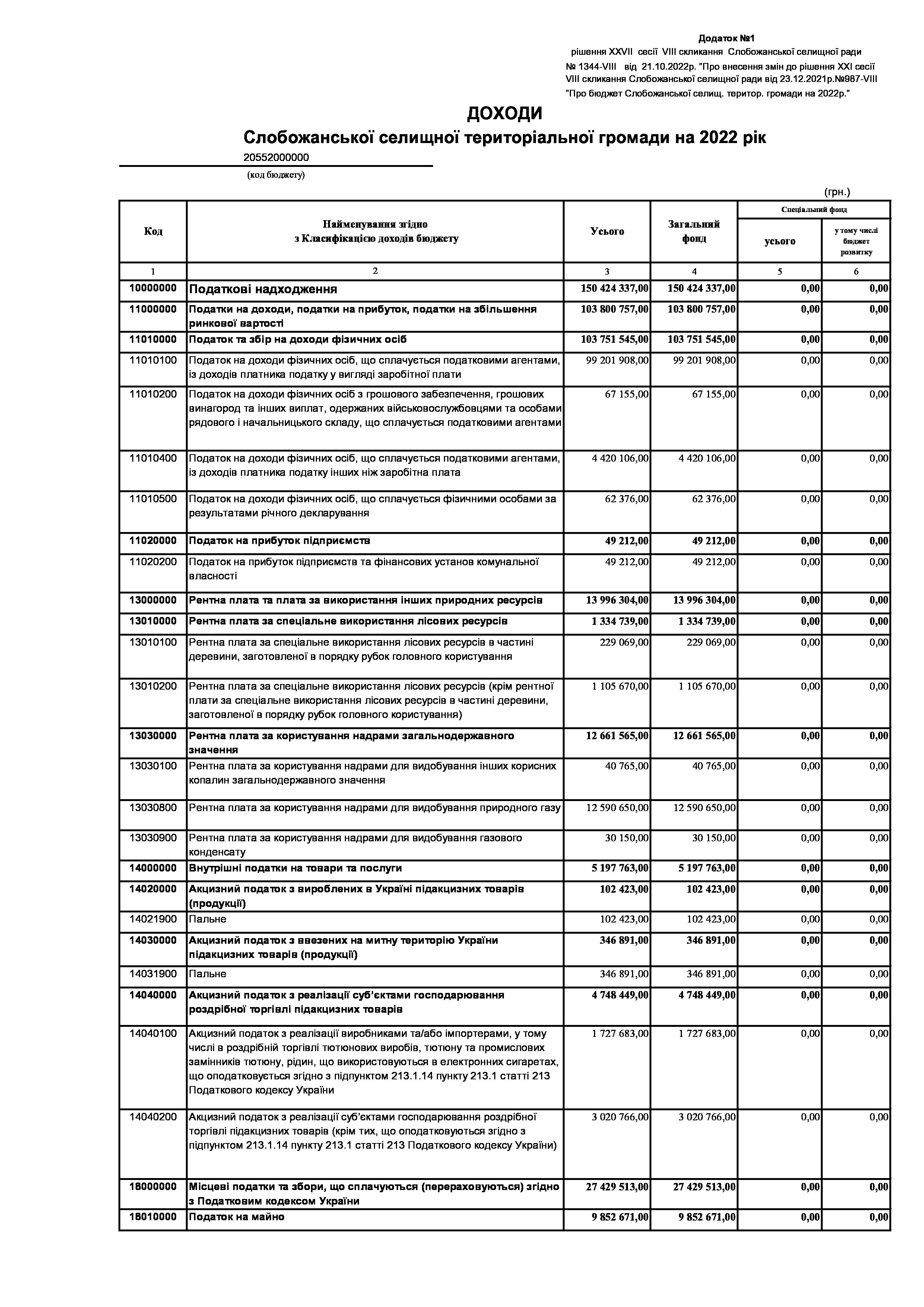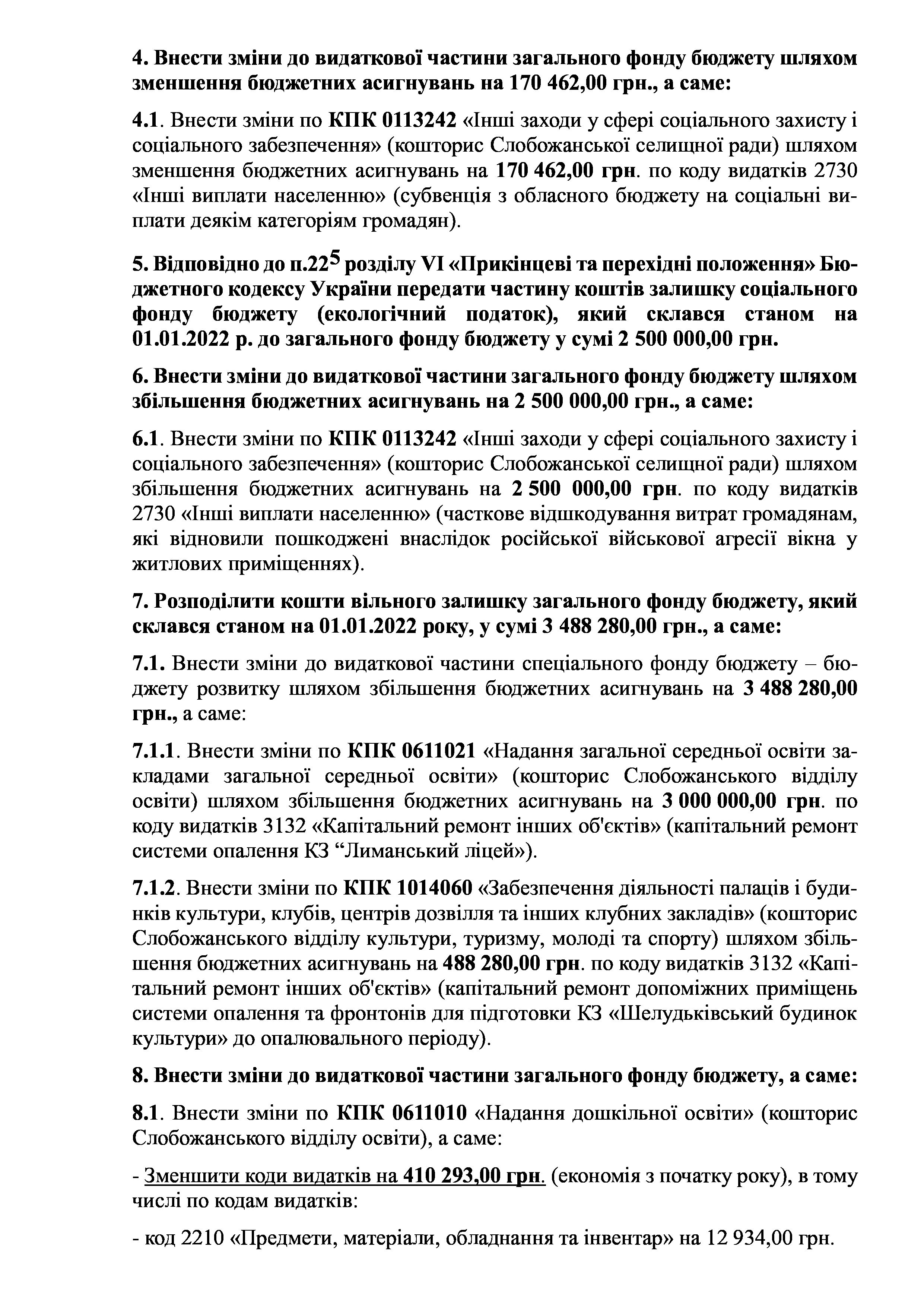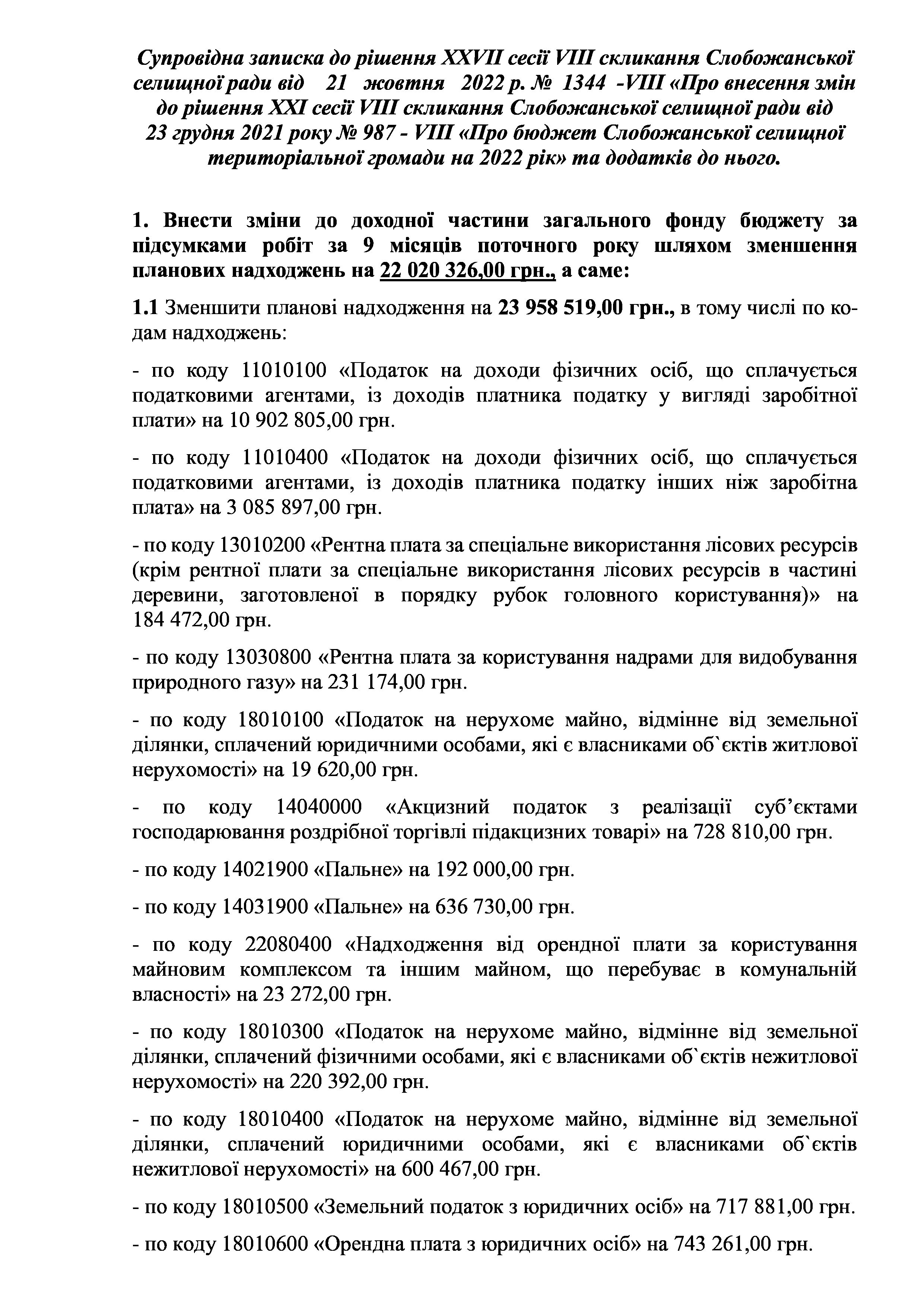 Рішення сесії №1344-VIII Про внесення змін до рішення ХХІ сесії VIІI скликання Слобожанської селищної ради від 23 грудня 2021 року №987-VIІI «Про бюджет Слобожанської селищної територіальної громади на 2022 рік».