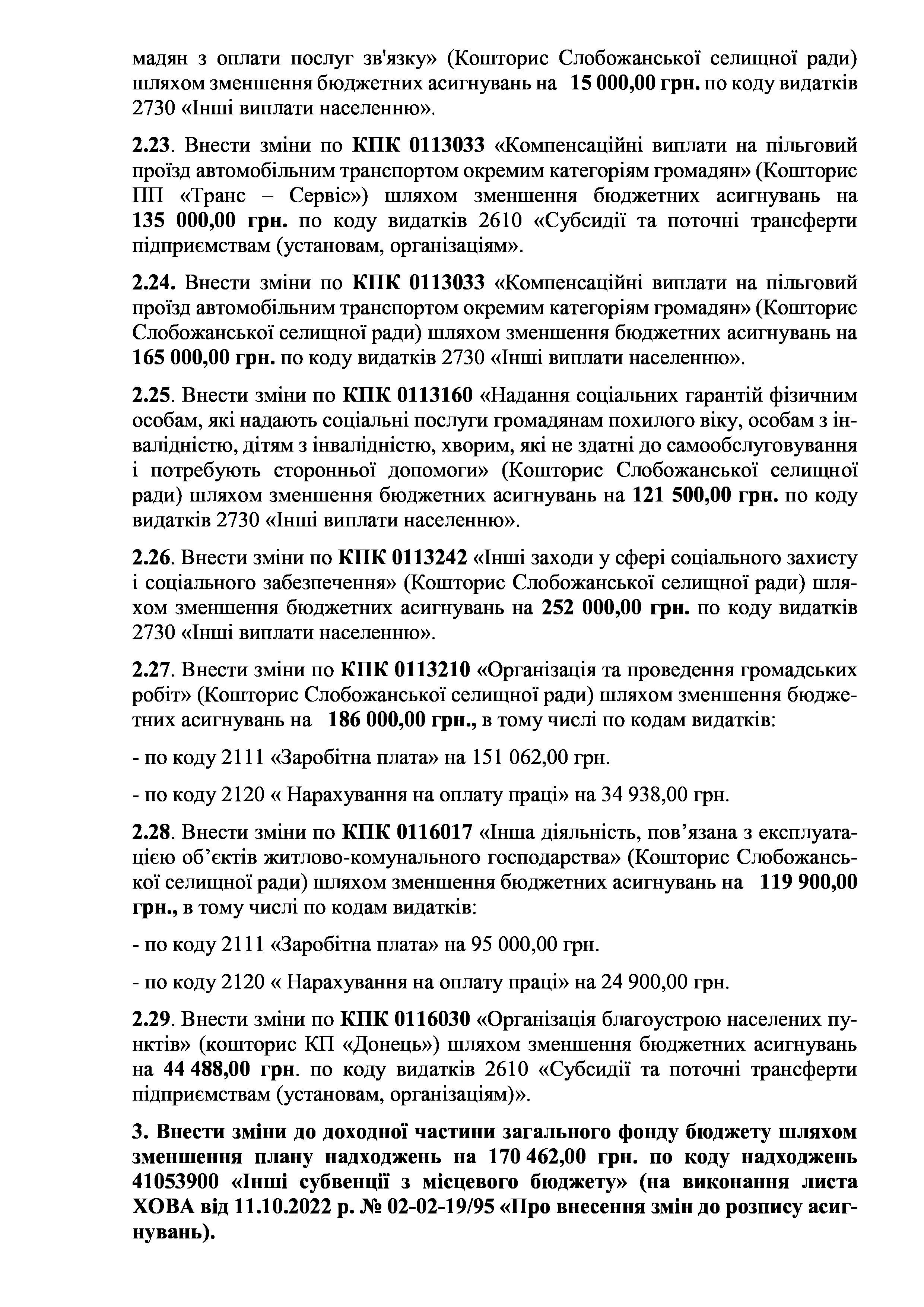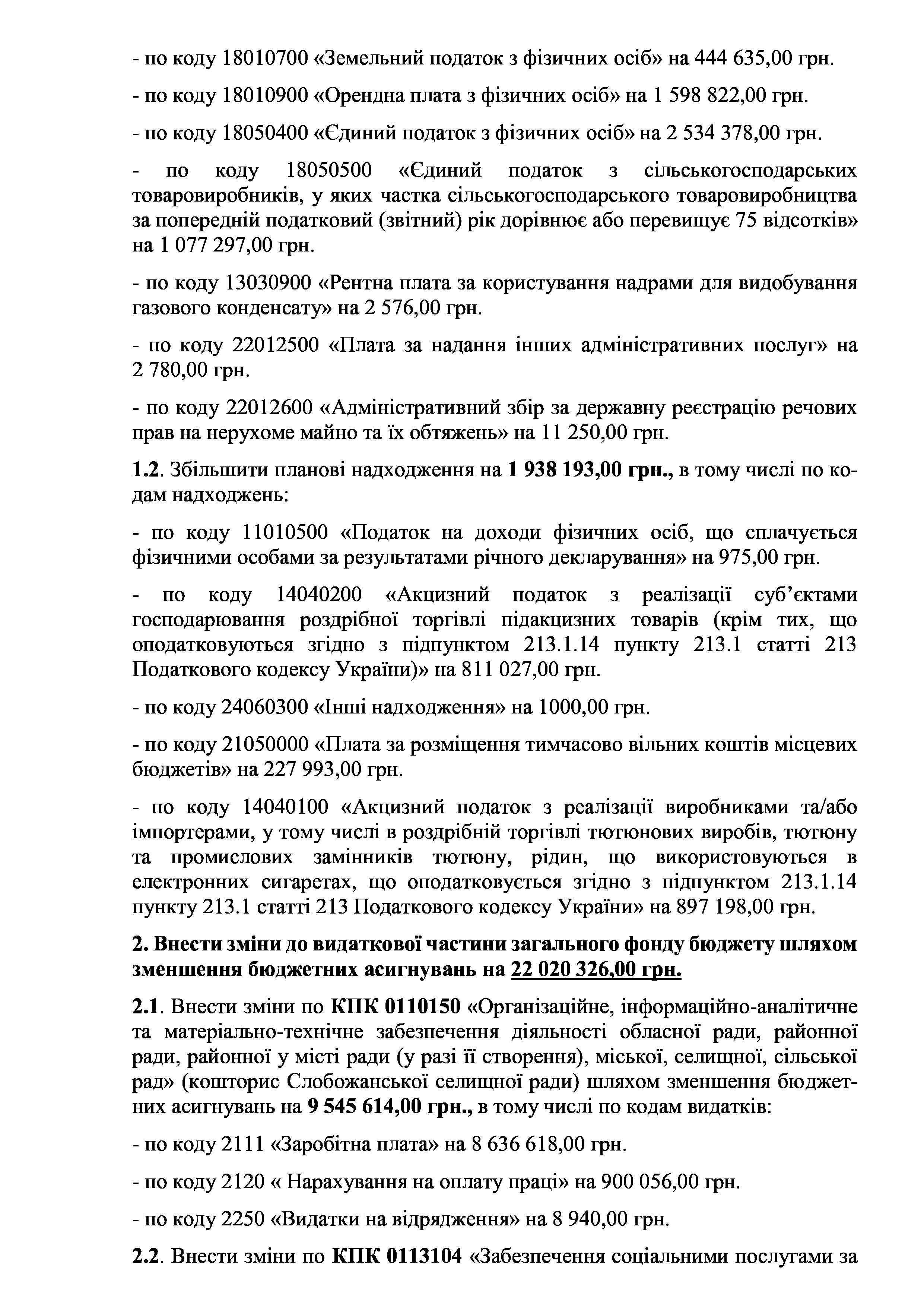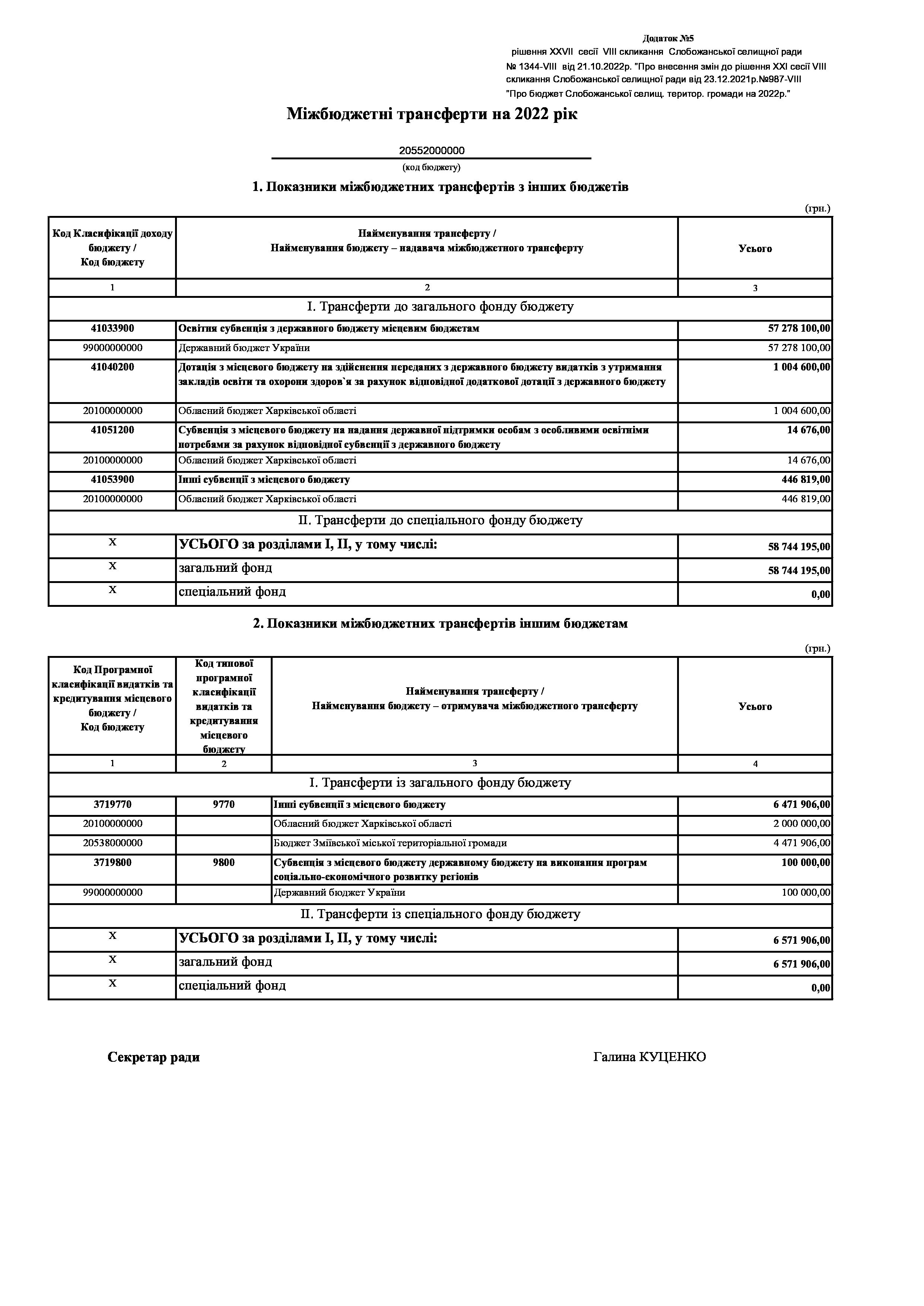 Рішення сесії №1344-VIII Про внесення змін до рішення ХХІ сесії VIІI скликання Слобожанської селищної ради від 23 грудня 2021 року №987-VIІI «Про бюджет Слобожанської селищної територіальної громади на 2022 рік».