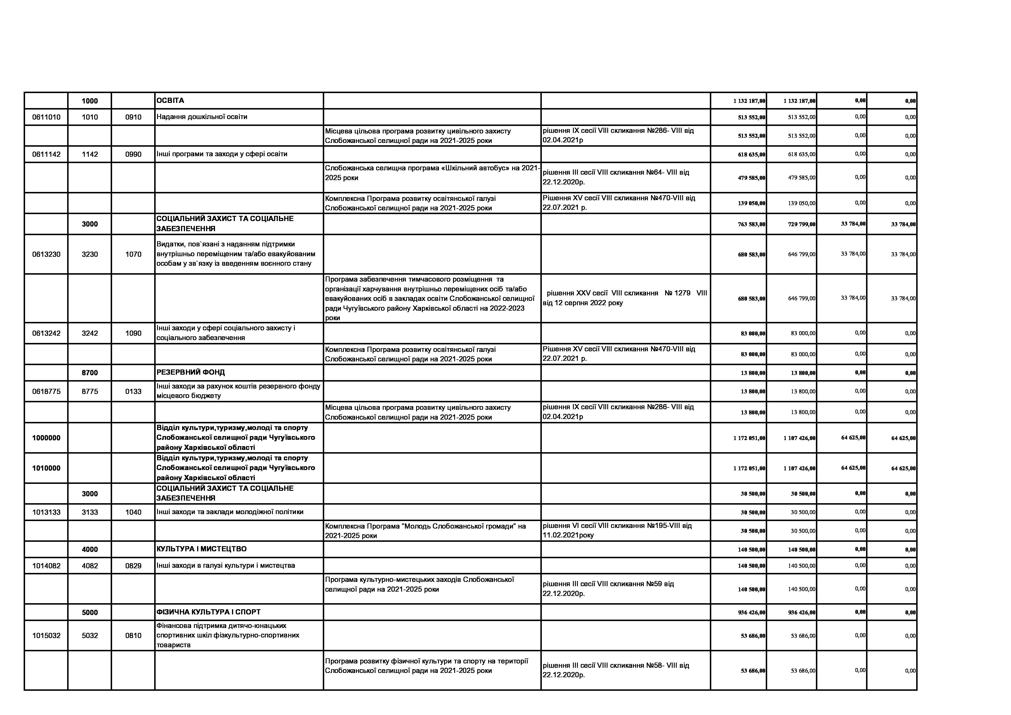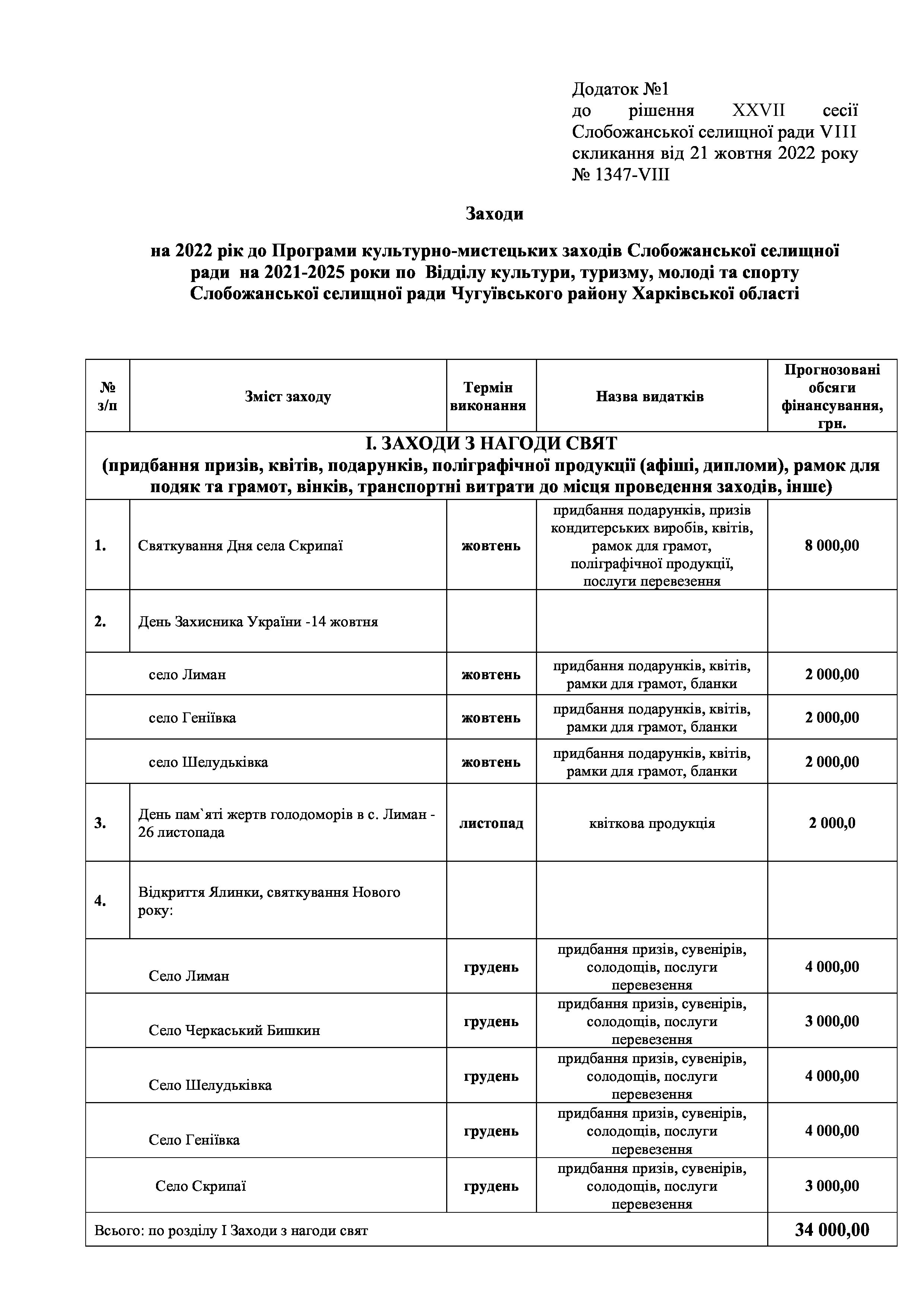 Рішення сесії №1347-VIII Про внесення змін до Заходів на 2022 рік до Програми культурно – мистецьких заходів Слобожанської селищної ради на 2021 -2025 роки.
