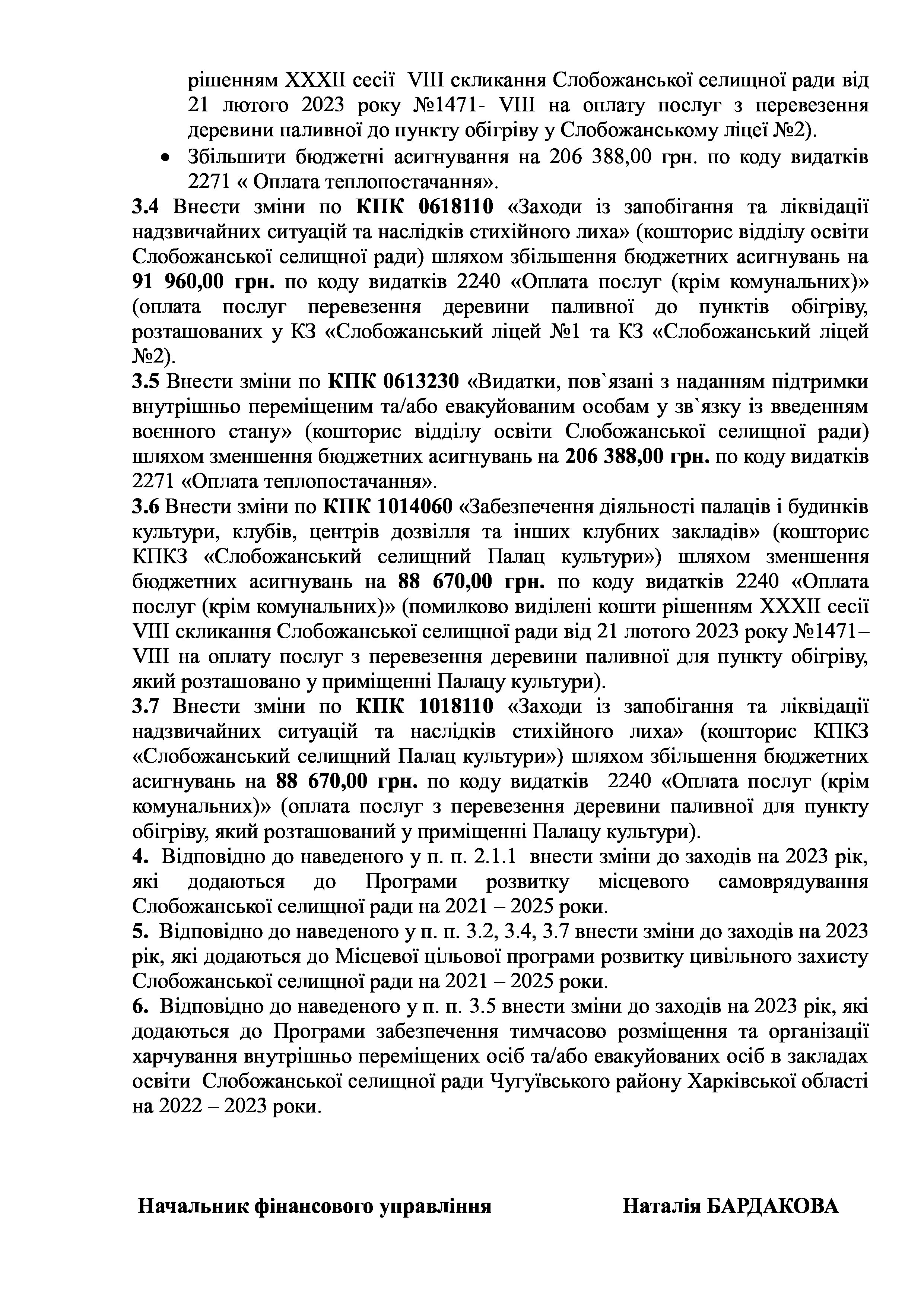 Рішення сесії №1503-VIII Про внесення змін до Заходів на 2023 рік до Програми забезпечення тимчасового розміщення та організації харчування внутрішньо переміщених осіб та/або евакуйованих осіб, які перемістилися на територію Слобожанської селищної територіальної громади після 24.02.2022 р., в закладах освіти Слобожанської селищної ради Чугуївського району Харківської області на 2022 – 2023 роки.