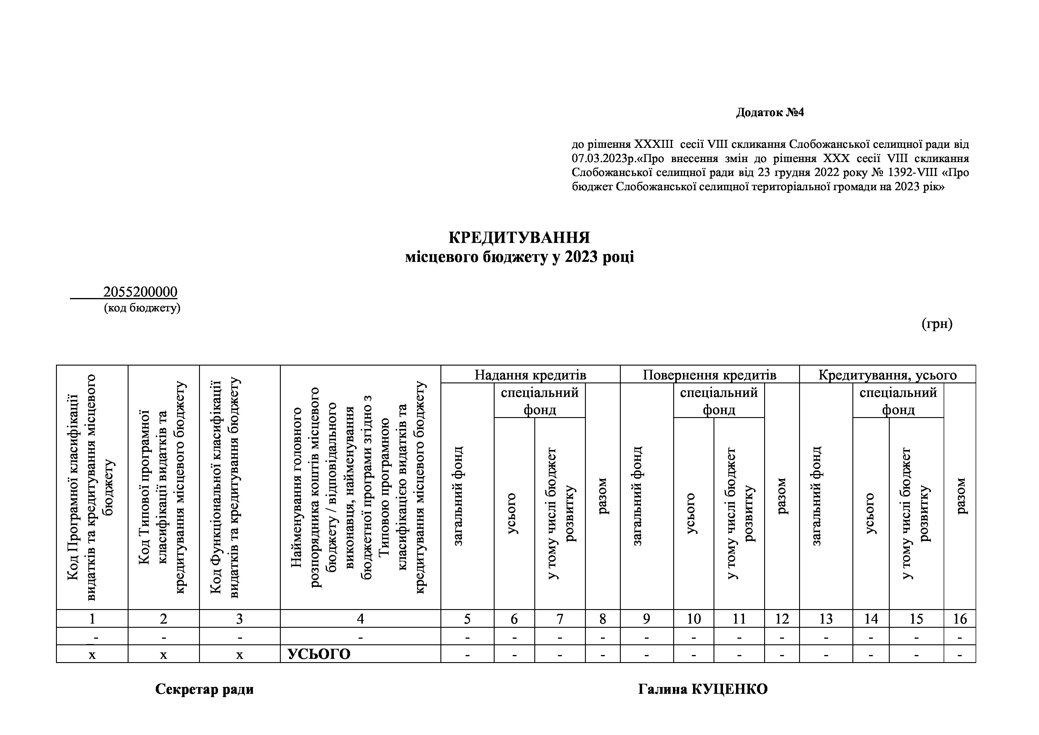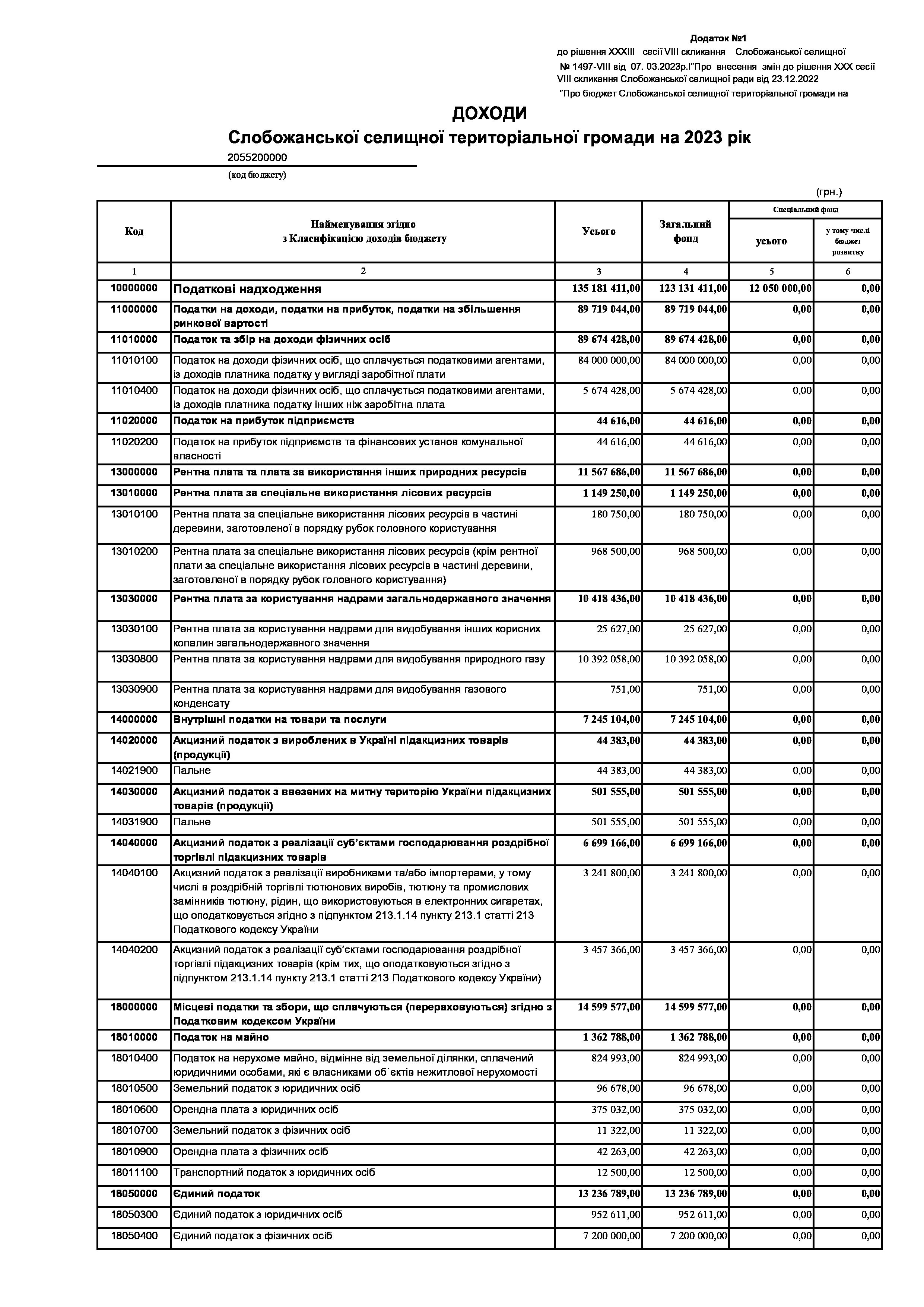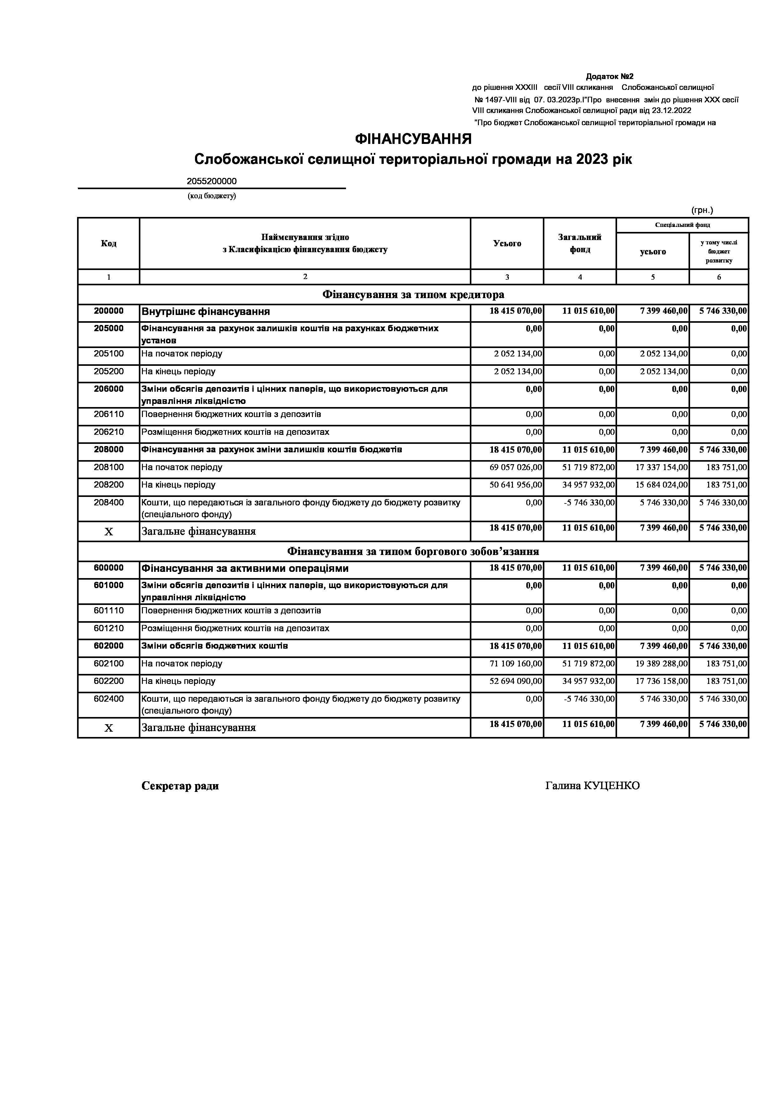 Рішення сесії №1497-VIII Про внесення змін до рішення ХХХ сесії VIІI скликання Слобожанської селищної ради від 23 грудня 2022 року №1392-VIІI «Про бюджет Слобожанської селищної територіальної громади на 2023 рік».