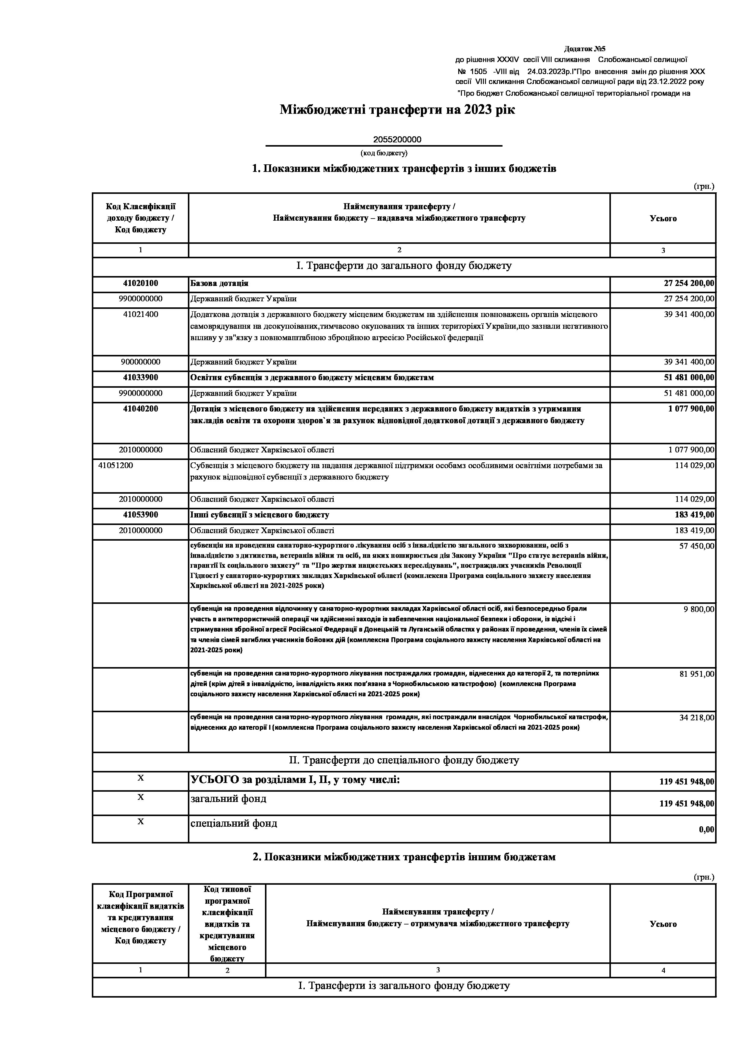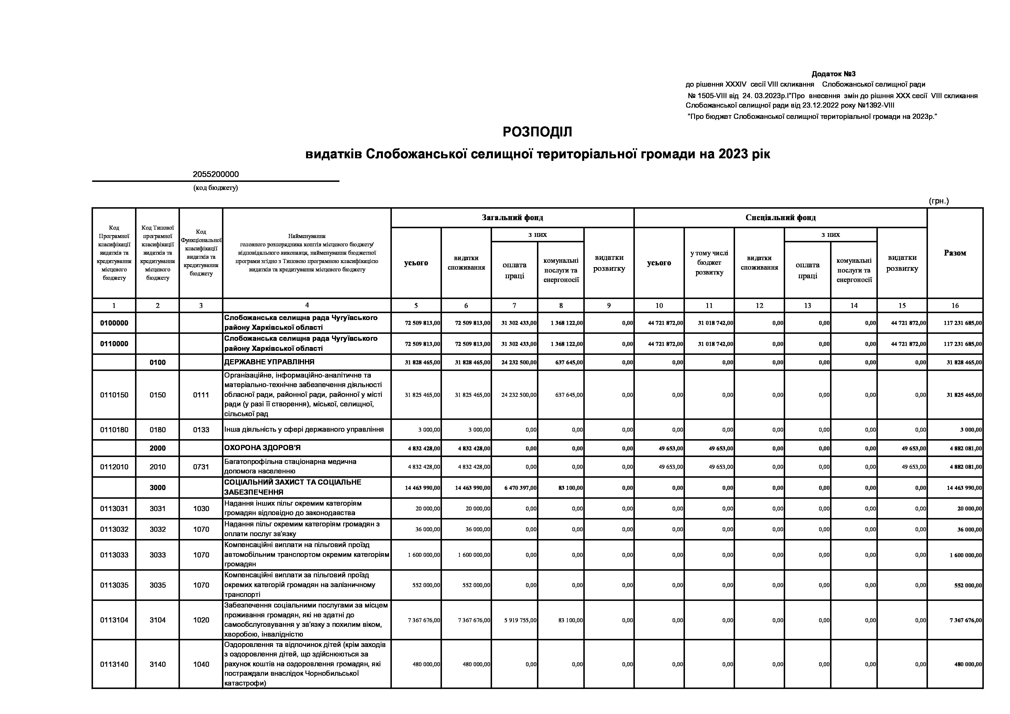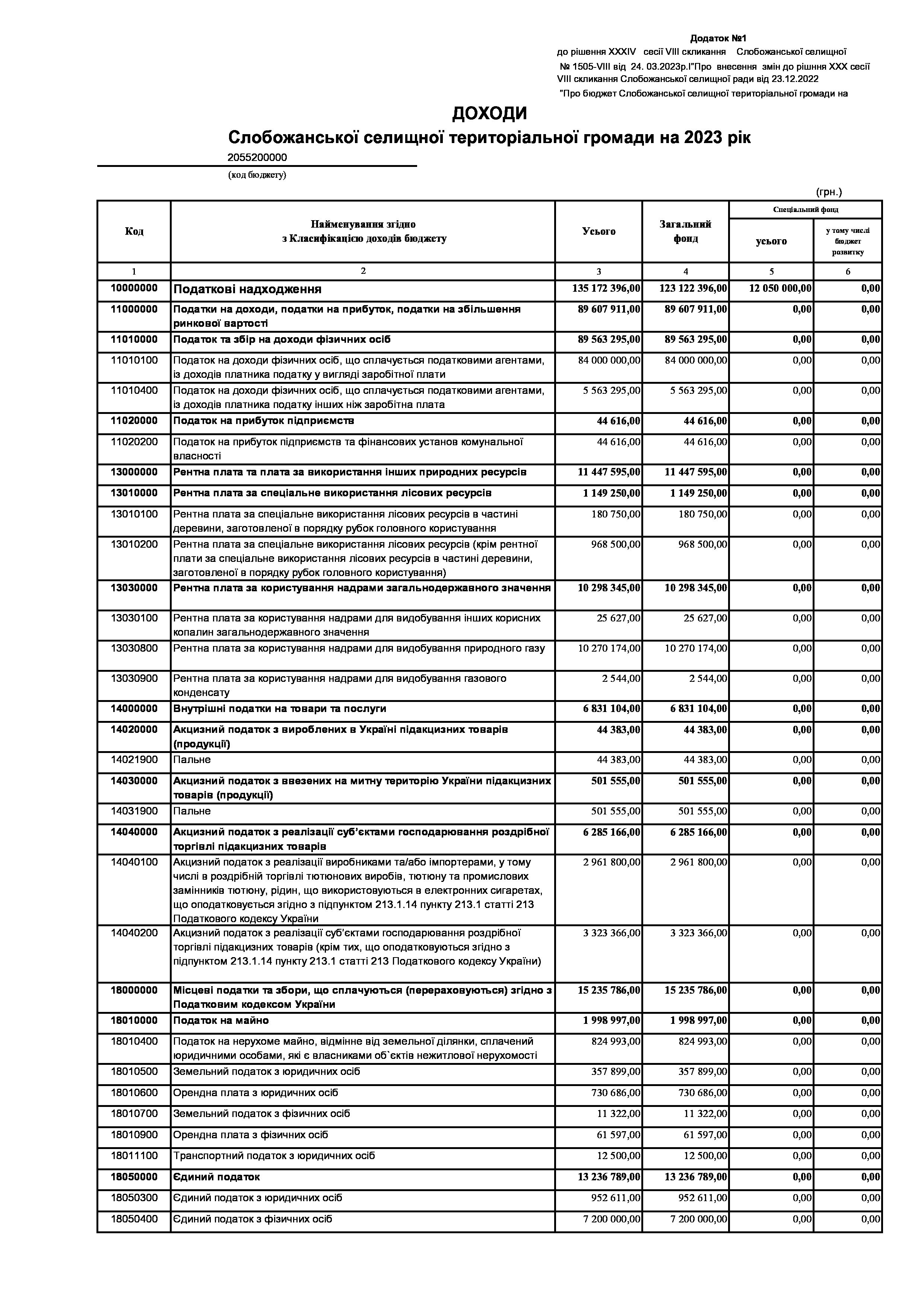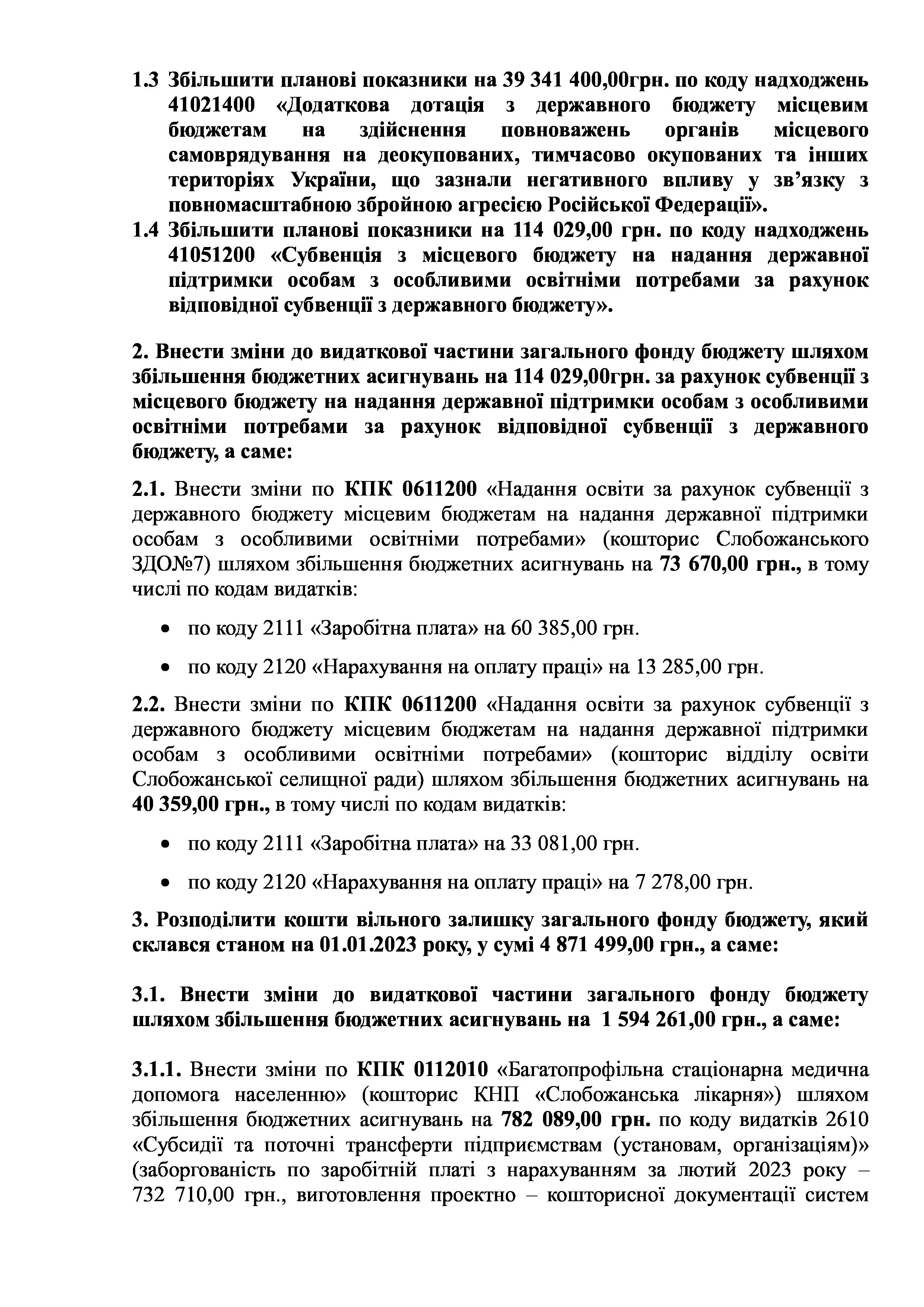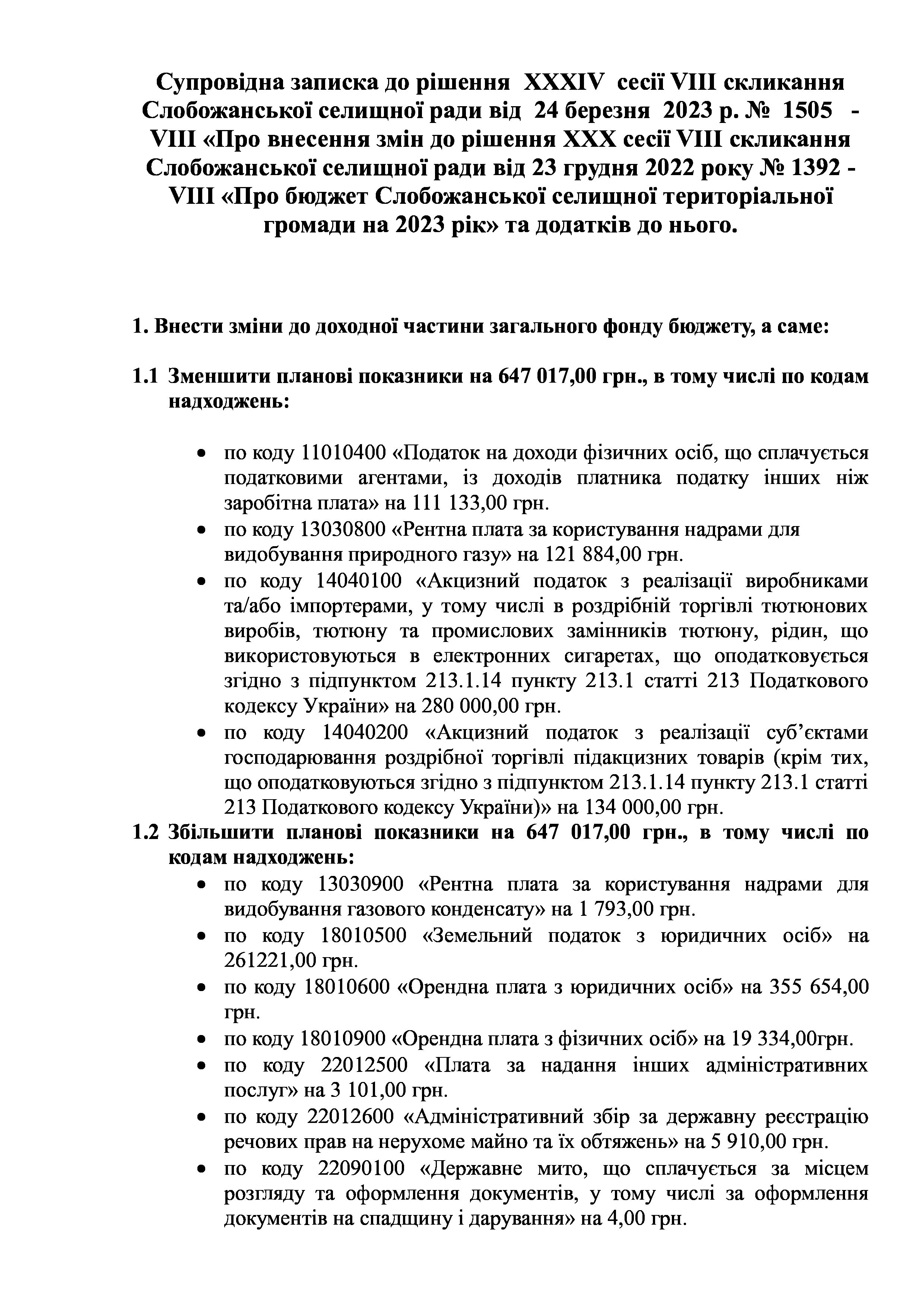 Рішення сесії №1505-VIII Про внесення змін до рішення ХХХ сесії VIІI скликання Слобожанської селищної ради від 23 грудня 2022 року №1392-VIІI «Про бюджет Слобожанської селищної територіальної громади на 2023 рік».