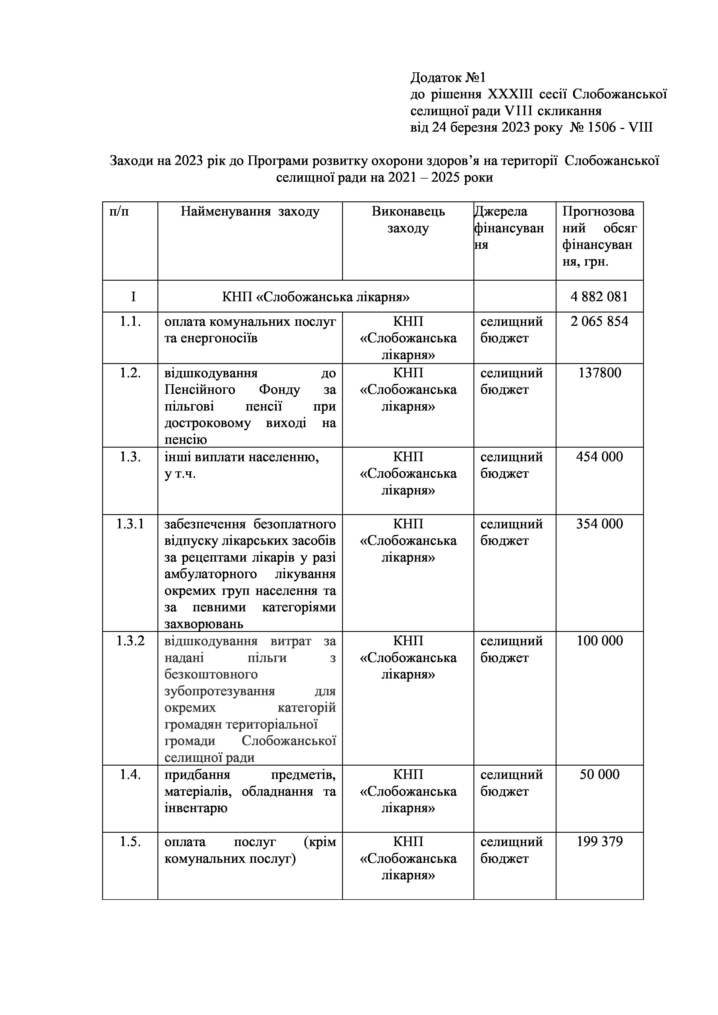 Рішення сесії №1506-VIII Про внесення змін та доповнень до Заходів на 2023 рік до Програми розвитку охорони здоров'я на території Слобожанської селищної ради на 2021 – 2025 роки.