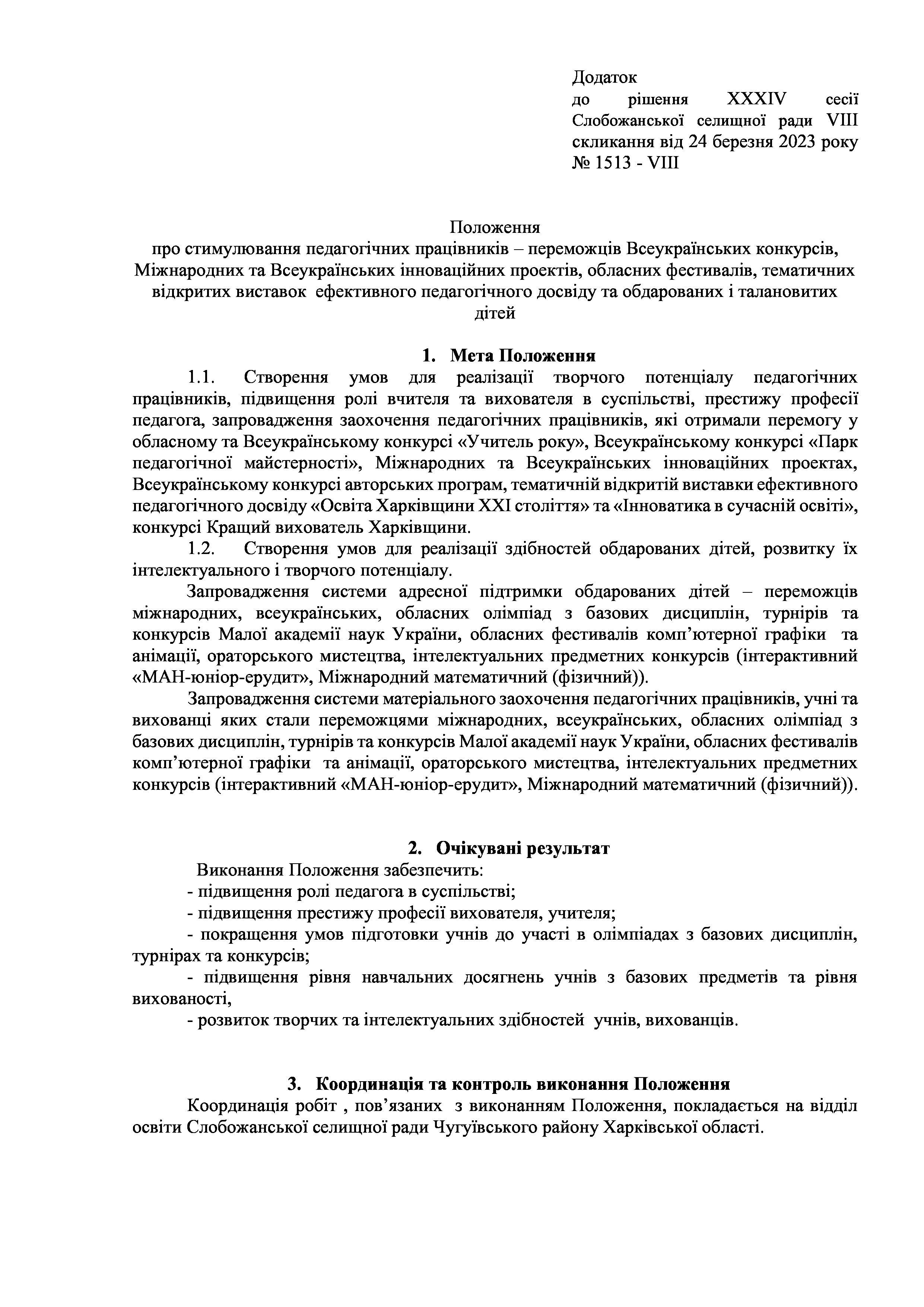 Рішення сесії №1513-VIII Про внесення змін та доповнень до Положення про стимулювання педагогічних працівників – переможців Всеукраїнських конкурсів, Міжнародних та Всеукраїнських інноваційних проектів, обласних фестивалів, тематичних відкритих виставок ефективного педагогічного досвіду та обдарованих і талановитих дітей.