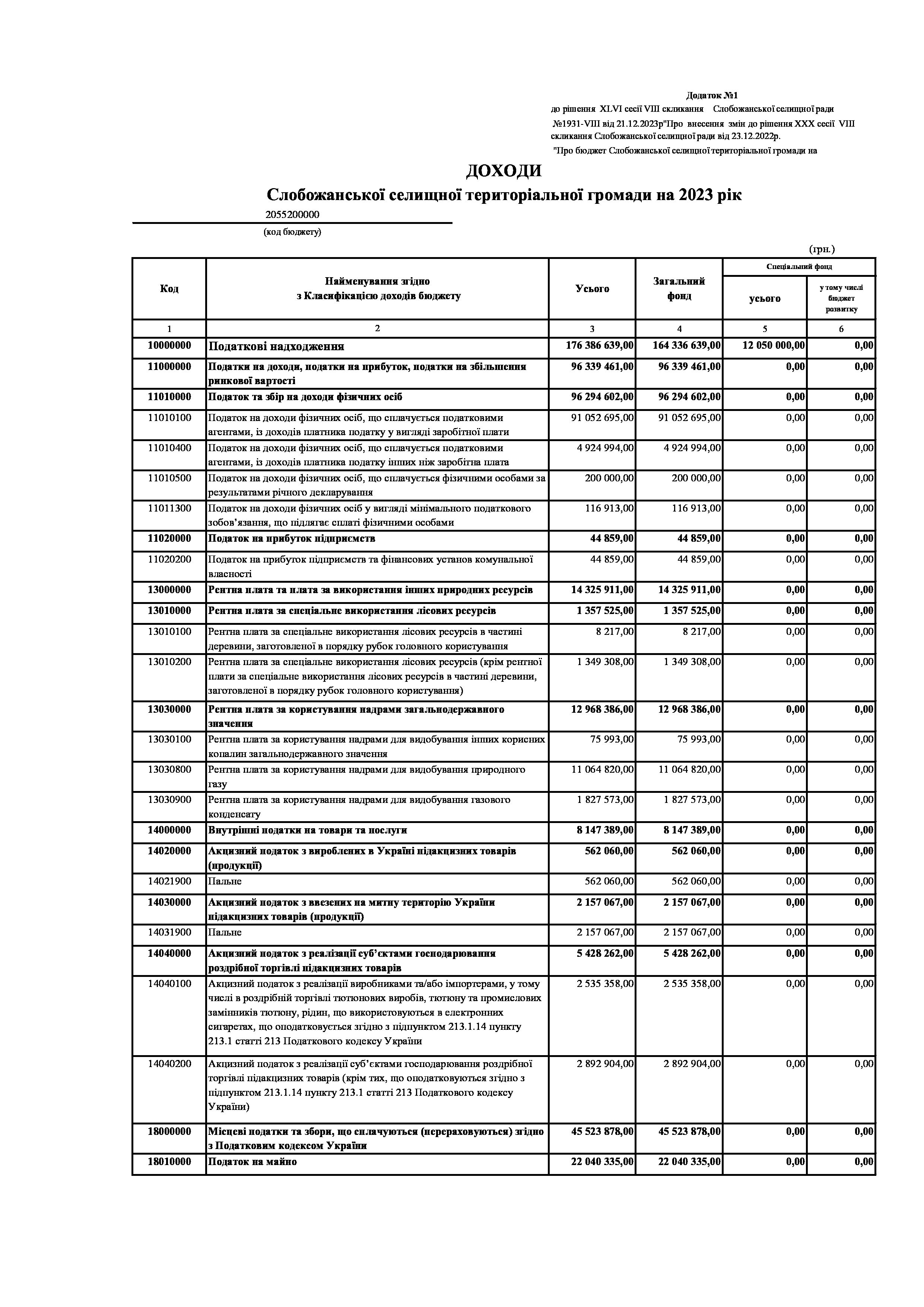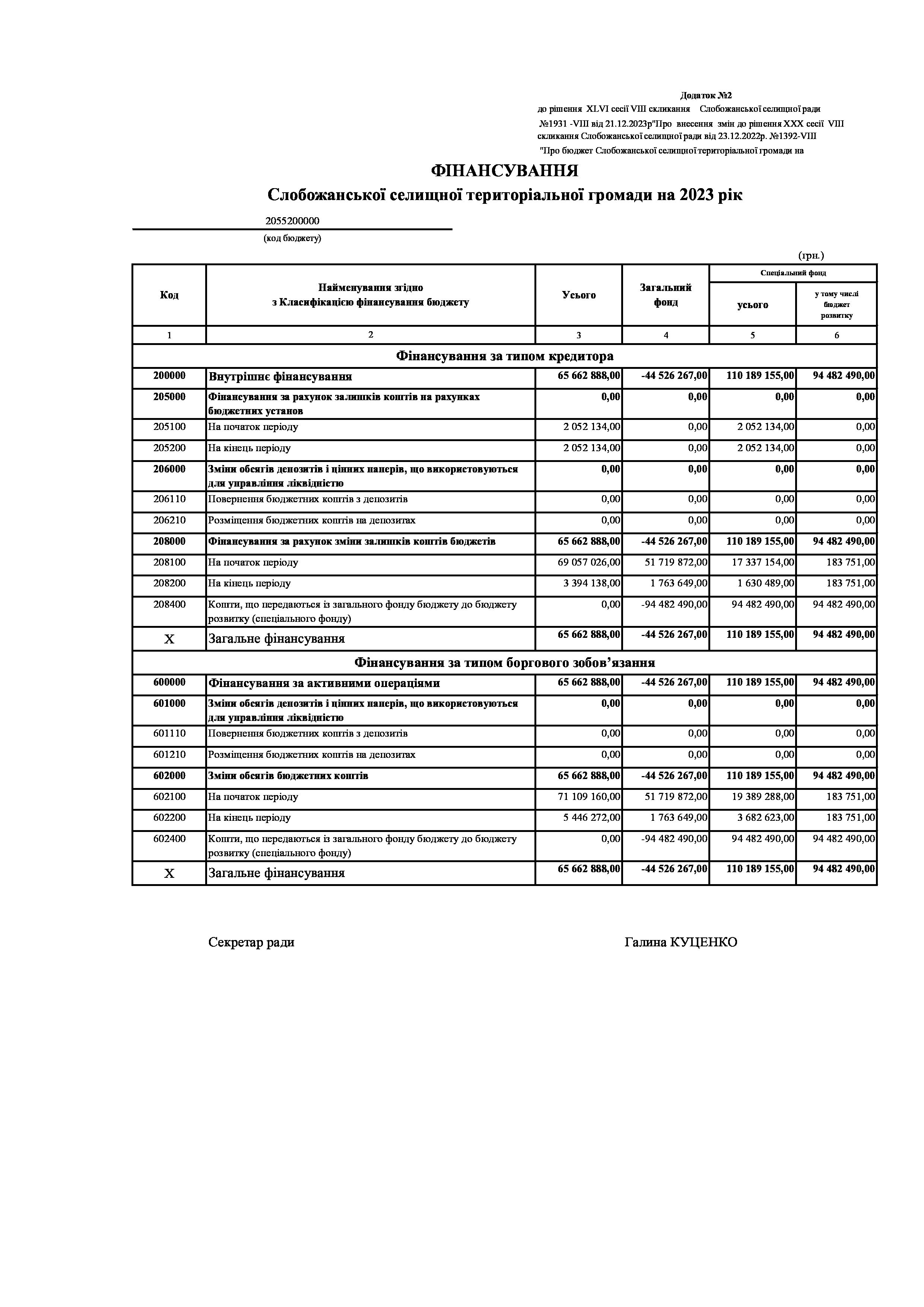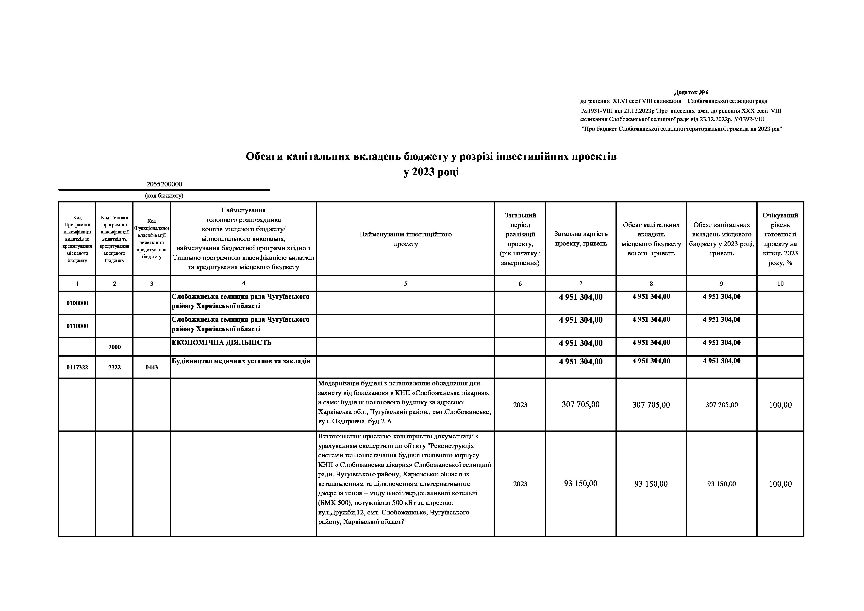 Рішенння сесії №1931-VIII Про внесення змін до рішення ХХХ сесії VIІI скликання Слобожанської селищної ради від 23 грудня 2022 року №1392-VIІI «Про бюджет Слобожанської селищної територіальної громади на 2023 рік».