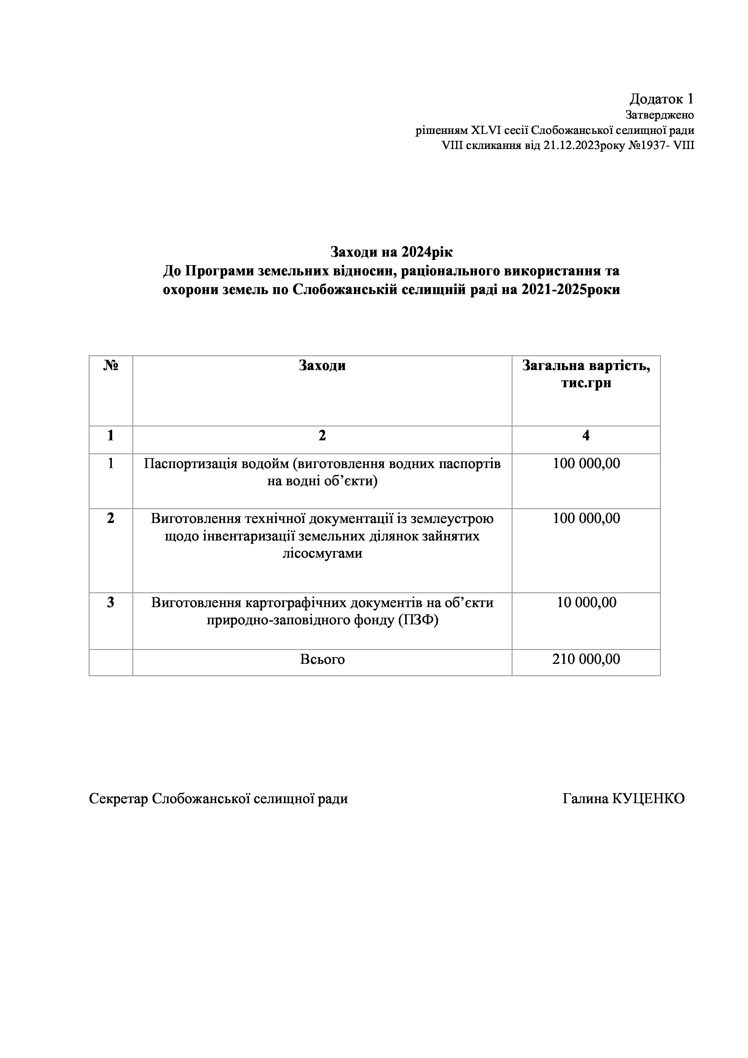 Рішенння сесії №1937-VIII Про затвердження Заходів на 2024 рік до Програми земельних відносин, раціонального використання та охорони земель по Слобожанській селищній раді на 2021-2025 роки.