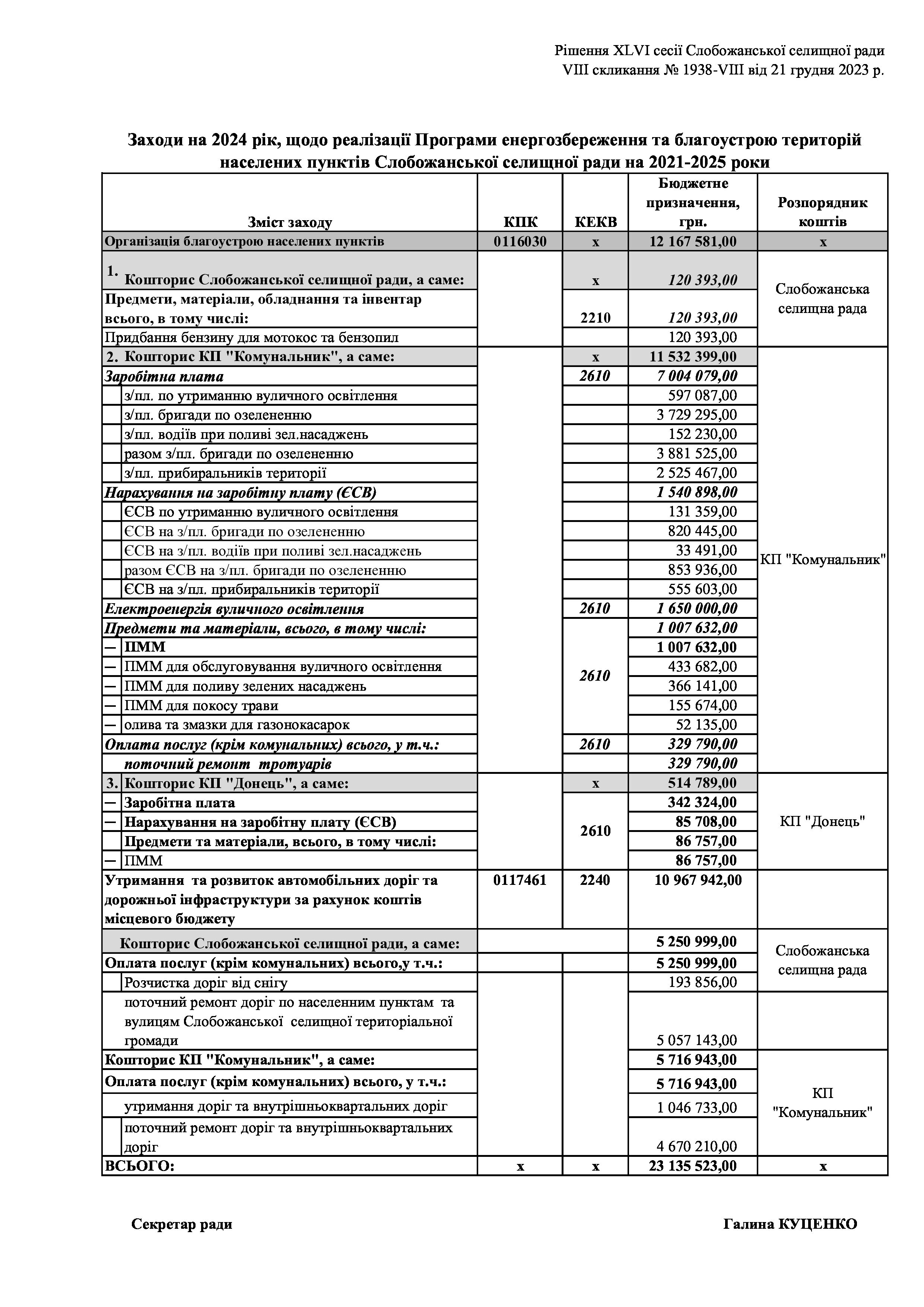 Рішенння сесії №1938-VIII Про затвердження Заходів на 2024 рік до Програми енергозбереження та благоустрою територій населених пунктів Слобожанської селищної ради на 2021-2025 роки.