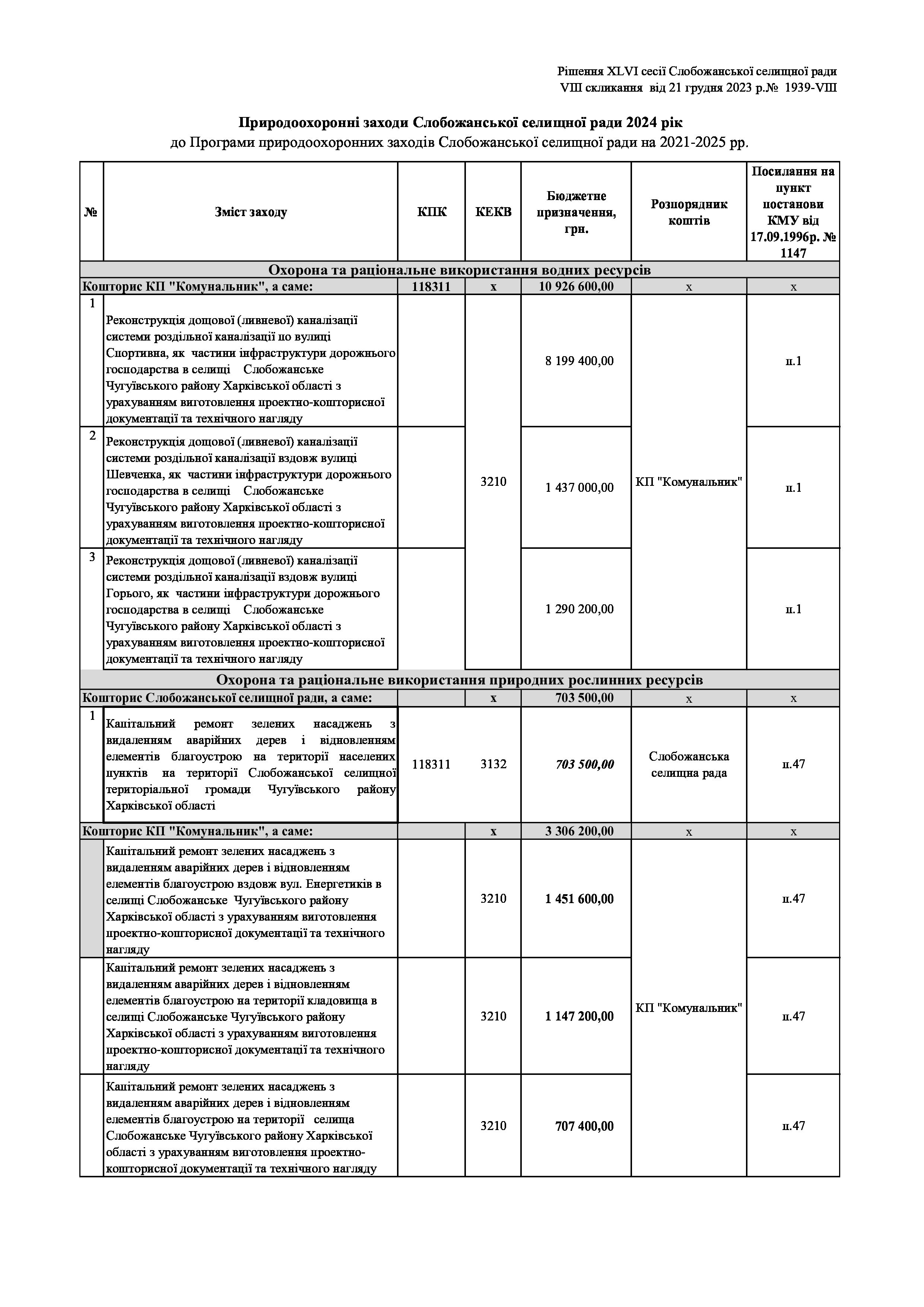 Рішенння сесії №1939-VIII Про затвердження Заходів на 2024 рік до Програми природоохоронних заходів Слобожанської селищної ради на 2021-2025 роки.