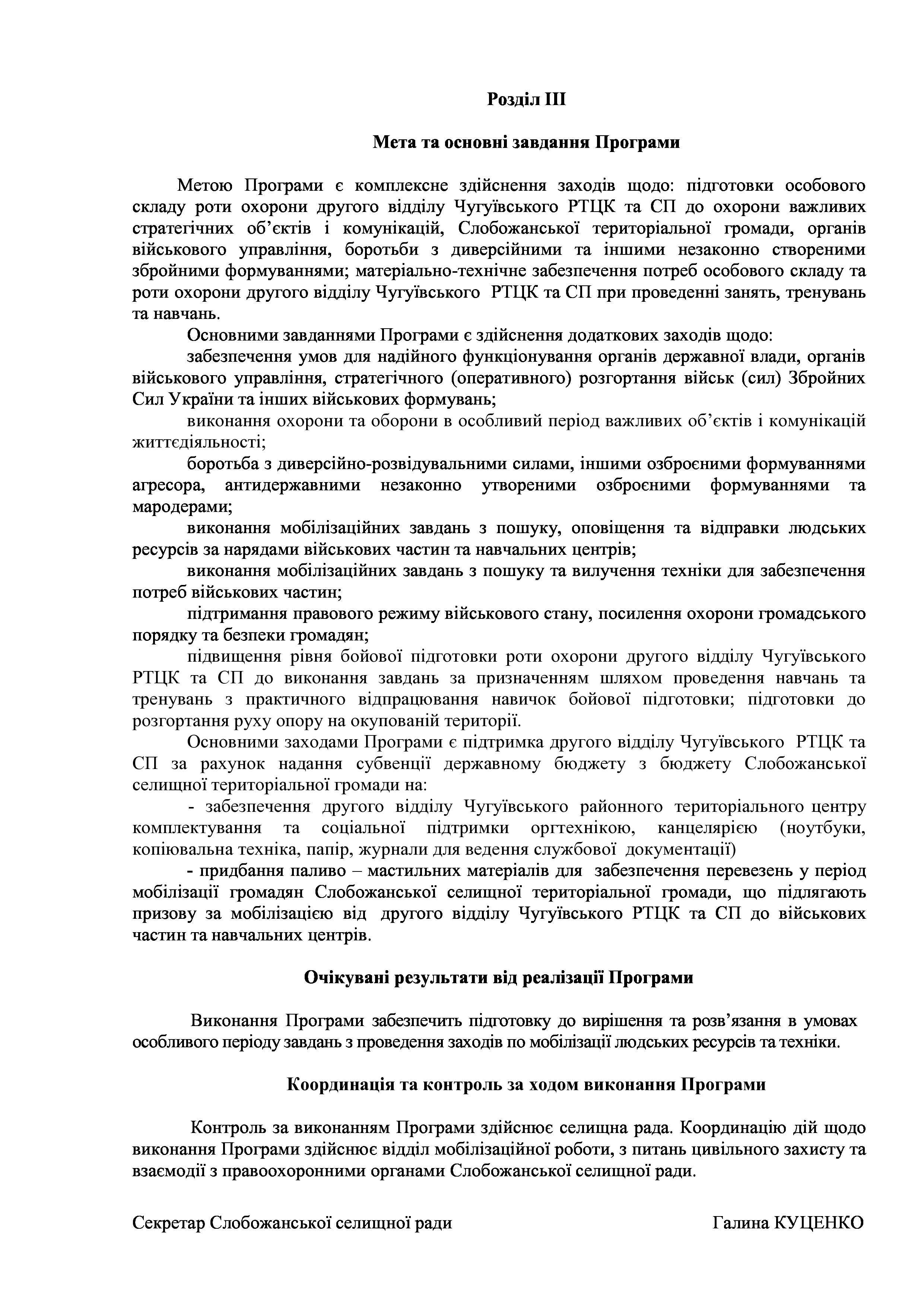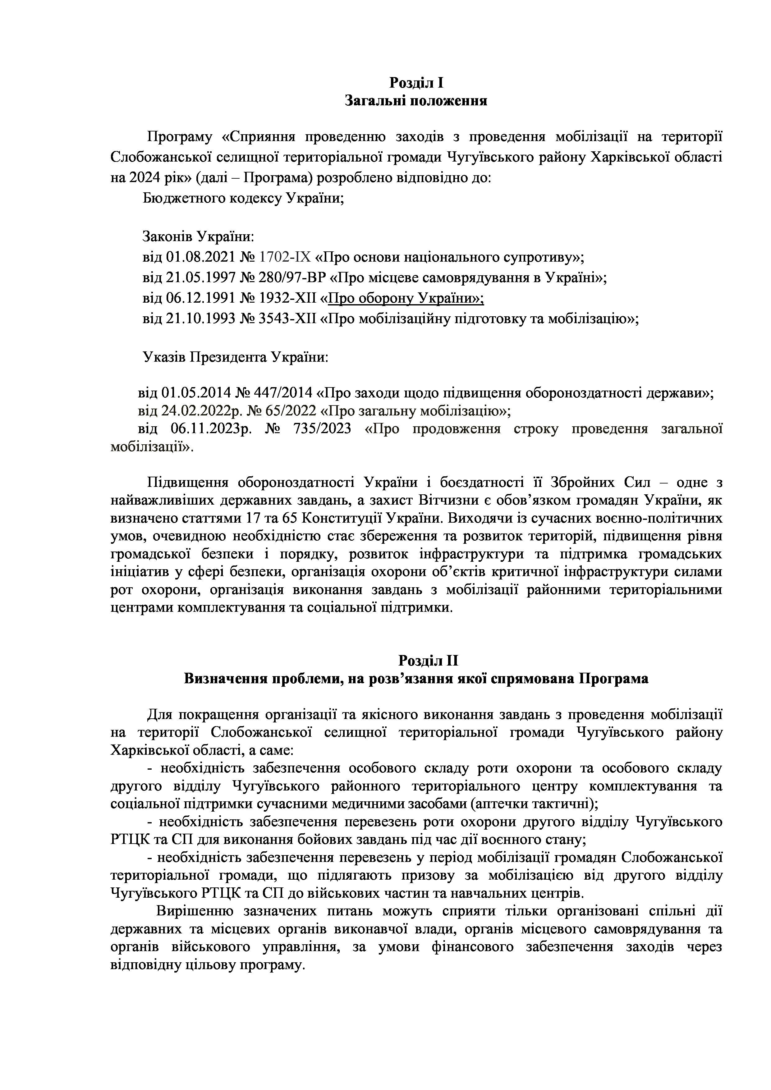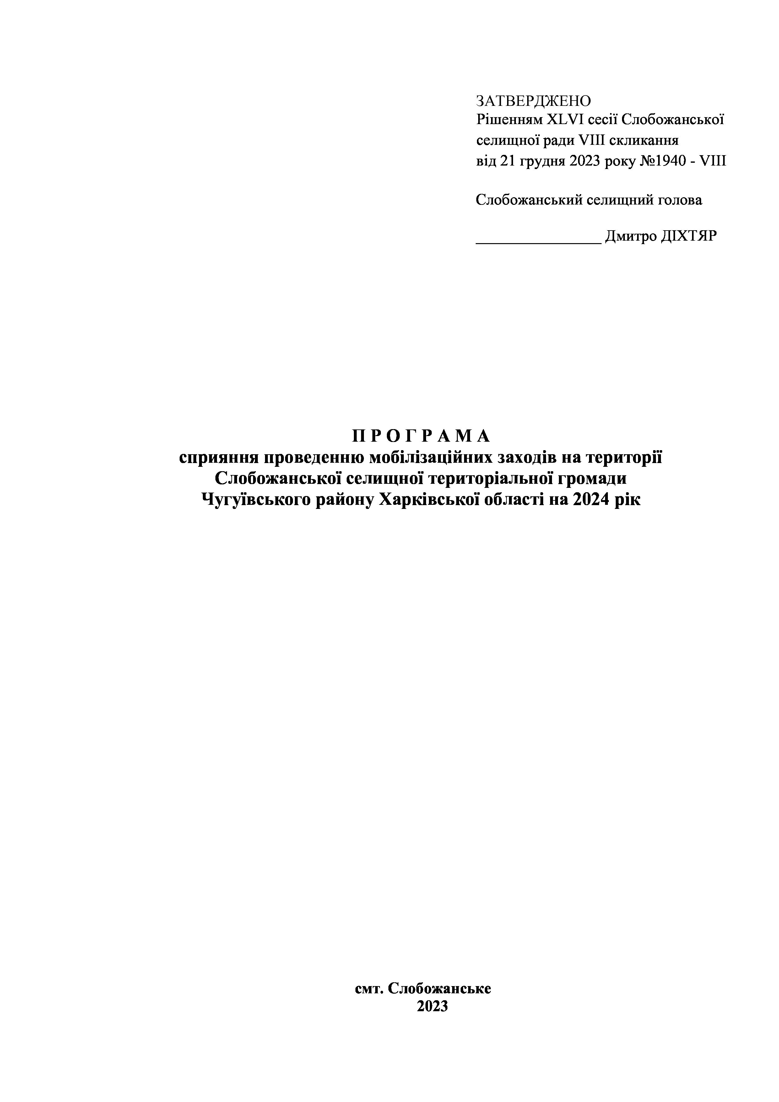 Рішенння сесії №1940-VIII Про затвердження Програми сприяння проведенню мобілізаційних заходів на території Слобожанської селищної територіальної громади Чугуївського району Харківської області на 2024 рік.