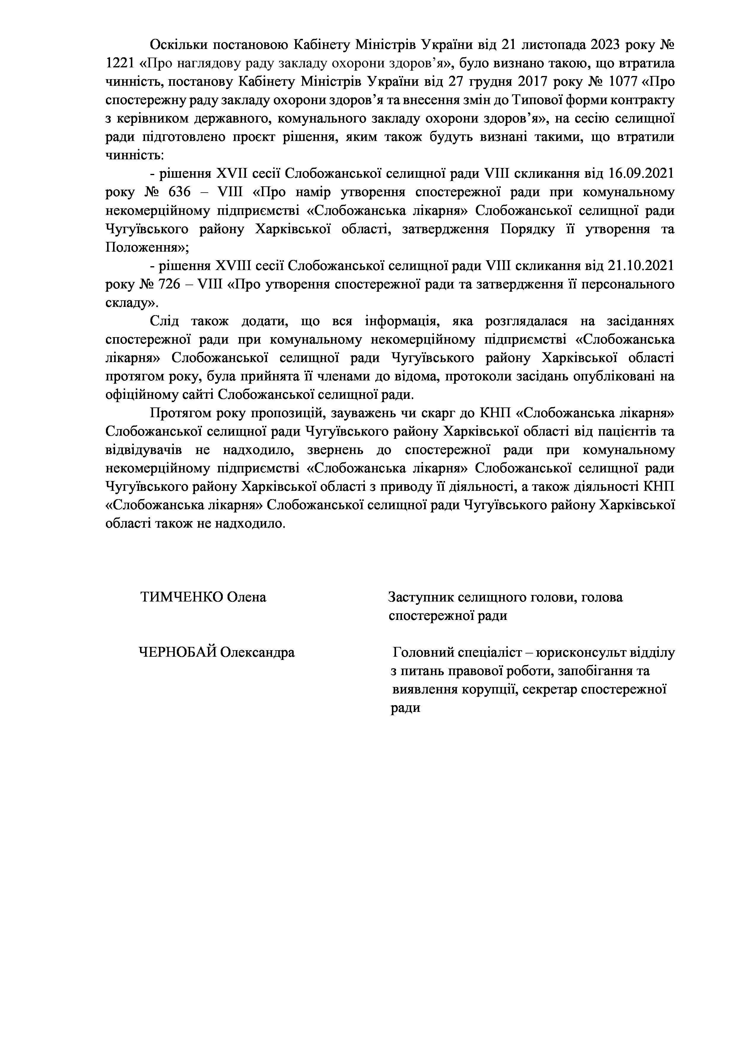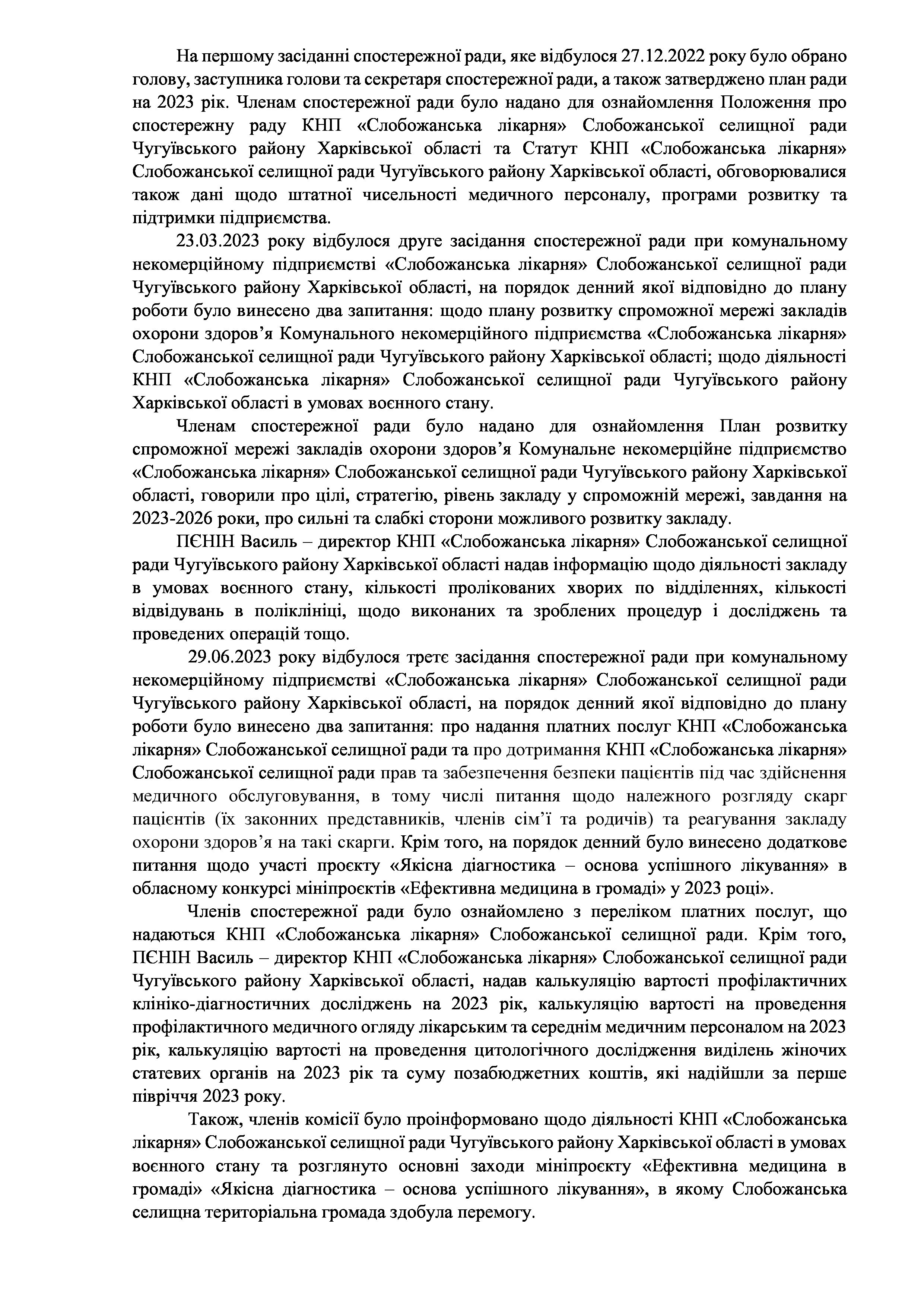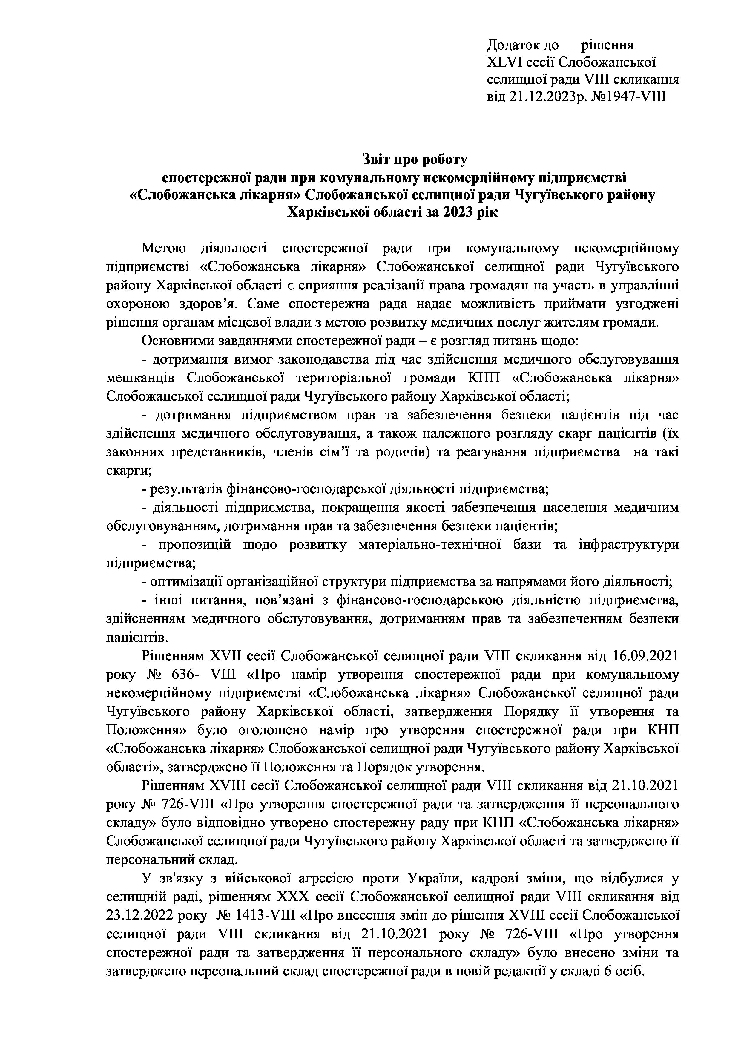 Рішенння сесії №1947-VIII Про затвердження звіту про роботу спостережної ради при комунальному некомерційному підприємстві «Слобожанська лікарня» Слобожанської селищної ради Чугуївського району Харківської області на 2023 рік.