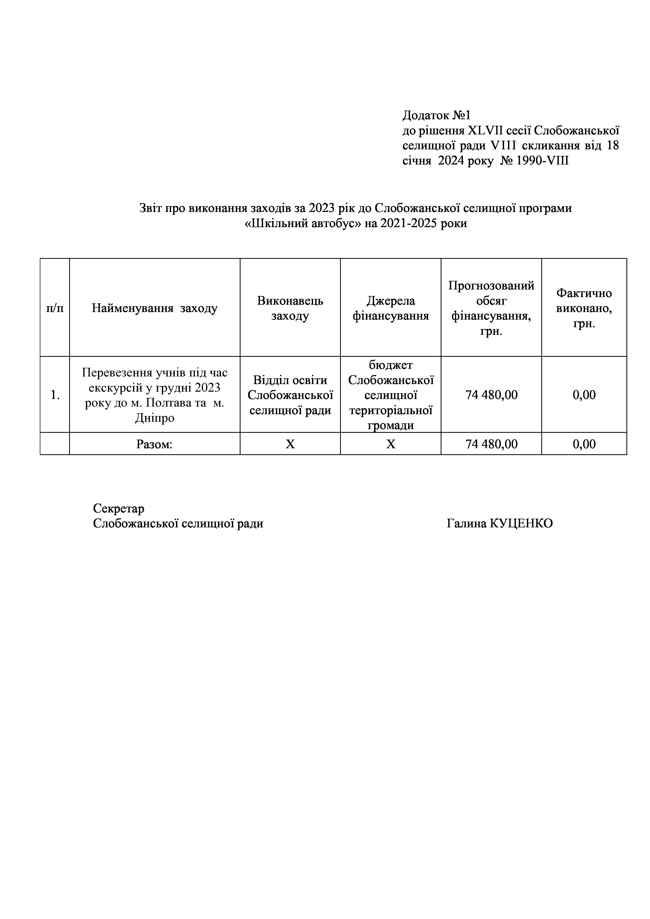 Рішення сесії №1990 Про затвердження звіту про виконання заходів за 2023 рік до Слобожанської селищної програми «Шкільний автобус» на 2021-2025 pоки.