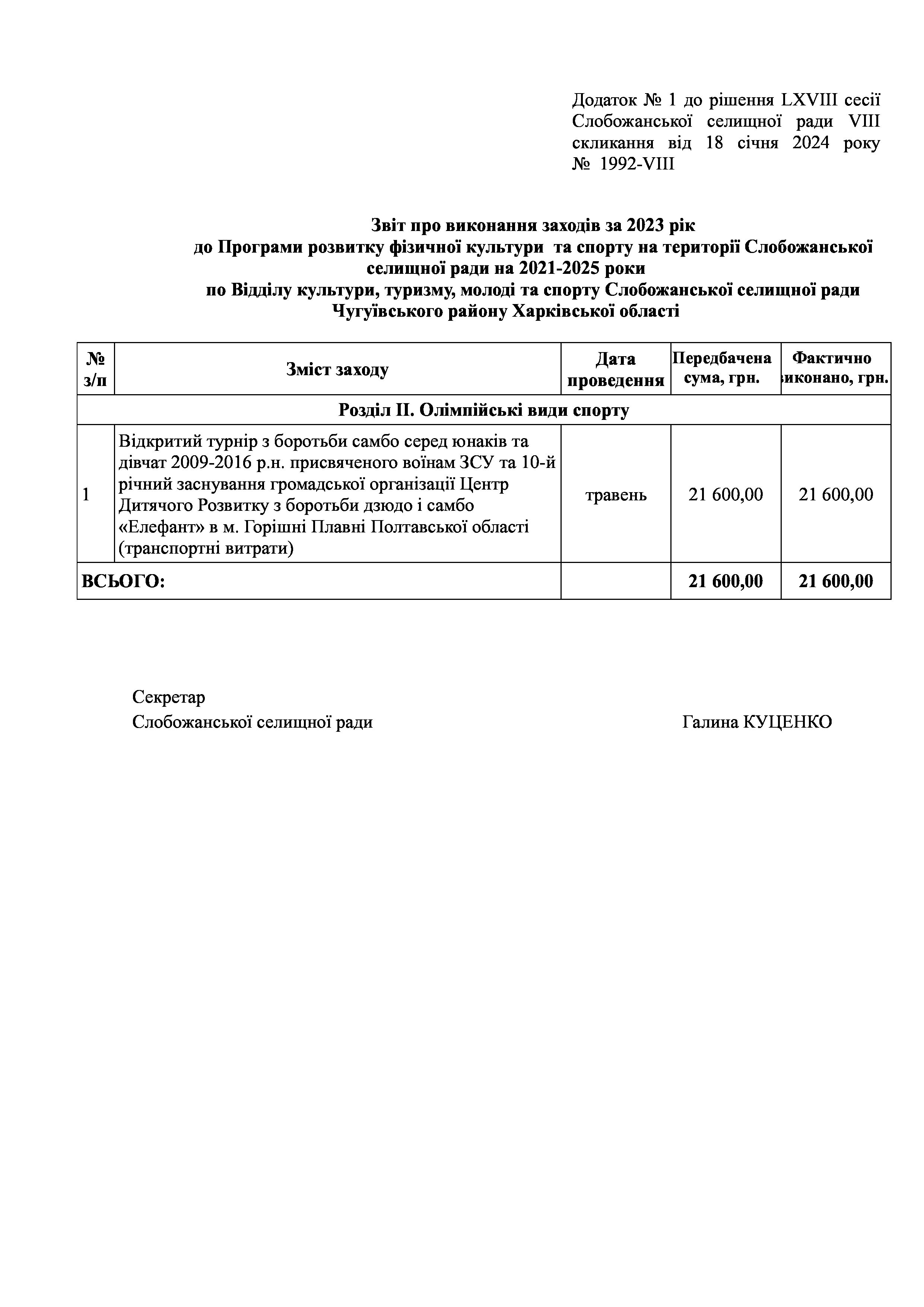 Рішення сесії №1992 Про затвердження звіту про виконання заходів за 2023 рік до Програми розвитку фізичної культури та спорту на території Слобожанської селищної ради на 2021-2025 роки.