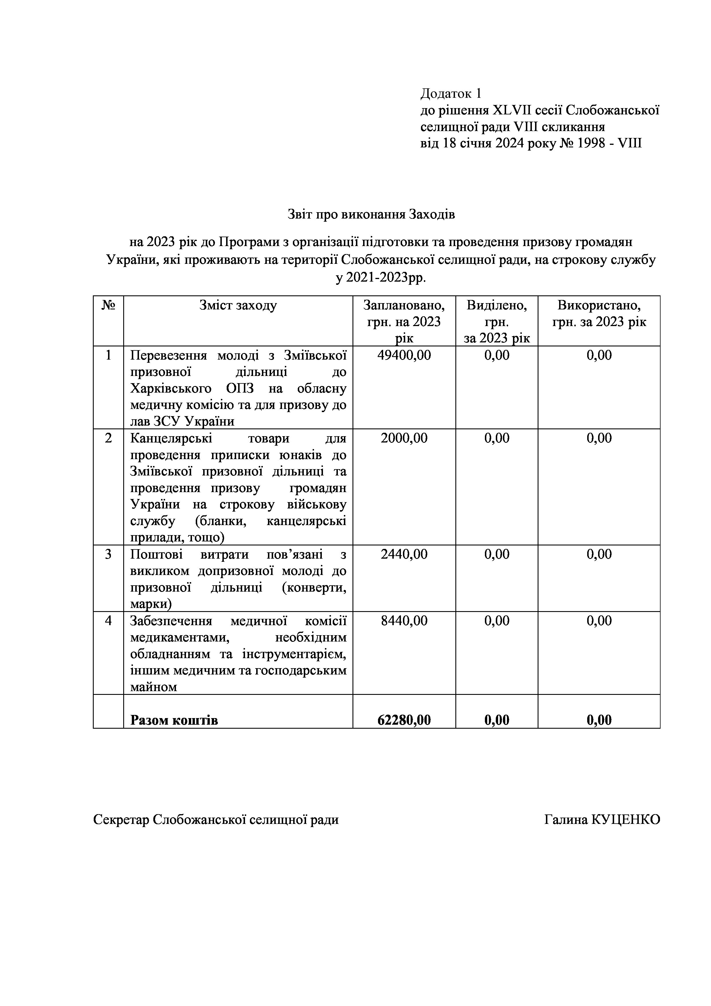 Рішення сесії №1998 Про затвердження звіту про виконання Заходів на 2023 рік до Програми з організації підготовки та проведення призову громадян України, які проживають на території Слобожанської селищної ради, на строкову військову службу у 2021-2023 роках.