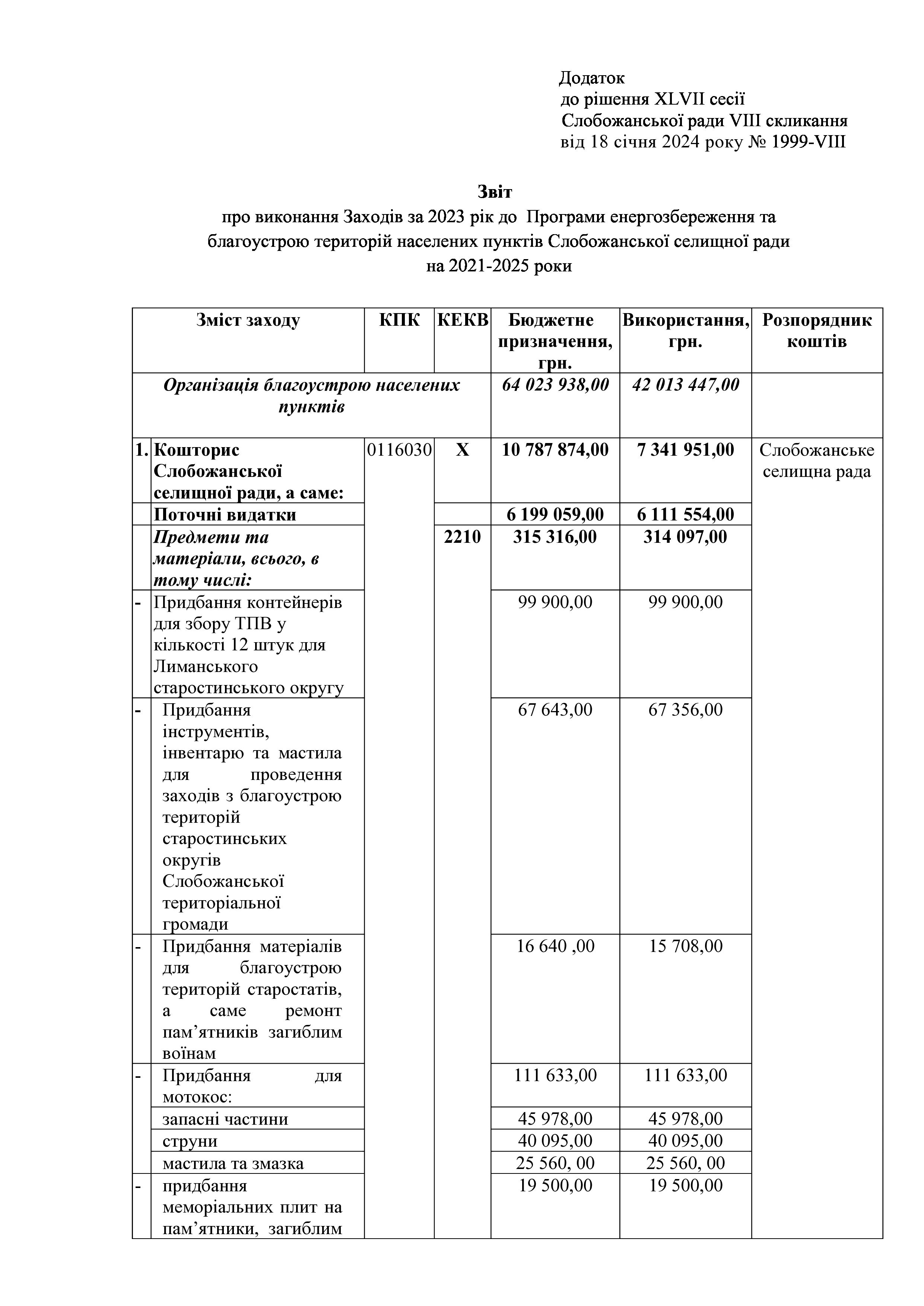 Рішення сесії №1999 Про затвердження звіту про виконання Заходів за 2023 рік до Програми енергозбереження та благоустрою територій населених пунктів Слобожанської селищної ради на 2021-2025 роки.