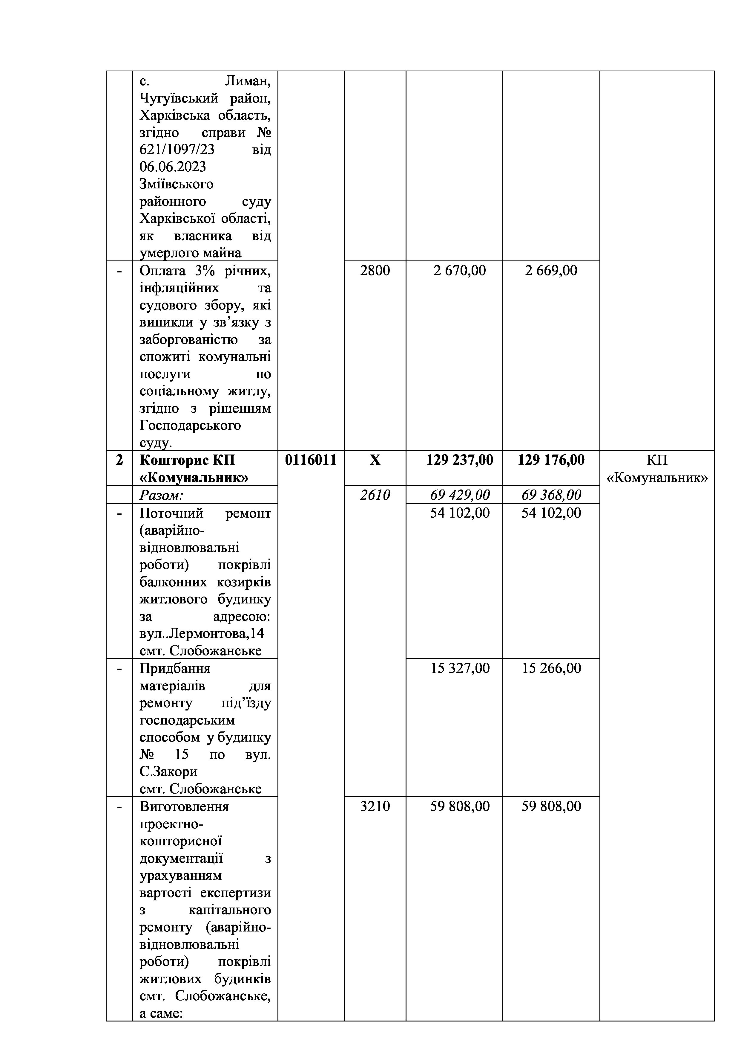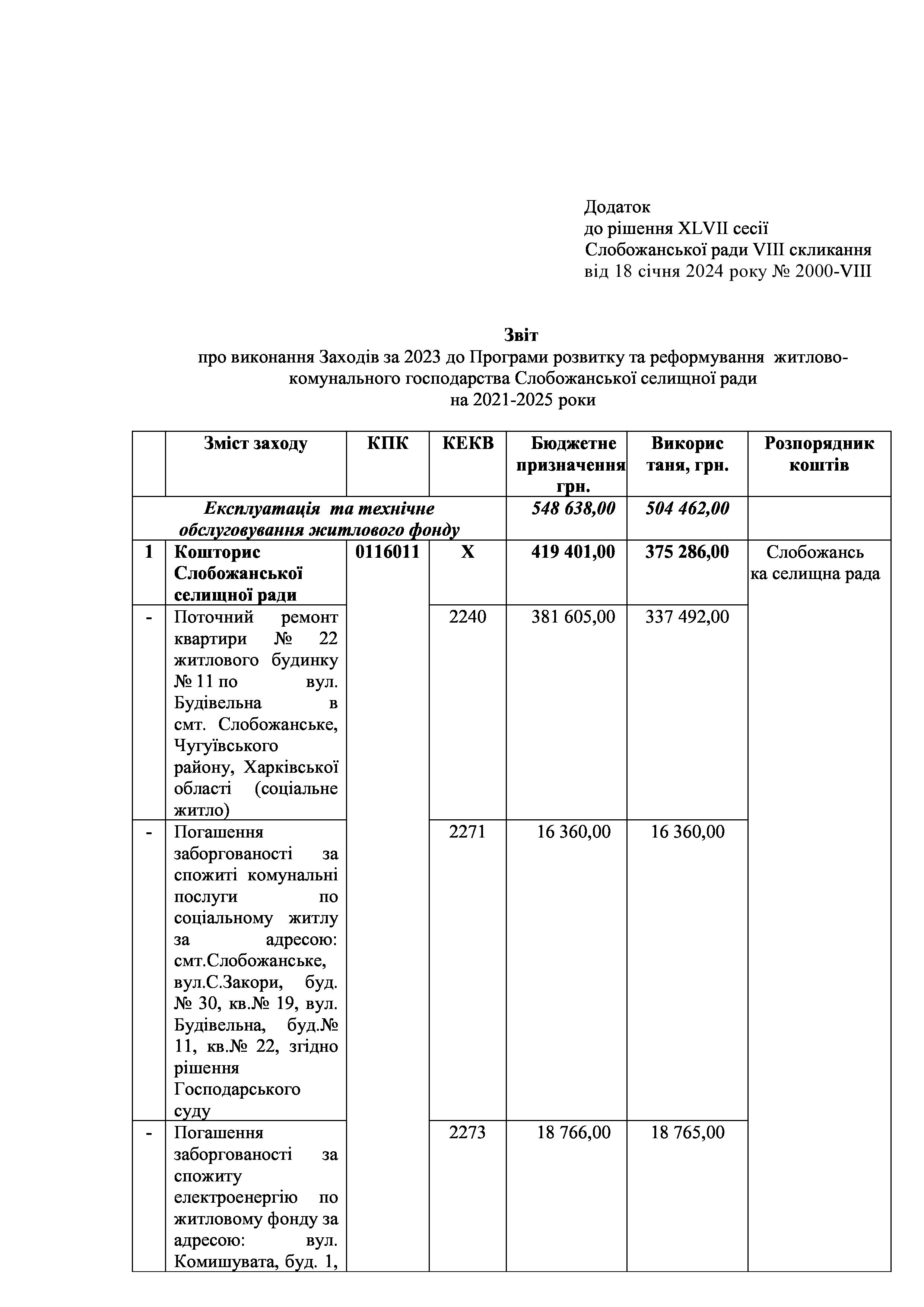 Рішення сесії №2000 Про затвердження звіту про виконання Заходів за 2023 рік до Програми розвитку та реформування житлово-комунального господарства Слобожанської селищної ради на 2021-2025 роки.