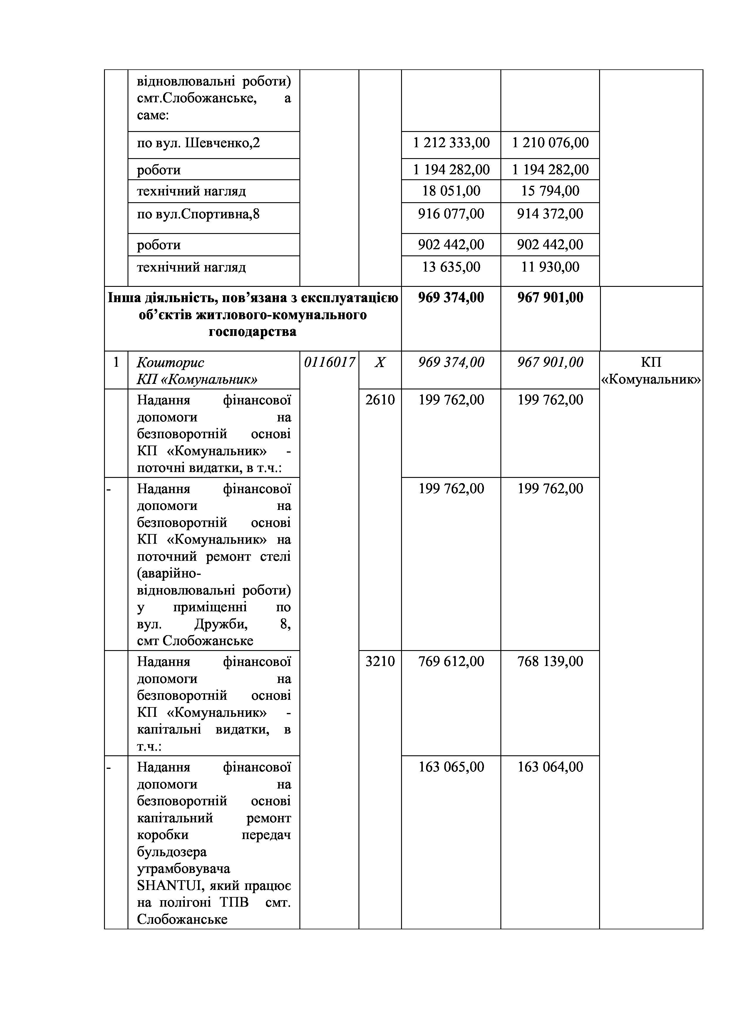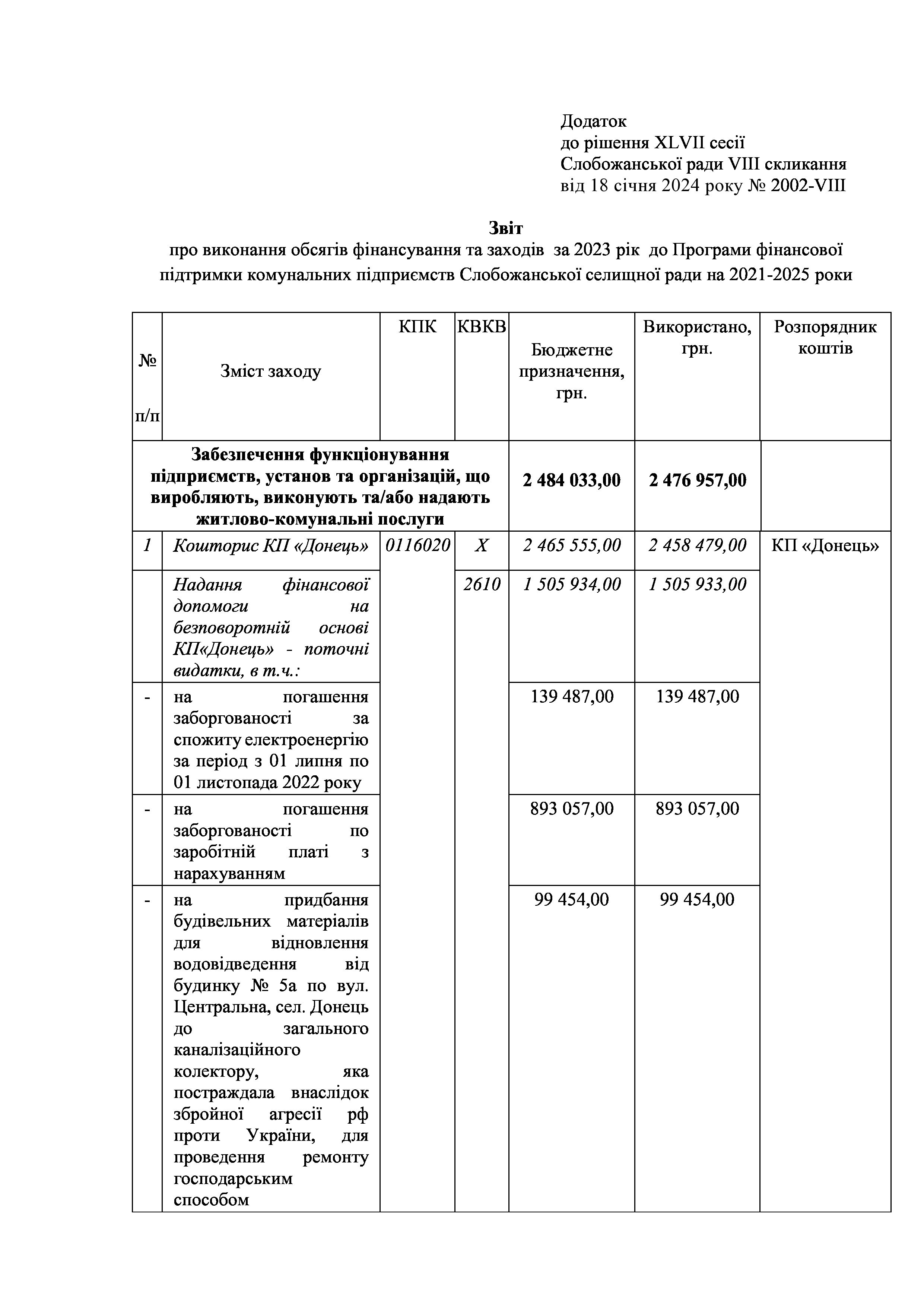 Рішення сесії №2002 Про затвердження звіту про виконання Заходів за 2023 рік до Програми фінансової підтримки комунальних підприємств Слобожанської селищної ради на 2021-2025 роки.