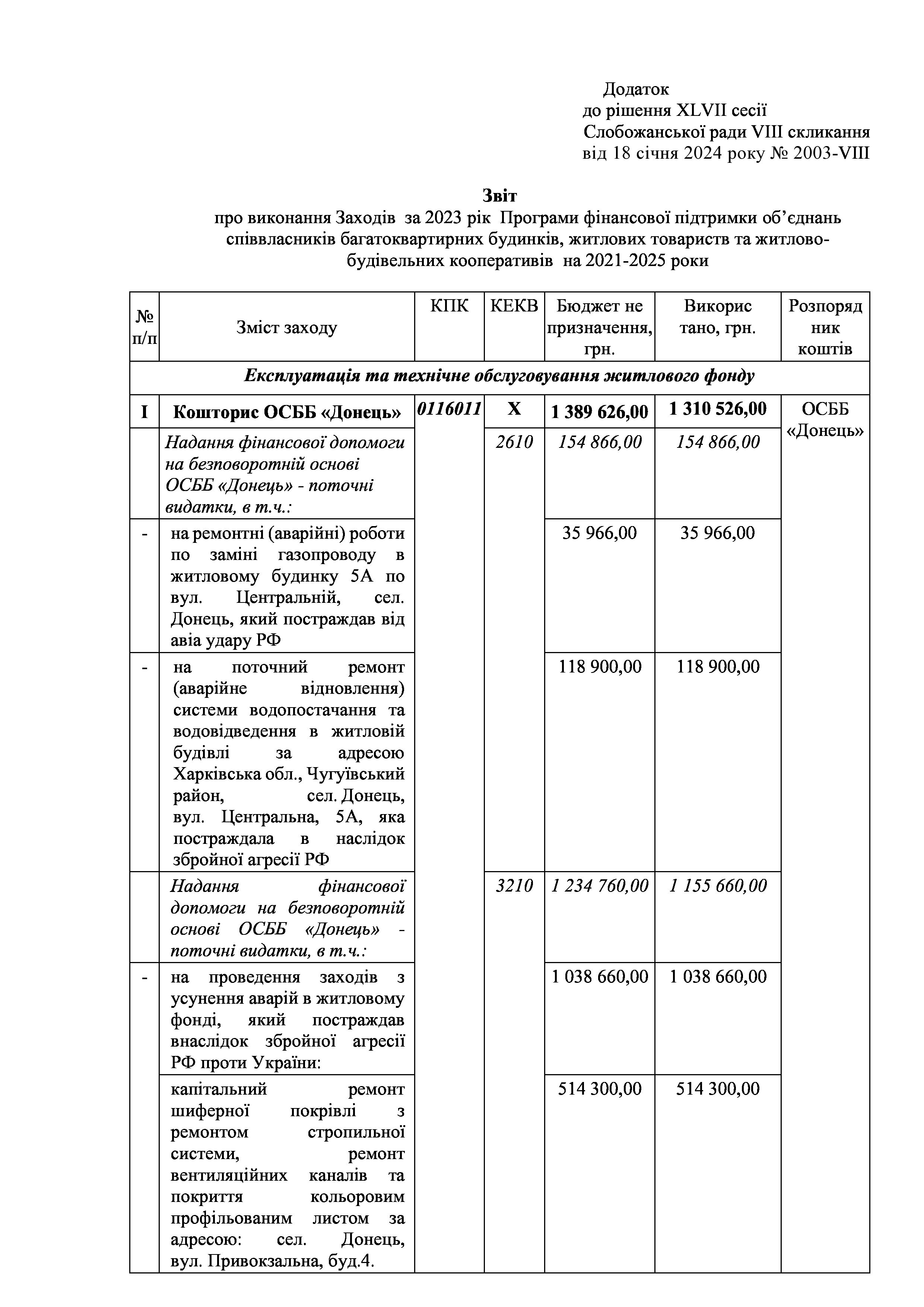 Рішення сесії №2003 Про затвердження звіту про виконання Заходів за 2023 рік до Програми фінансової підтримки об’єднань співвласників багатоквартирних будинків, житлових товариств та житлово-будівельних кооперативів на 2021-2025 роки.