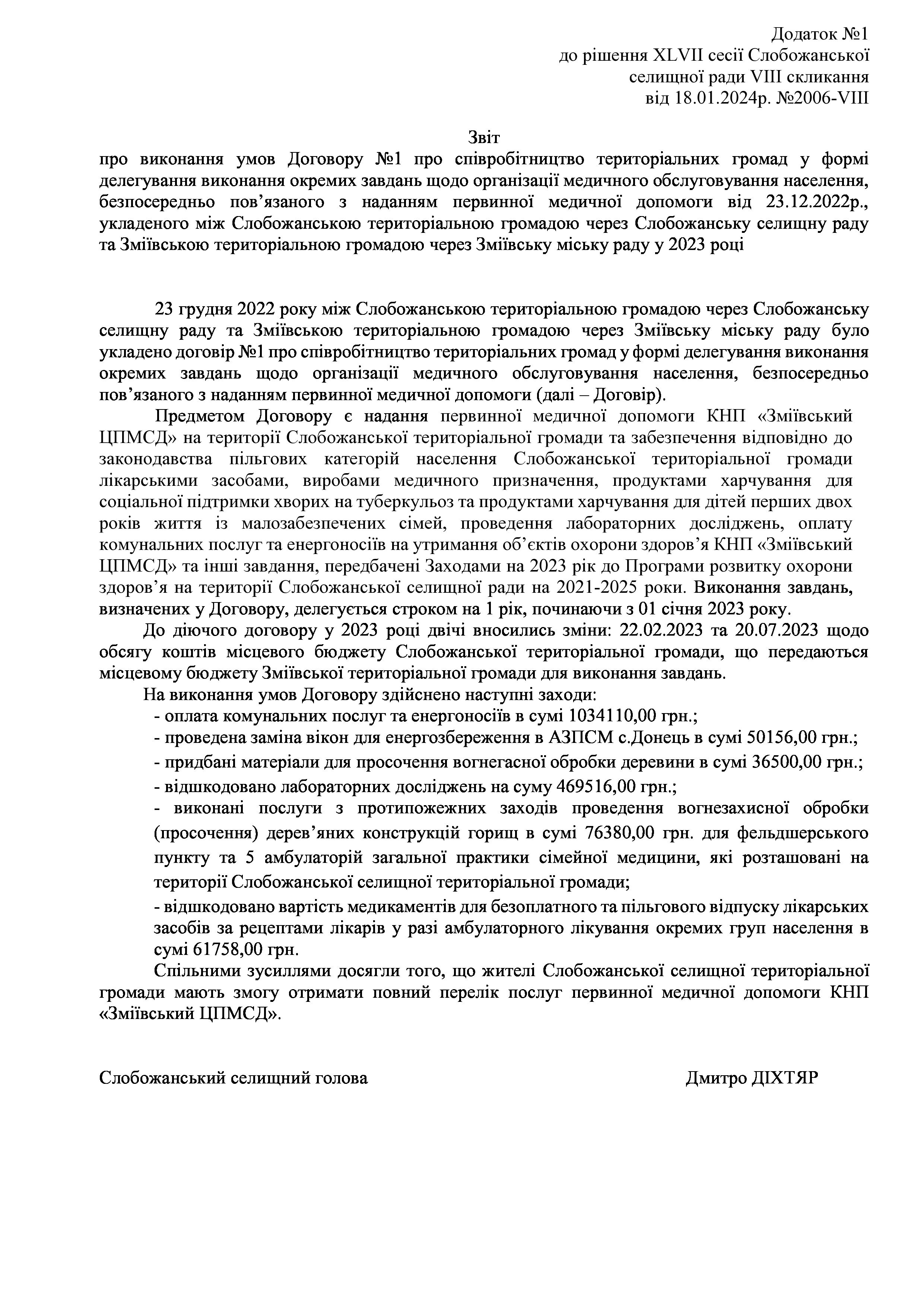 Рішення сесії №2041 Про Звіт Слобожанського селищного голови Дмитра ДІХТЯРА за 2023 рік.