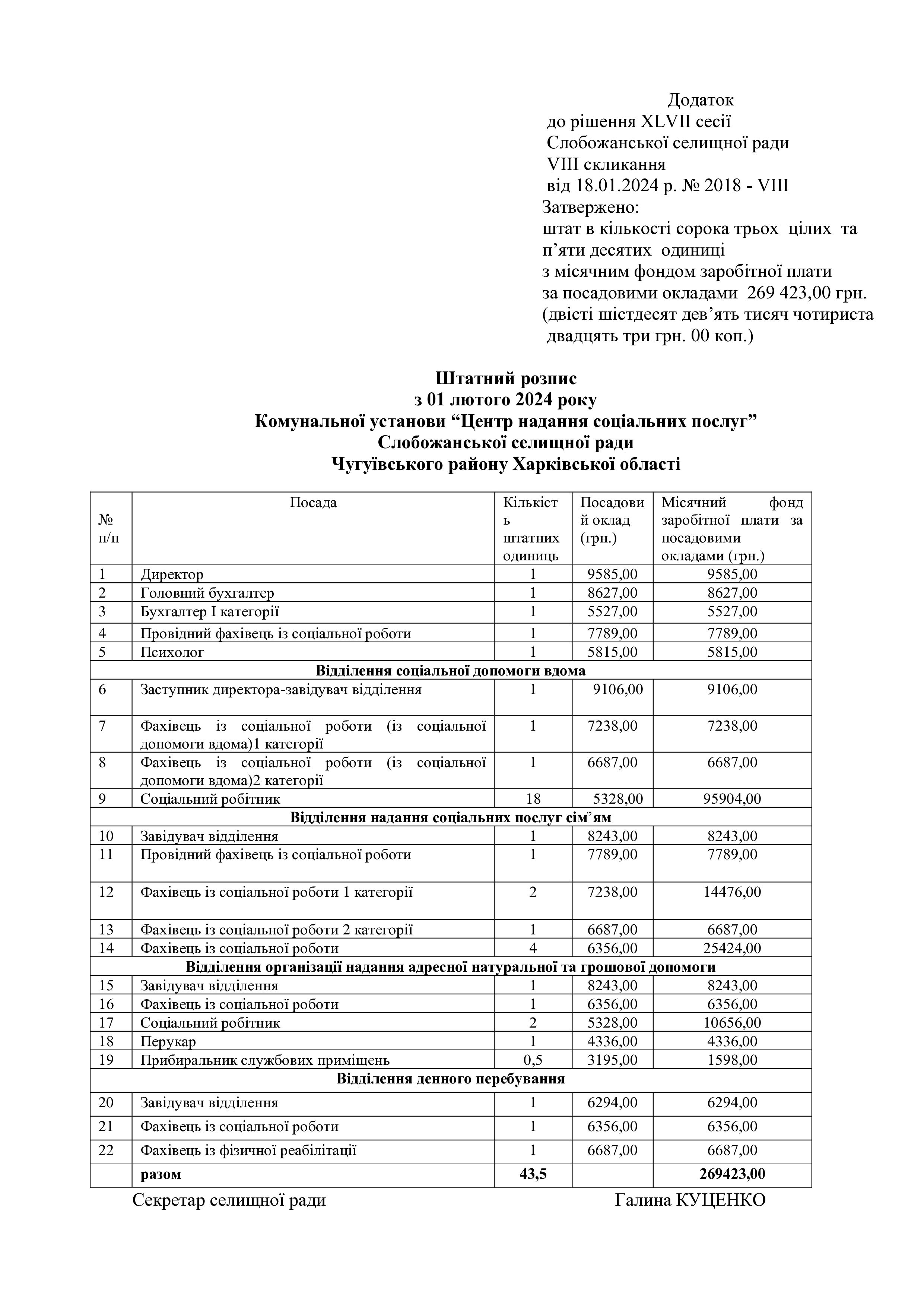 Рішення сесії №2018 Про затвердження штатного розпису та штатної чисельності Комунальної установи «Центр надання соціальних послуг» Слобожанської селищної територіальної громади Чугуївського району Харківської області.
