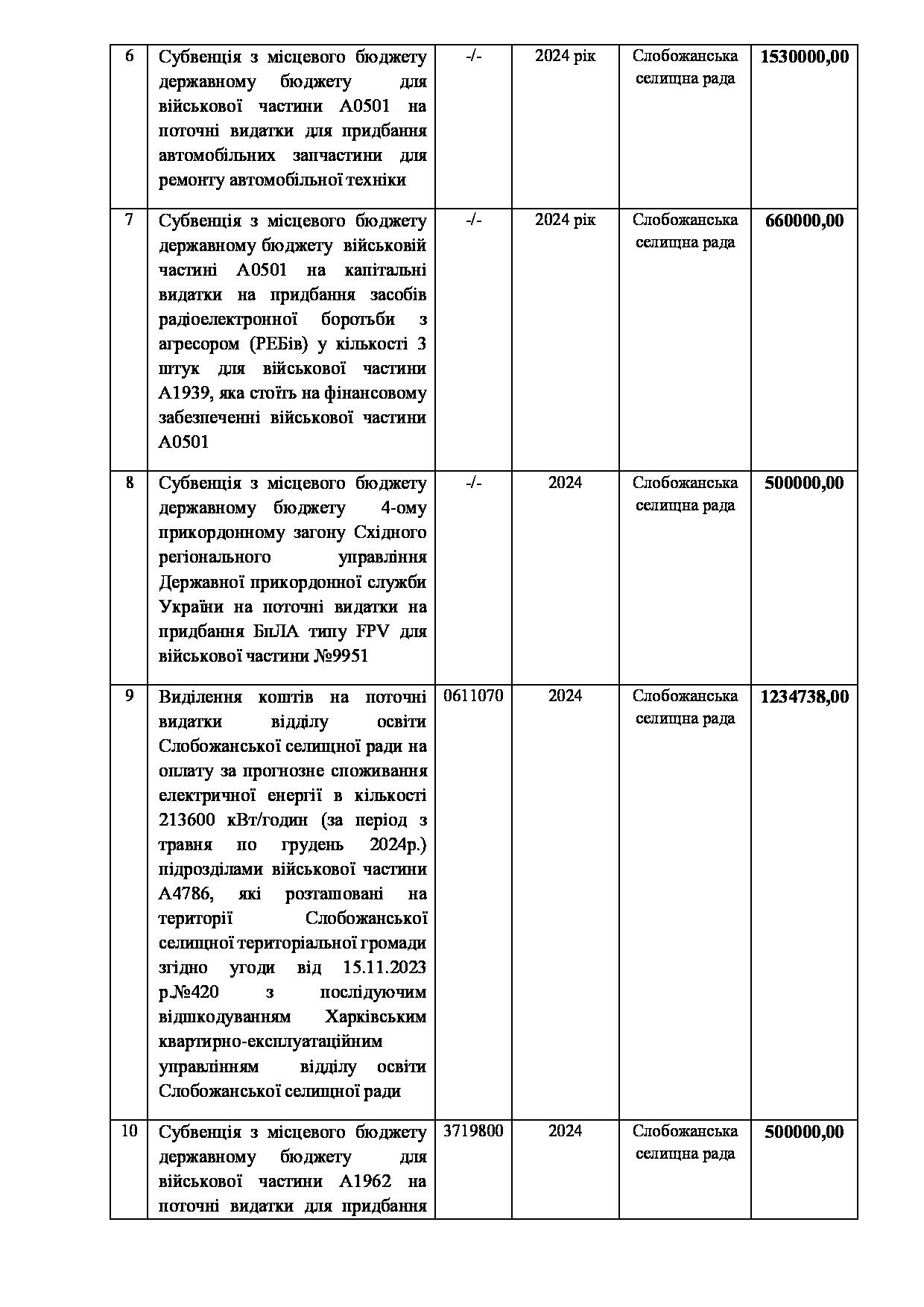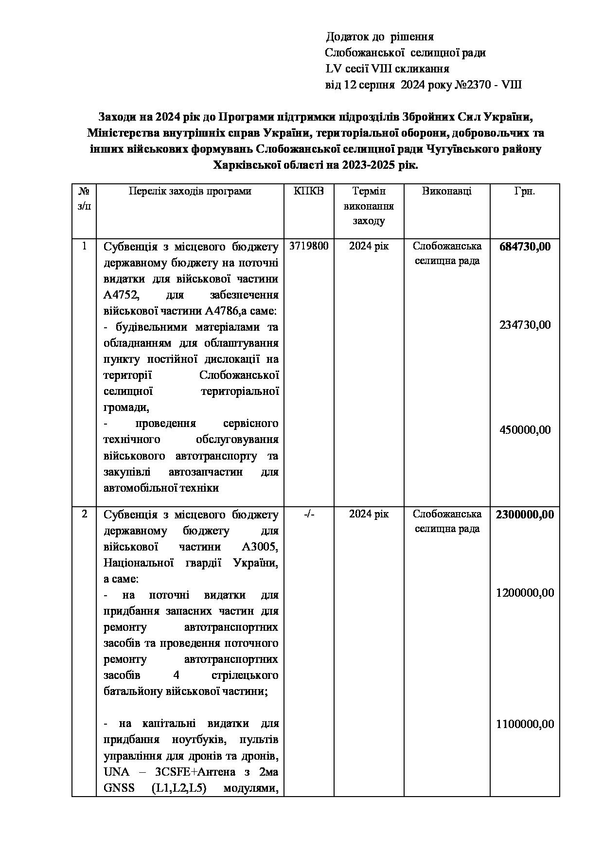 Текст рішення сесії №2370 Про внесення змін до заходів на 2024 рік до Програми підтримки підрозділів Збройних Сил України, Міністерства внутрішніх справ України, територіальної оборони, добровольчих та інших військових формувань Слобожанської селищної ради Чугуївського району Харківської області на 2023-2025 роки.