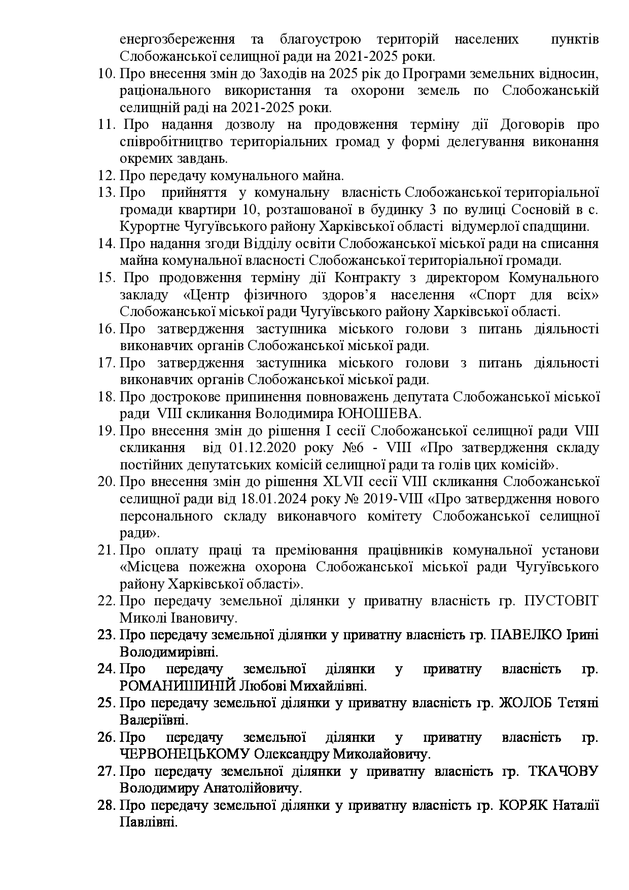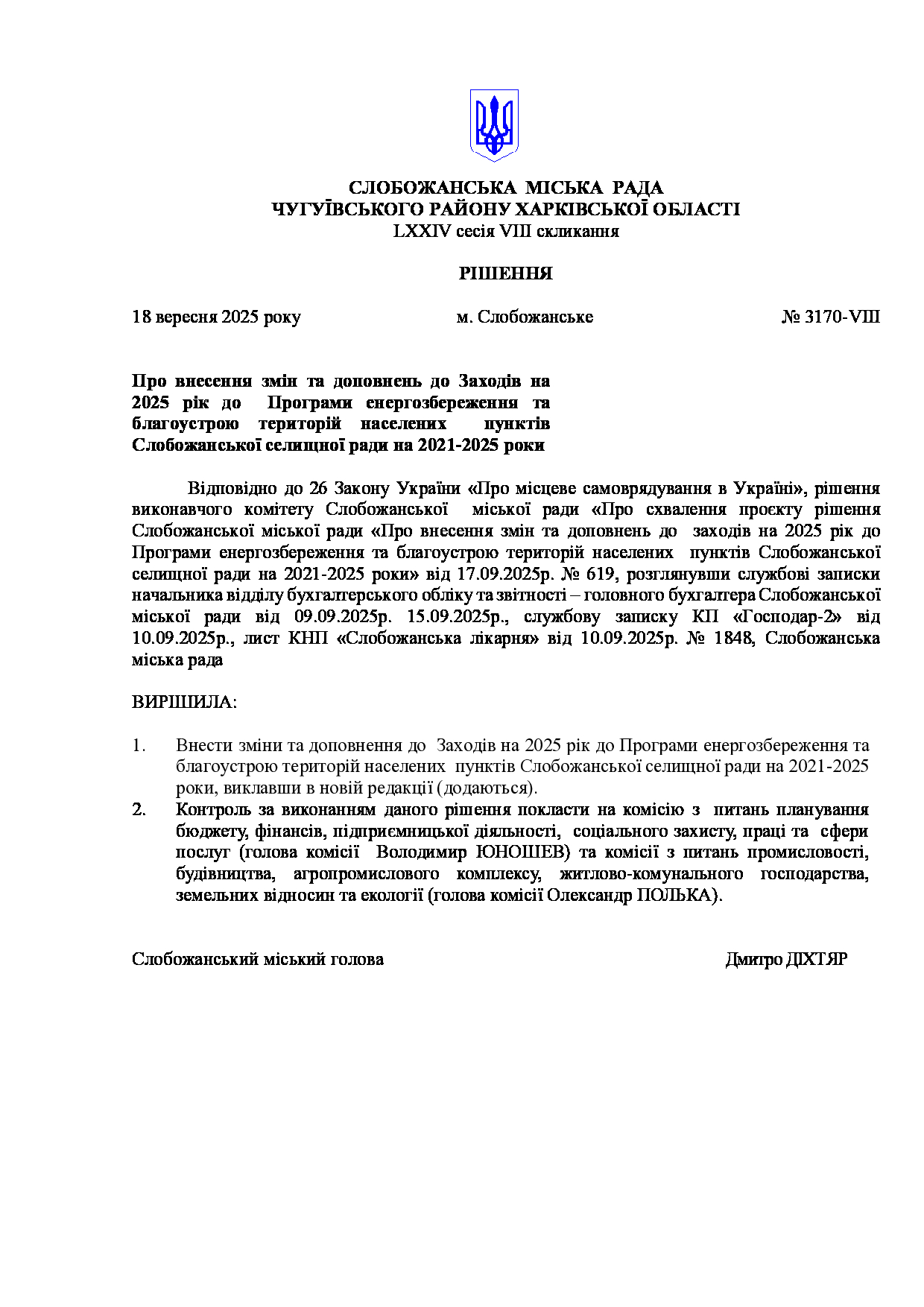 Текст рішення сесії №3170 Про внесення змін та доповнень до Заходів на 2025 рік до Програми енергозбереження та благоустрою територій населених пунктів Слобожанської селищної ради на 2021-2025 роки.