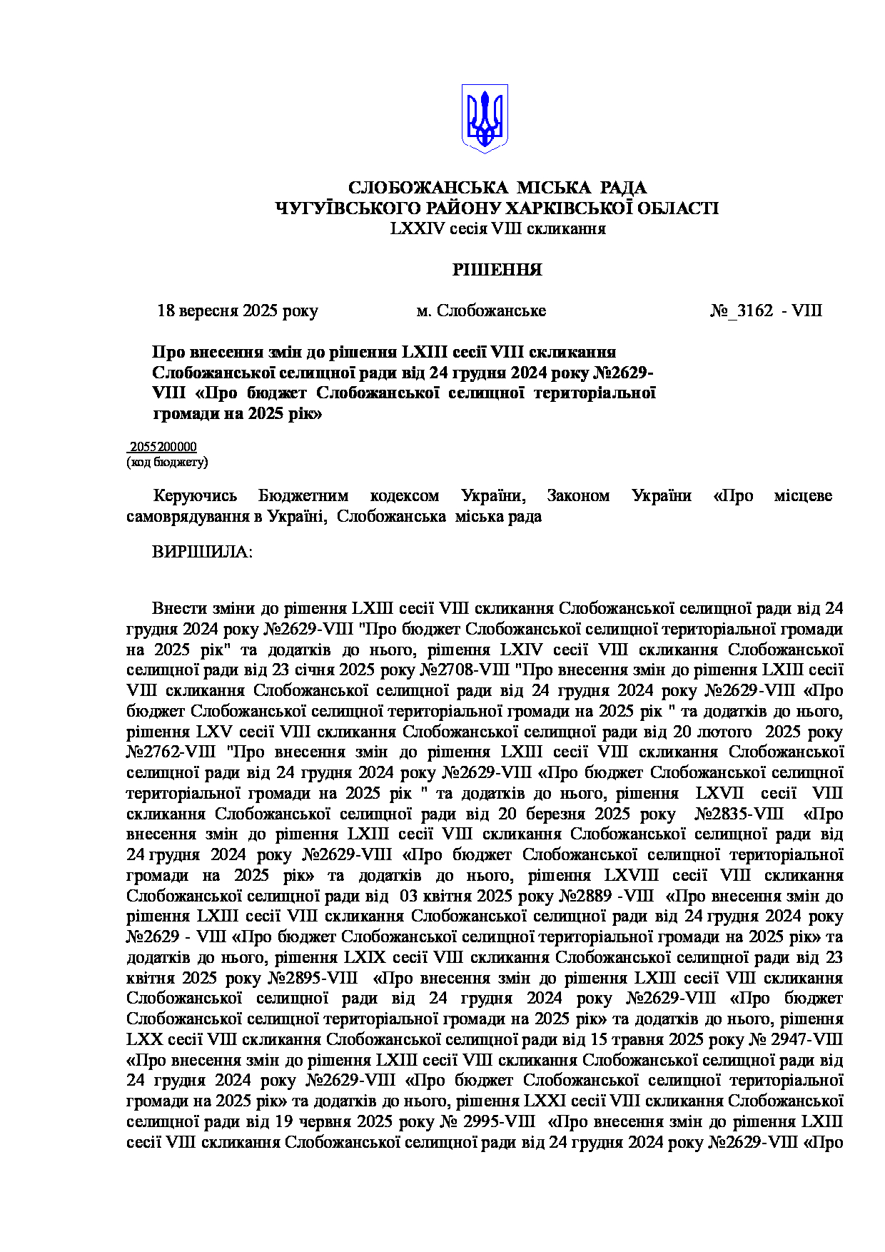 Текст рішення сесії №3162 Про внесення змін до рішення LXIII сесії VIII скликання Слобожанської селищної ради від 24 грудня 2024 року №2629-VIII «Про бюджет Слобожанської селищної територіальної громади на 2025 рік».