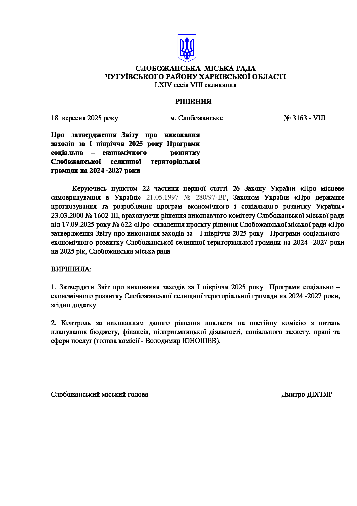Текст рішення сесії №3163 Про затвердження Звіту про виконання заходів за I півріччя 2025 року Програми соціально – економічного розвитку Слобожанської селищної територіальної громади на 2024 -2027 роки.