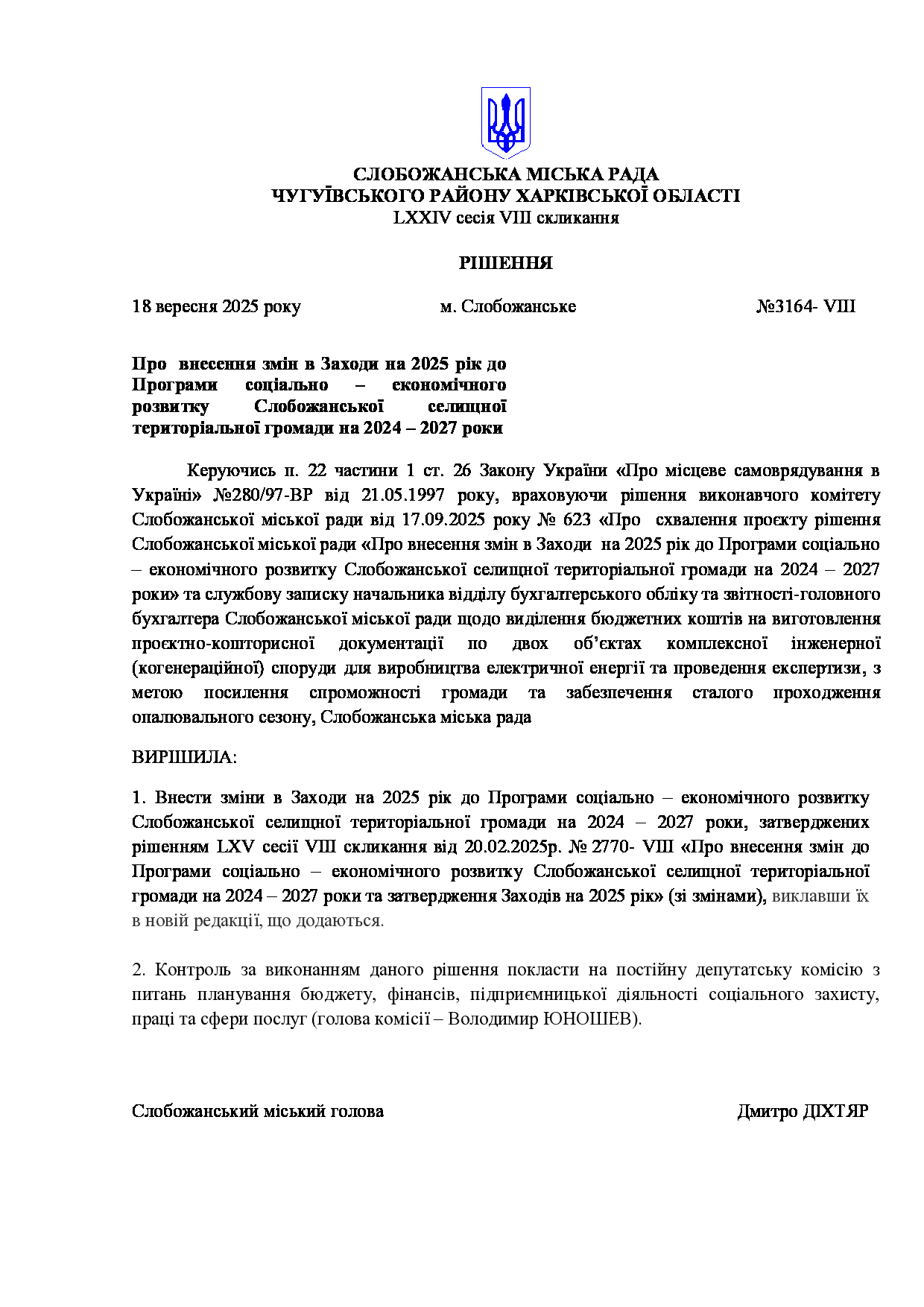 Текст рішення сесії №3164 Про внесення змін в Заходи на 2025 рік до Програми соціально – економічного розвитку Слобожанської селищної територіальної громади на 2024 – 2027 роки.