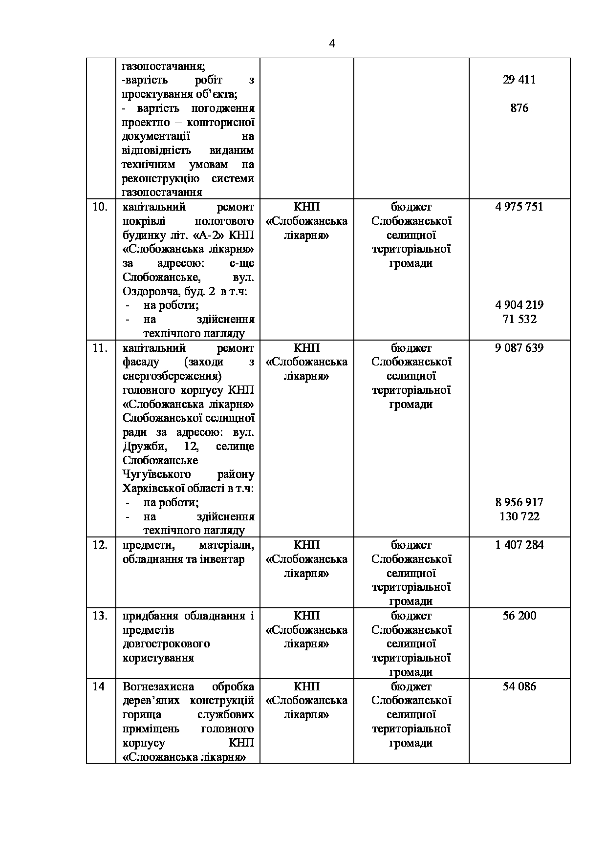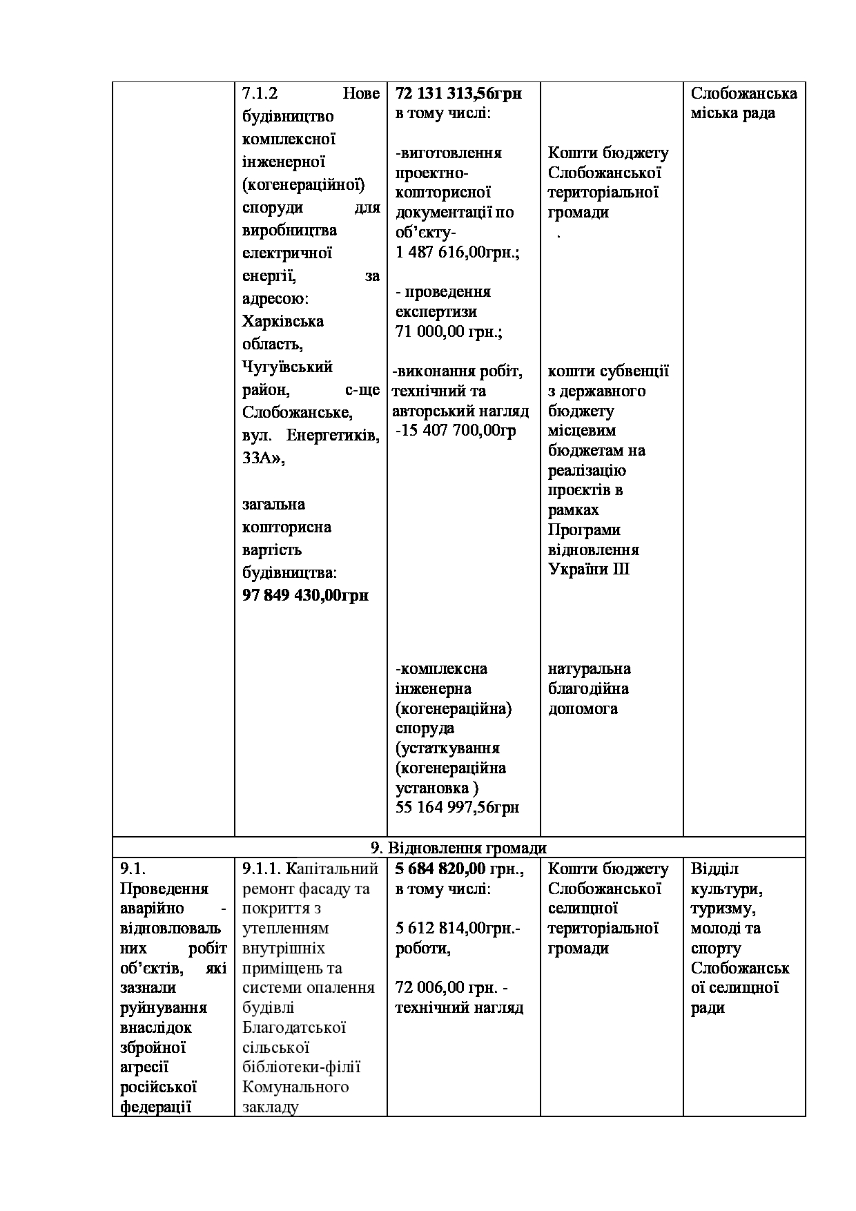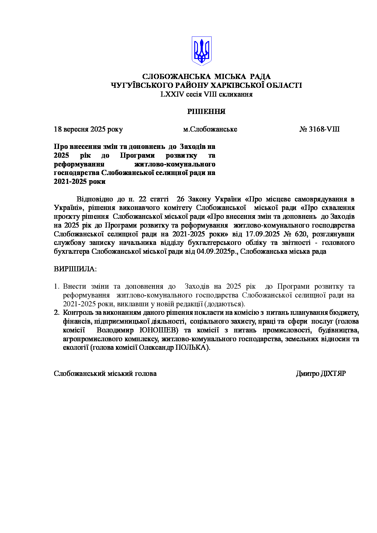 Текст рішення сесії №3168 Про внесення змін та доповнень до Заходів на 2025 рік до Програми розвитку та реформування житлово-комунального господарства Слобожанської селищної ради на 2021-2025 роки.