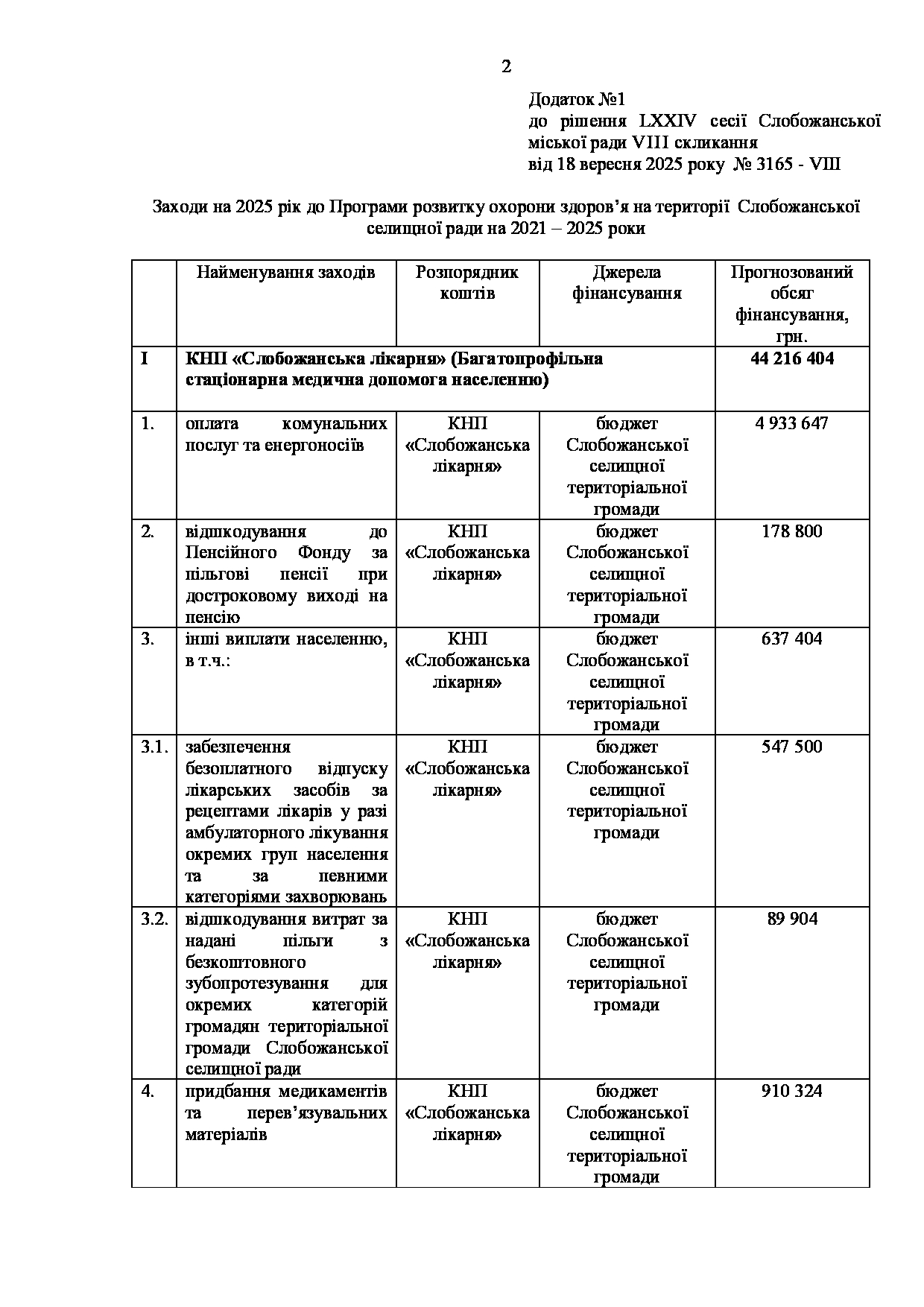 Текст рішення сесії №3165 Про внесення змін та доповнень до Заходів на 2025 рік до Програми розвитку охорони здоров’я на території Слобожанської селищної ради на 2021 - 2025 роки.