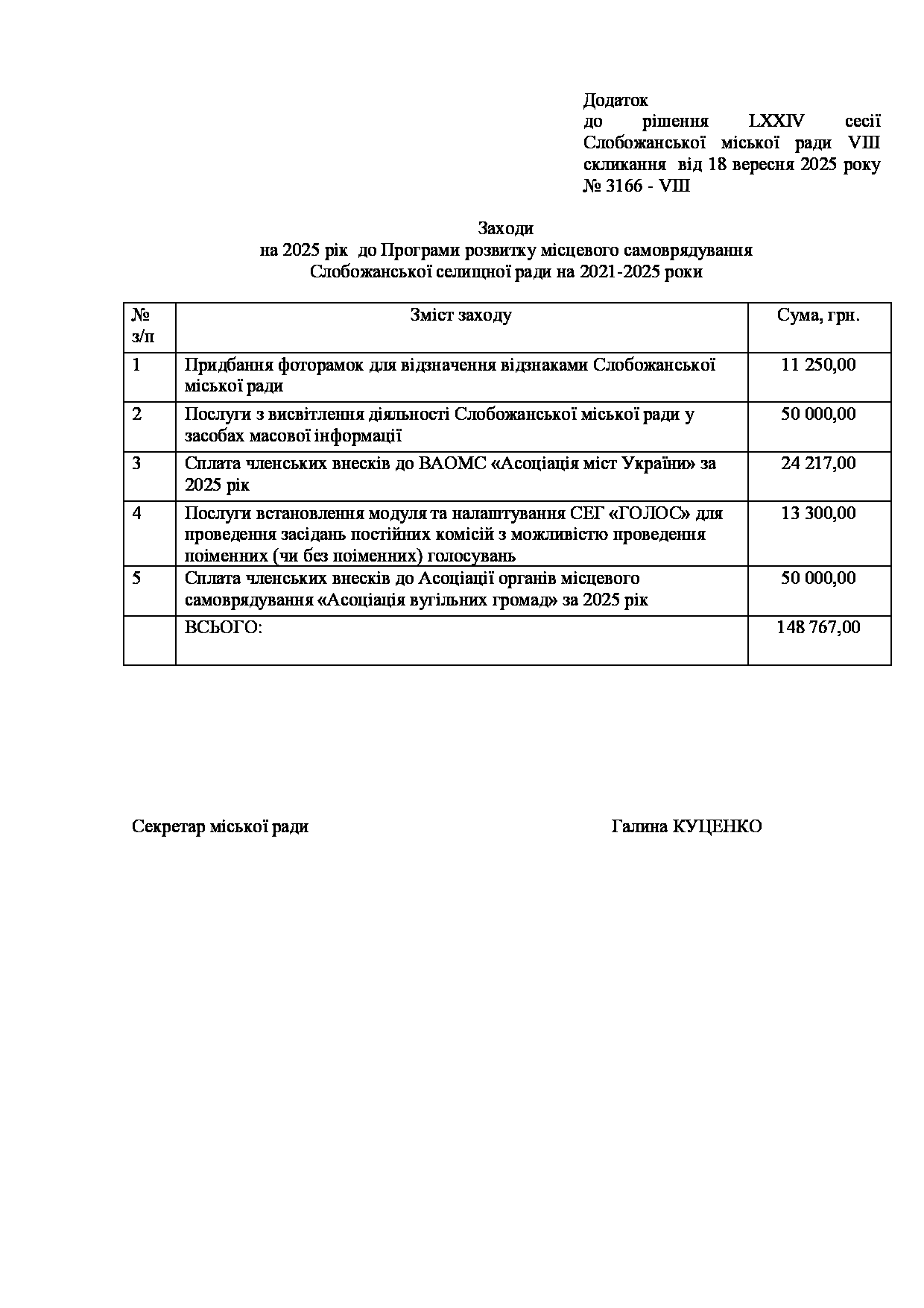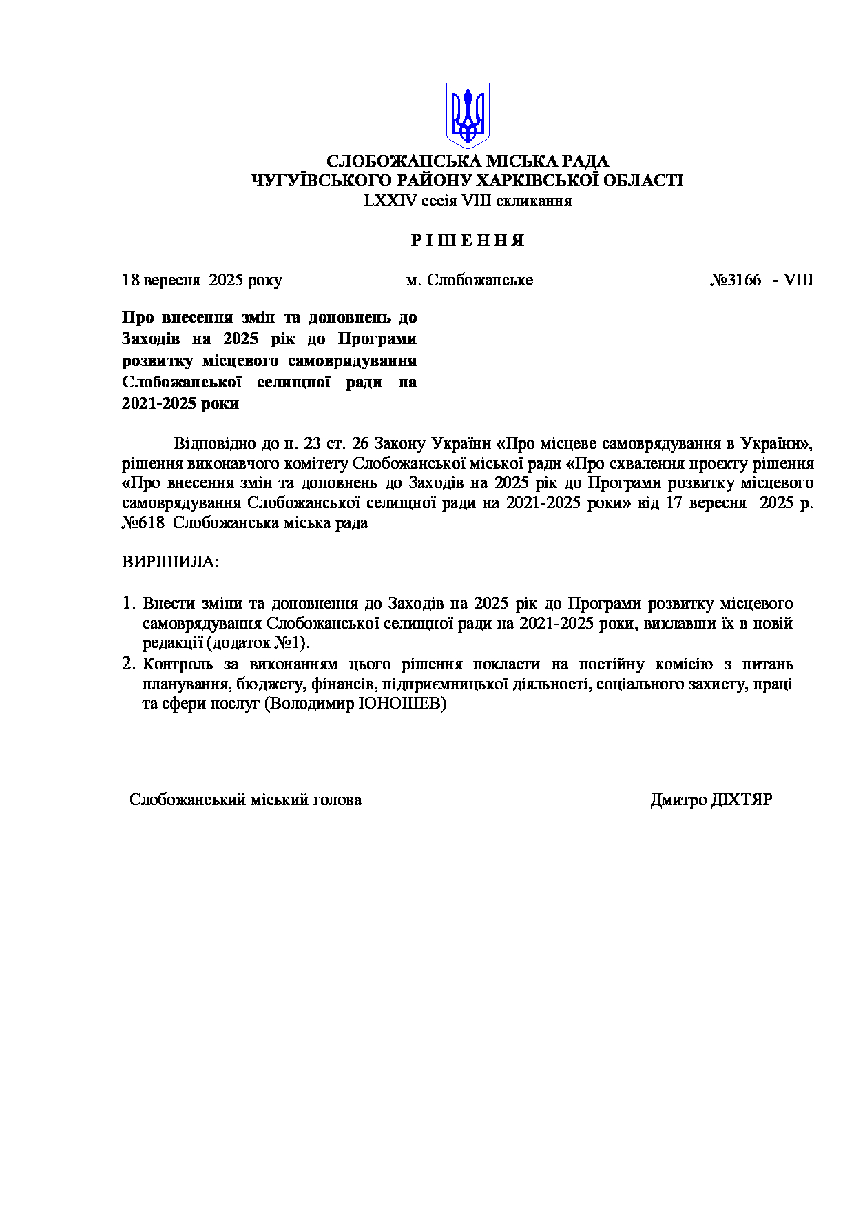 Текст рішення сесії №3166 Про внесення змін та доповнень до Заходів на 2025 рік до Програми розвитку місцевого самоврядування Слобожанської селищної ради на 2021-2025 роки.