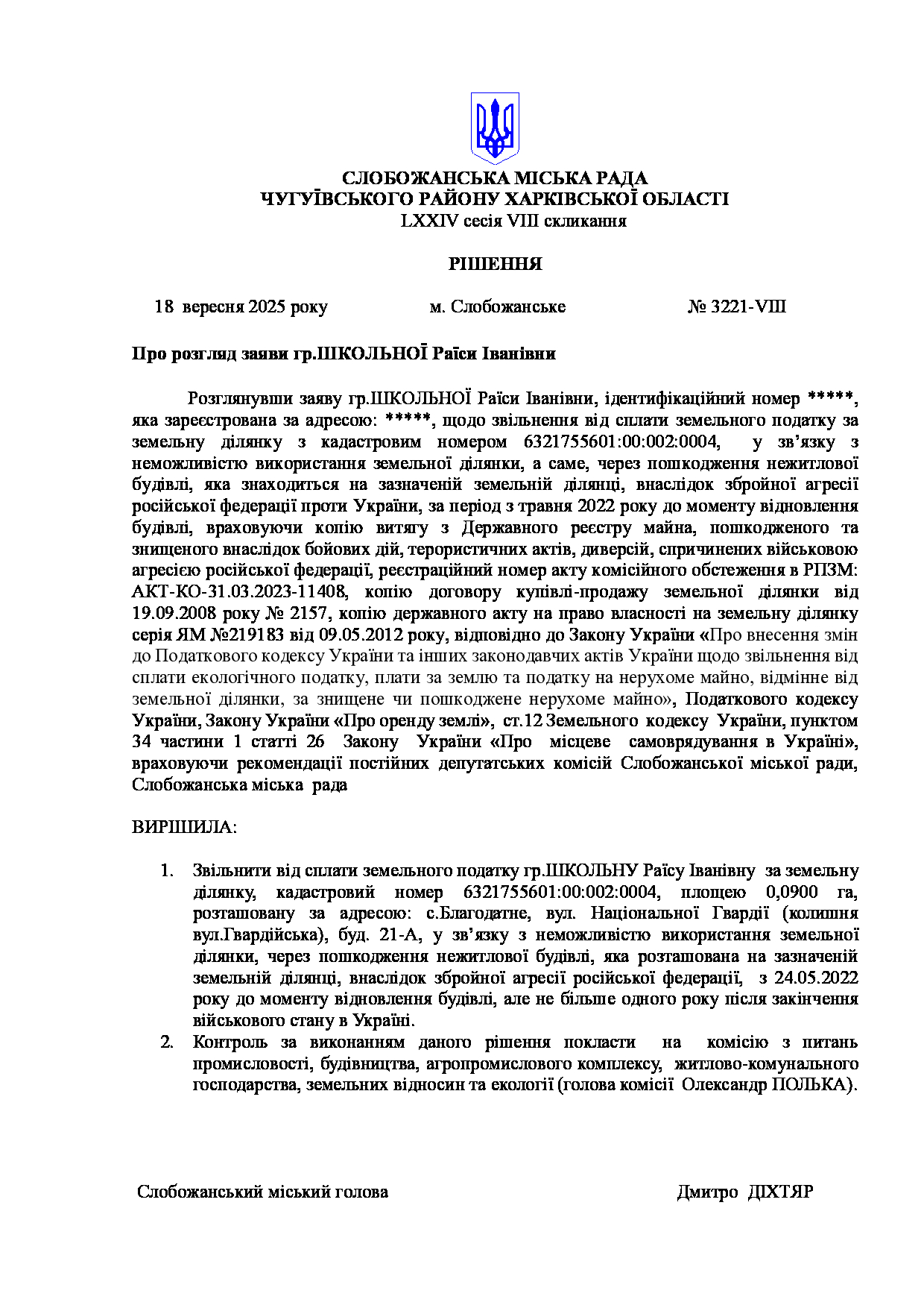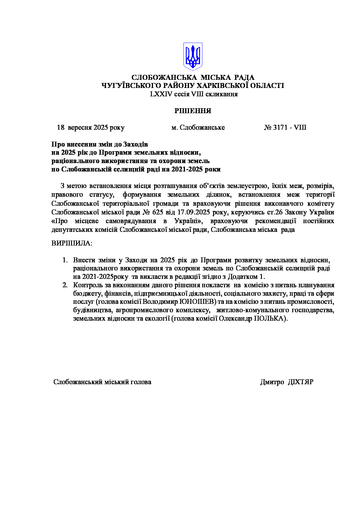 Текст рішення сесії №3171 Про внесення змін до Заходів на 2025 рік до Програми земельних відносин, раціонального використання та охорони земель по Слобожанській селищній раді на 2021-2025 роки.