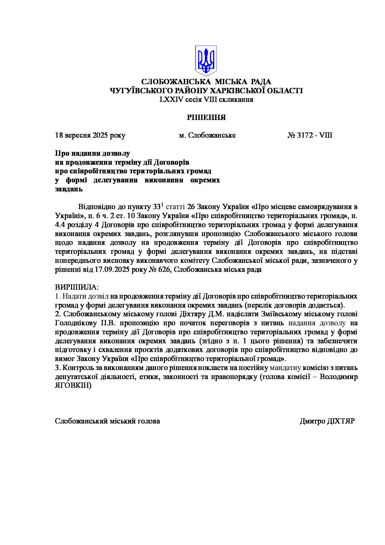 Текст рішення сесії №3172 Про надання дозволу на продовження терміну дії Договорів про співробітництво територіальних громад у формі делегування виконання окремих завдань.