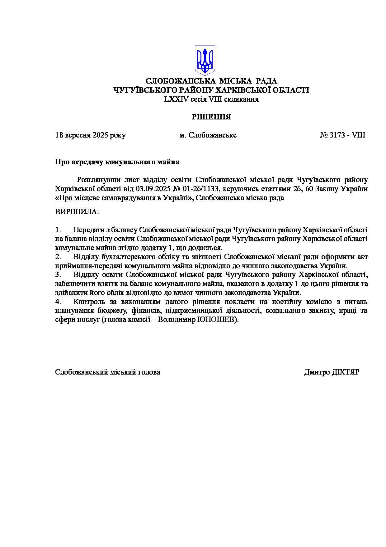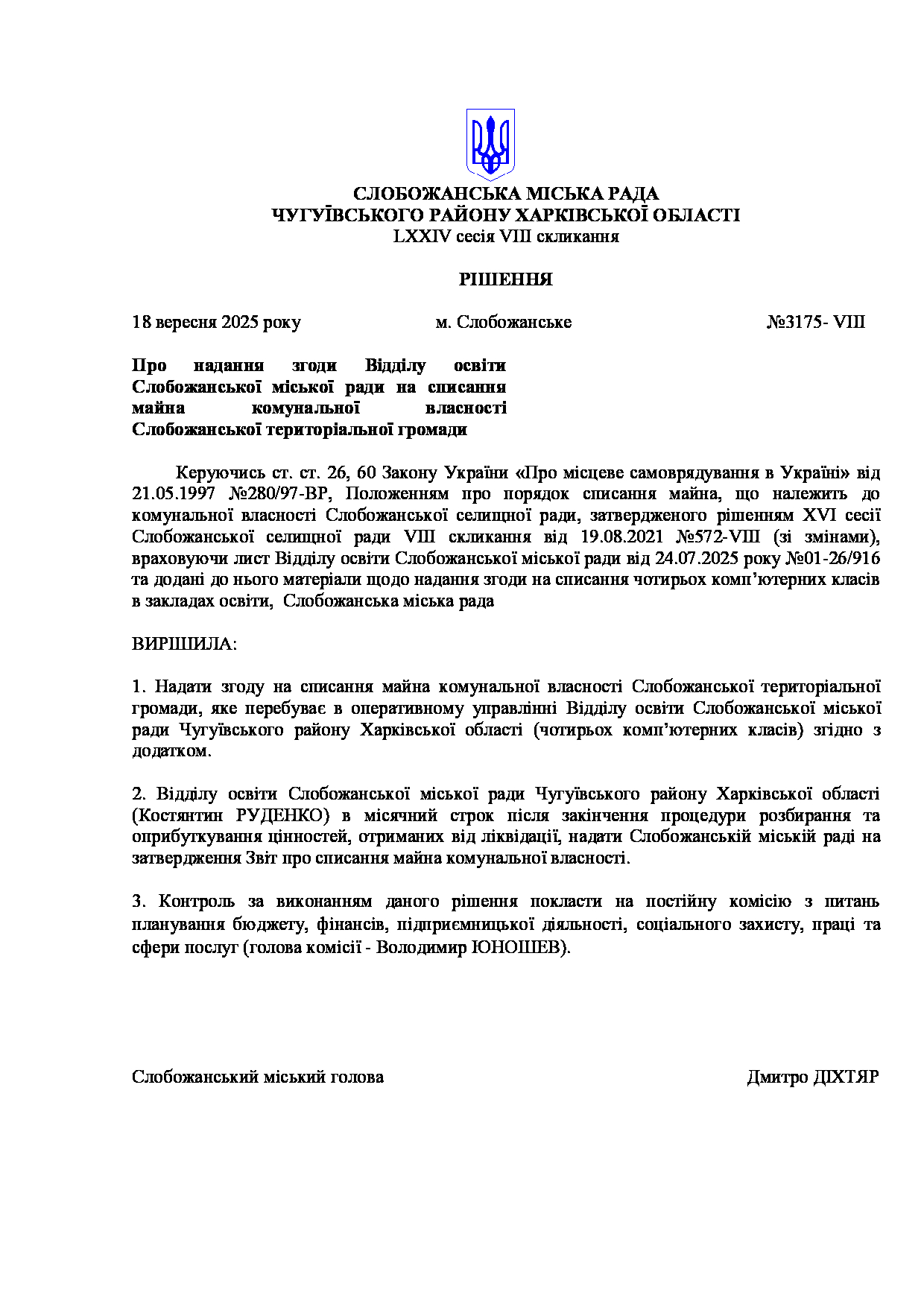 Текст рішення сесії №3175 Про надання згоди Відділу освіти Слобожанської міської ради на списання майна комунальної власності Слобожанської територіальної громади.