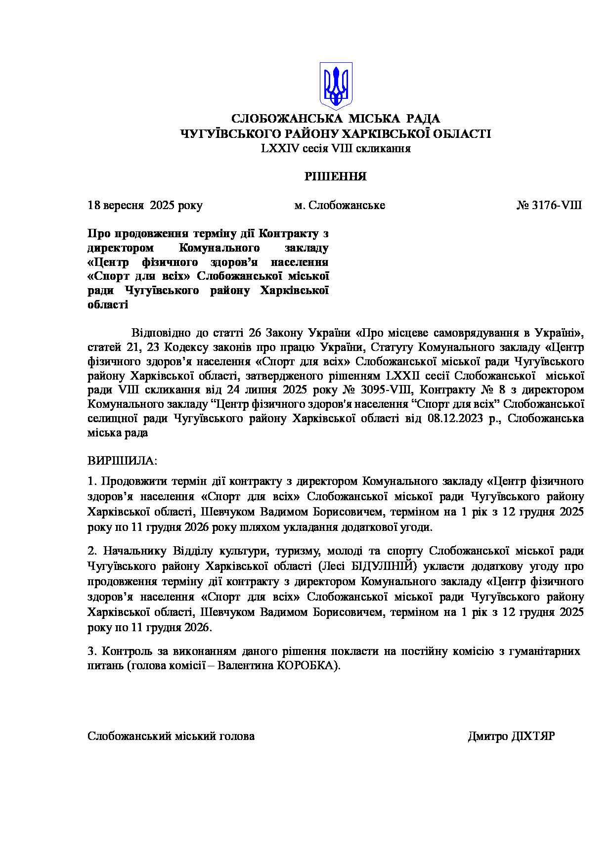 Текст рішення сесії №3176 Про продовження терміну дії Контракту з директором Комунального закладу «Центр фізичного здоров’я населення «Спорт для всіх» Слобожанської міської ради Чугуївського району Харківської області.