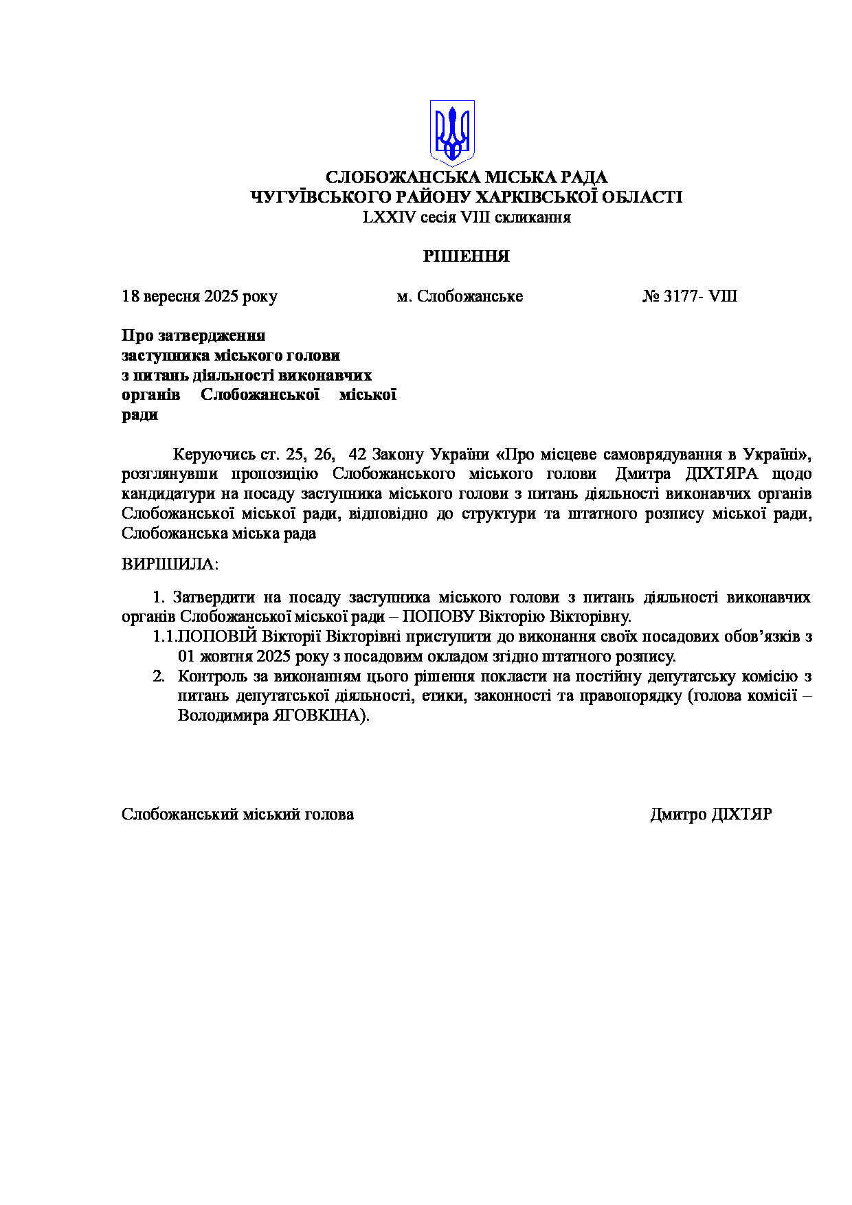 Текст рішення сесії №3177 Про затвердження заступника міського голови з питань діяльності виконавчих органів Слобожанської міської ради.