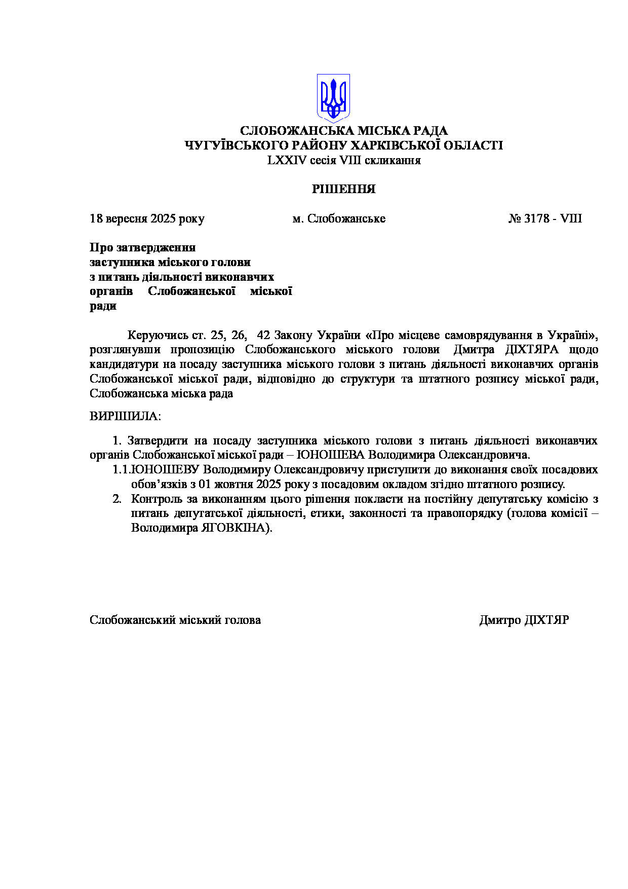 Текст рішення сесії №3178 Про затвердження заступника міського голови з питань діяльності виконавчих органів Слобожанської міської ради.