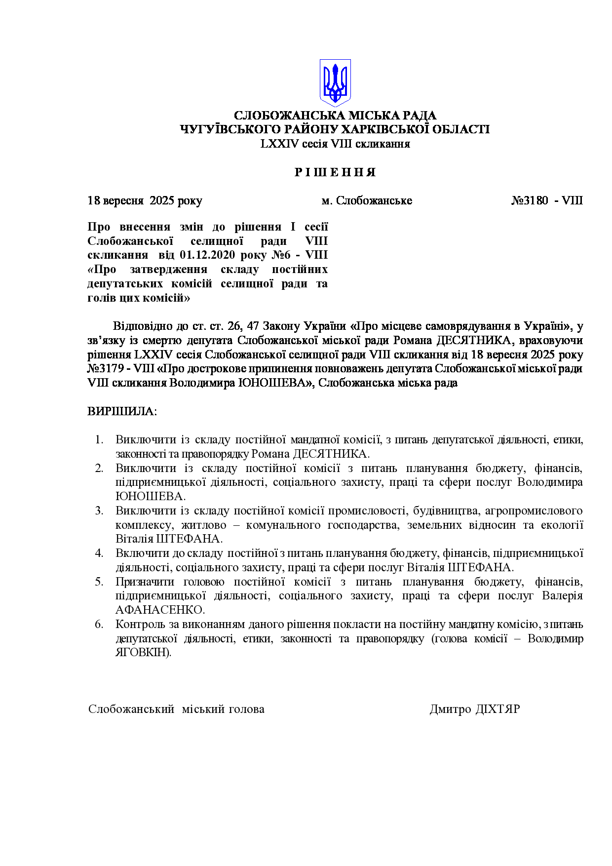 Текст рішення сесії №3180 Про внесення змін до рішення І сесії Слобожанської селищної ради VІІI скликання від 01.12.2020 року №6 - VІІI «Про затвердження складу постійних депутатських комісій селищної ради та голів цих комісій».