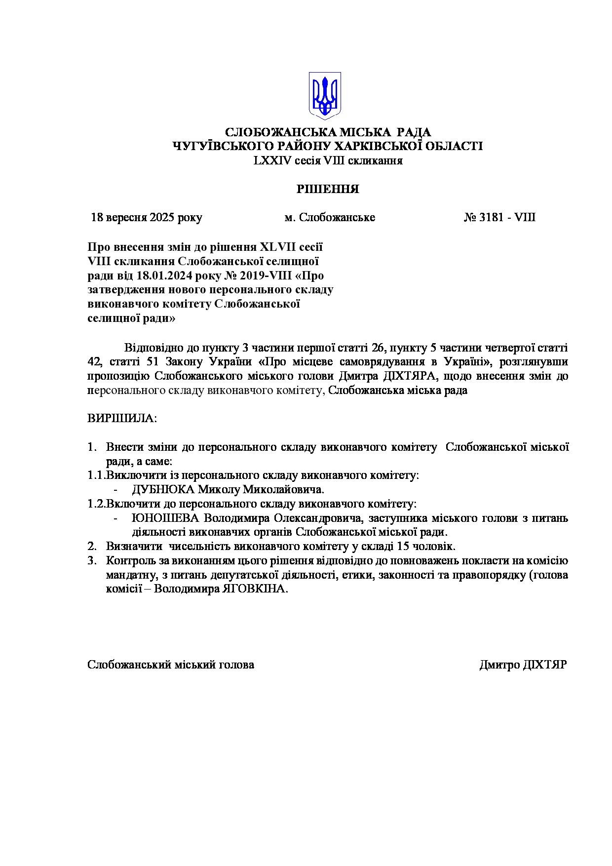 Текст рішення сесії №3181 Про внесення змін до рішення XLVII сесії VІІІ скликання Слобожанської селищної ради від 18.01.2024 року № 2019-VІІІ «Про затвердження нового персонального складу виконавчого комітету Слобожанської селищної ради».