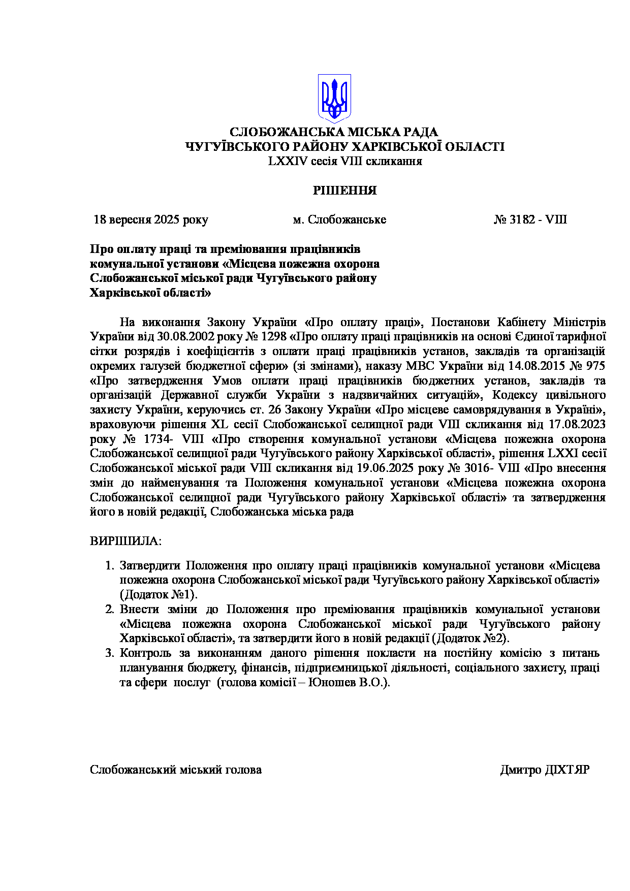 Текст рішення сесії №3182 Про оплату праці та преміювання працівників комунальної установи «Місцева пожежна охорона Слобожанської міської ради Чугуївського району Харківської області».