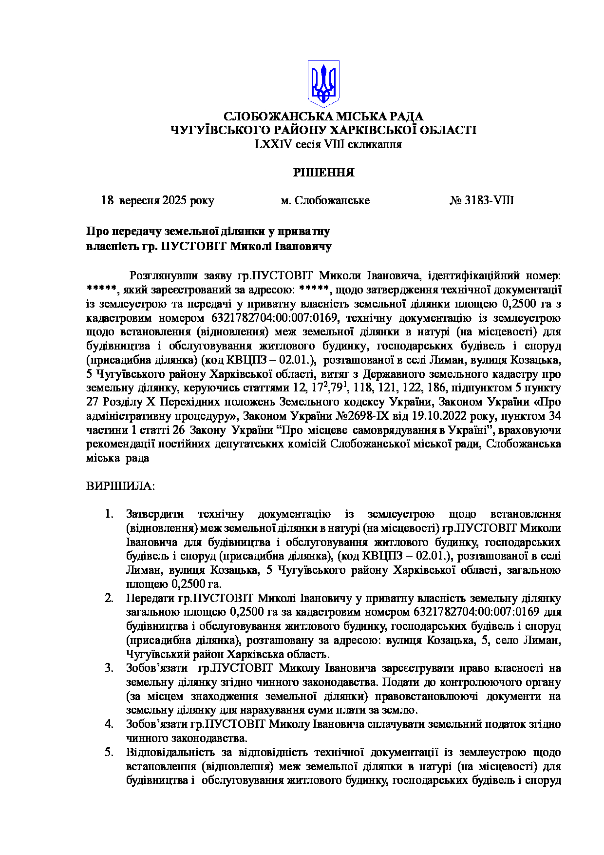Текст рішення сесії №3183 Про передачу земельної ділянки у приватну власність гр. ПУСТОВІТ Миколі Івановичу.