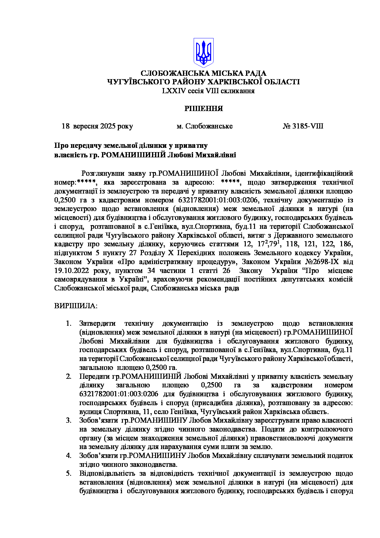 Текст рішення сесії №3185 Про передачу земельної ділянки у приватну власність гр. РОМАНИШИНІЙ Любові Михайлівні.