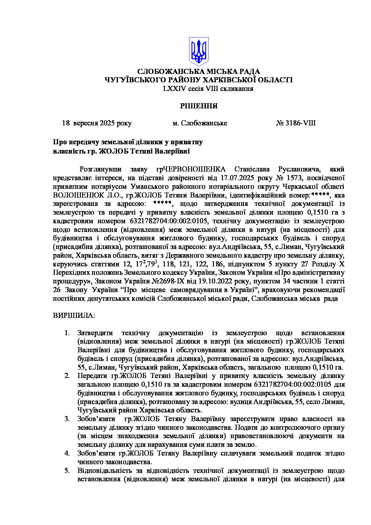 Текст рішення сесії №3186 Про передачу земельної ділянки у приватну власність гр. ЖОЛОБ Тетяні Валеріївні.